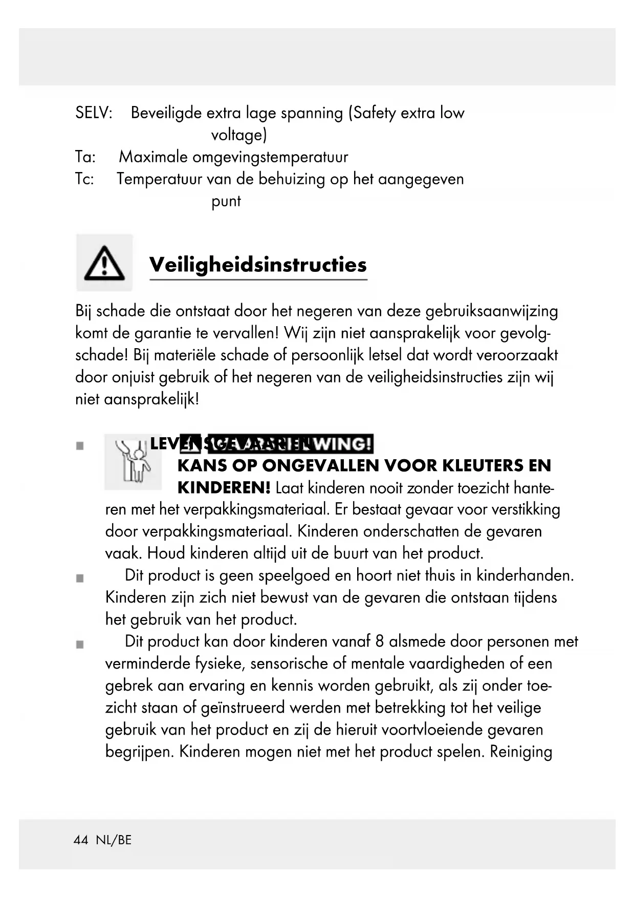 Nominale spanning primair: 220–240 V∼, 50 / 60 Hz Nominale spanning secundair: 30 V , 3,6 W Beschermingsgraad: IP44 (spatwaterdicht) Beschermingsniveau: Netadapter (model-nr. S036G300W8D) GS-gecertificeerd.44 NL/BE SELV: Beveiligde extra lage spanning (Safety extra low voltage) Ta: Maximale omgevingstemperatuur Tc: Temperatuur van de behuizing op het aangegeven punt Veiligheidsinstructies Bij schade die ontstaat door het negeren van deze gebruiksaanwijzing komt de garantie te vervallen! Wij zijn niet aansprakelijk voor gevolg- schade! Bij materiële schade of persoonlijk letsel dat wordt veroorzaakt door onjuist gebruik of het negeren van de veiligheidsinstructies zijn wij niet aansprakelijk! LEVENSGEVAAR EN