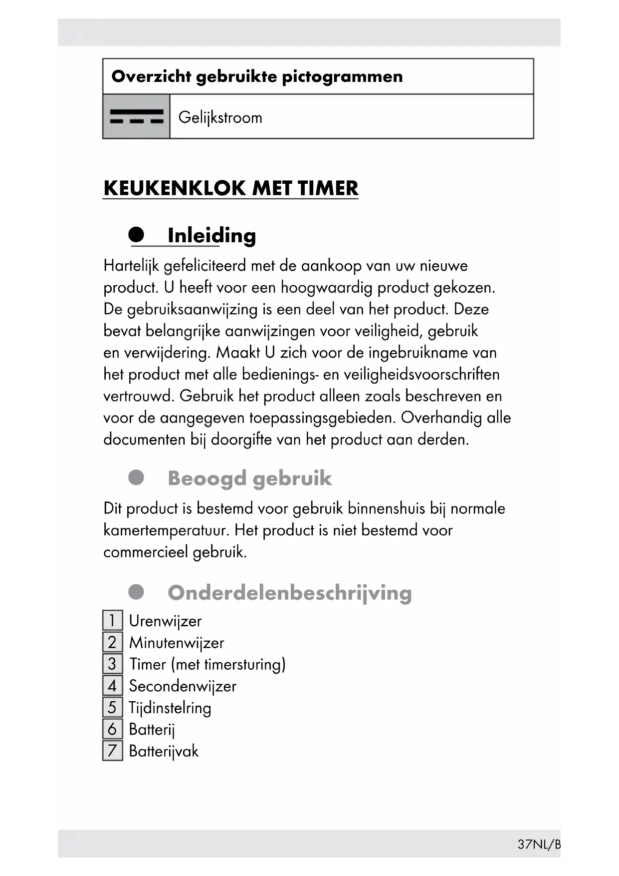 Inleiding Hartelijk gefeliciteerd met de aankoop van uw nieuwe product. U heeft voor een hoogwaardig product gekozen. De gebruiksaanwijzing is een deel van het product. Deze bevat belangrijke aanwijzingen voor veiligheid, gebruik en verwijdering. Maakt U zich voor de ingebruikname van het product met alle bedienings- en veiligheidsvoorschriften vertrouwd. Gebruik het product alleen zoals beschreven en voor de aangegeven toepassingsgebieden. Overhandig alle documenten bij doorgifte van het product aan derden. Beoogd gebruik Dit product is bestemd voor gebruik binnenshuis bij normale kamertemperatuur. Het product is niet bestemd voor commercieel gebruik. Onderdelenbeschrijving