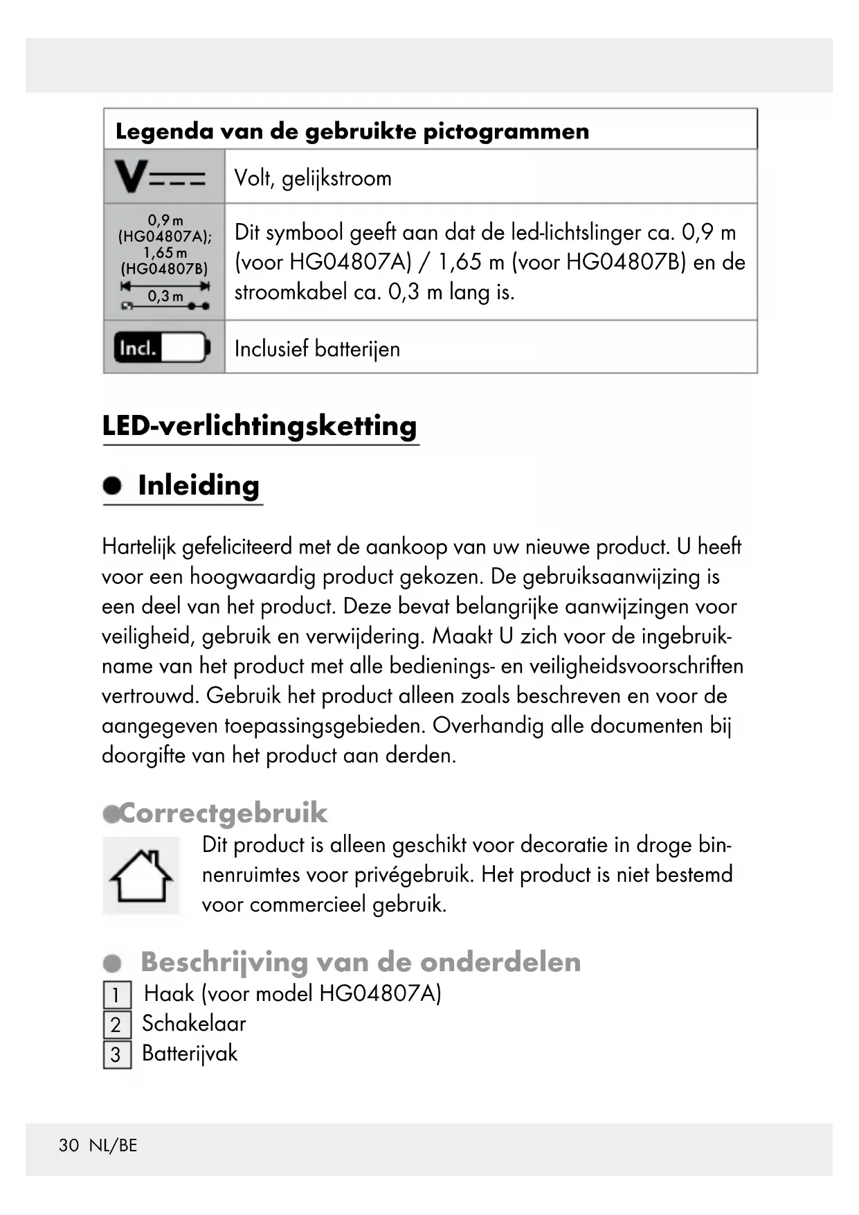 Lichtslinger Technische gegevens Led: 8 x 0,06 W voor HG04807A 10 x 0,06 W voor HG04807B Batterijtype: 3 x 1,5 V AA batterij Omvang van de levering 1 LED-verlichtingsketting 3 batterijen 1 gebruiksaanwijzing Veiligheidsinstructies