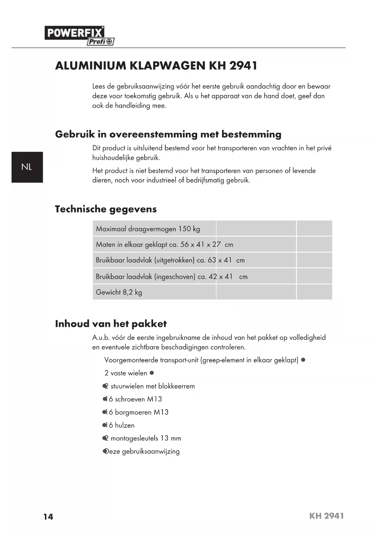 Controleer de klapwagen voor ieder gebruik op perfecte toestand. Indien er schade worden geconstateerd, mag de klapwagen Niet meer worden gebruikt.