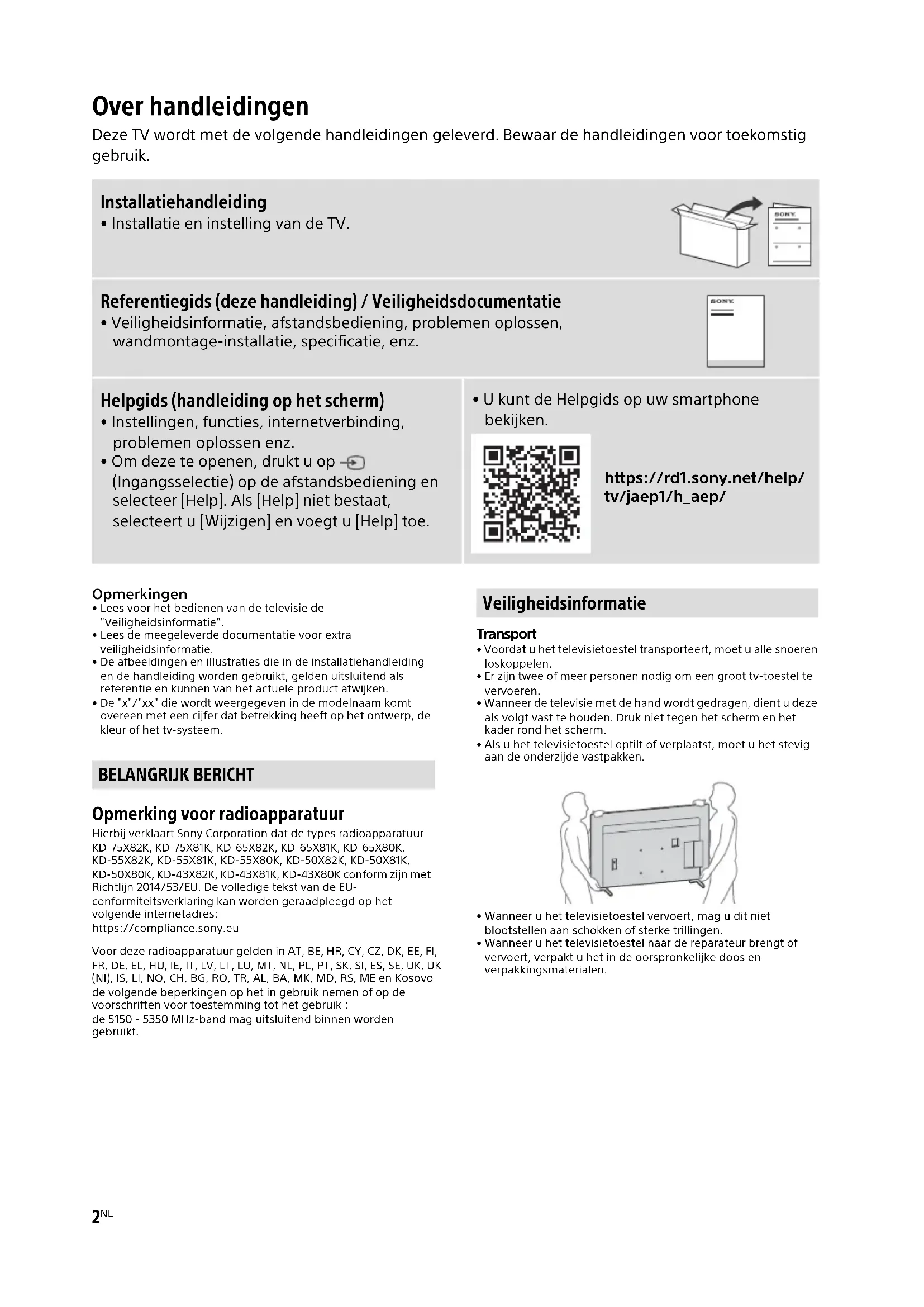 - De "x"/"xx" die wordt weergegeven in de modelnaam komt overeen met een cijfer dat betrekking heeft op het ontwerp, de kleur of het tv-systeem. Opmerking voor radioapparatuur Hierbij verklaart Sony Corporation dat de types radioapparatuur KD-75X82K, KD-75X81K, KD-65X82K, KD-65X81K, KD-65X80K, KD-55X82K, KD-55X81K, KD-55X80K, KD-50X82K, KD-50X81K, KD-50X80K, KD-43X82K, KD-43X81K, KD-43X80K conform zijn met Richtlijn 2014/53/EU. De volledige tekst van de EU- conformiteitsverklaring kan worden geraadpleegd op het volgende internetadres: https://compliance.sony.eu Voor deze radioapparatuur gelden in AT, BE, HR, CY, CZ, DK, EE, FI, FR, DE, EL, HU, IE, IT, LV, LT, LU, MT, NL, PL, PT, SK, SI, ES, SE, UK, UK (NI), IS, LI, NO, CH, BG, RO, TR, AL, BA, MK, MD, RS, ME en Kosovo de volgende beperkingen op het in gebruik nemen of op de voorschriften voor toestemming tot het gebruik : de 5150 - 5350 MHz-band mag uitsluitend binnen worden gebruikt. Transport