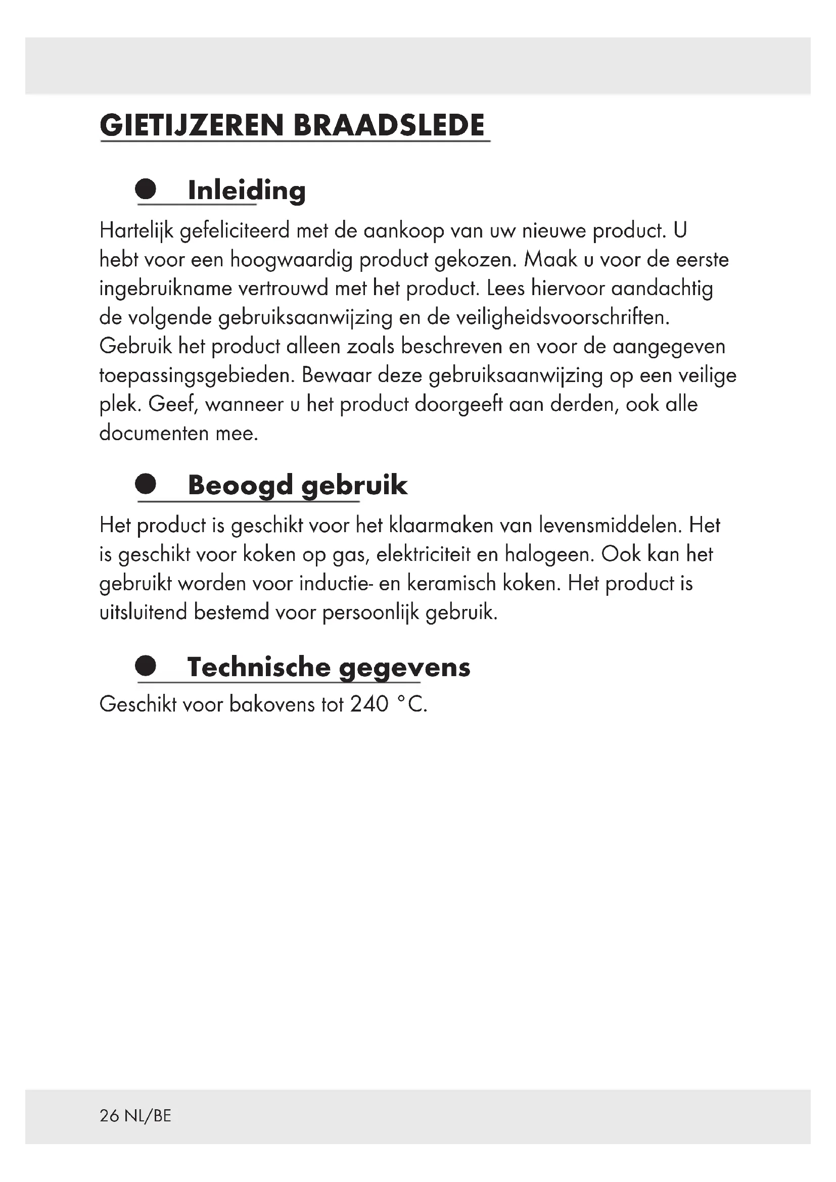 GESCHIKT VOOR LEVENSMIDDELEN! Smaak- en reukeigenschappen worden niet door dit product beïnvloed. Gebruik Kook het product vóór het eerste gebruik 2 of 3 maal met water uit om eventuele achtergebleven resten van het productieproces te verwijderen. Maak het product dan schoon met een warm sopje, spoel het vervolgens af met schoon water en droog het dan goed af. Wrijf de binnenkant van het product dan in met wat boter of een beetje olie. Verwarm het product dan een beetje. Verlaag de temperatuur zodra het vet ingetrokken is. Wacht ongeveer 2 tot 3 minuten tot het product is afgekoeld en verwijder dan het overtollige vet. Gebruik bij het koken of braden geen hoge temperaturen. Omdat het gietijzer warmte goed vasthoudt, zijn niet al te hoge temperaturen meer dan voldoende. Te hoge temperaturen kunnen anders leiden tot slechte kookresultaten of tot het aankoeken van eten zoals bijv. bij gebakken eieren. Zorg ervoor dat u het product niet te snel verhit. Het emaille kan mogelijk versplinteren als het gietijzer sneller uitzet dan het emaille.29NL/BE Tip: De lichte emaillen binnenkant is speciaal geschikt voor het langzaam klaarmaken van spijzen bij uiterst lage temperaturen of in de oven bij een gemiddelde temperatuur. Door de bobbels op de onderkant van het deksel ontstaat bij het koken een kringloop binnenin het kookgerei. De opstijgende waterdamp condenseert op het deksel en wordt door de nopjes gelijkmatig over de gaar te koken gerechten verdeeld. Daardoor zijn de gaargekookte spijzen na het koken sappig en hebben ze hun natuurlijke smaak behouden. Het emaillen oppervlak is niet geschikt voor droog koken. Gebruik altijd een beetje boter of olie en zorg ervoor dat de bodem volledig bedekt is voordat u het kookgerei gaat verwarmen. Tip voor inductiekookplaten Kies de grootte van de kookplaat zo dat deze overeenkomt met de diameter van de onderkant van het product om zo hitteverlies te voorkomen. Tip: Onder bepaalde omstandigheden kunt u een geluid horen dat een gevolg is van de elektromagnetische eigenschappen van de warmtebron en van het product. Dit is normaal en zijn niet het gevolg van een defect van uw inductieplaat of van het product. Plaats het product midden op de kookplaat. OPGELET! Product warmt snel op! Pan bij voorverwarmen niet oververhitten. Raakt de pan toch oververhit, ventileer de ruimte dan goed.30 NL/BE Reiniging en onderhoud Laat het product altijd eerst een beetje afkoelen voordat u het schoon gaat maken. Dompel het product nooit onder in koud water als het heet is. Door de plotselinge temperatuurverandering kan het emaille beschadigd worden. Vul het product evenmin met koud water. Spoel het product af met heet water en een normaal verkrijgbaar afwasmiddel. Week vastzittende voedselresten eerst een tijdje en verwijder ze dan met bijv. een houten schraper, een spons of een borstel. Gebruik nooit harde objecten, staalwol en / of agressieve dan wel schurende schoonmaakmiddelen zoals een gechloreerd bleekmiddel, omdat deze het emaille kunnen beschadigen. Droog het product na het schoonmaken goed af. Wrijf de rand van het product af en toe in met een beetje slaolie om roestsporen, die in de loop der tijd kunnen ontstaan, te voorkomen. Bewaar het product op een droge en goedgeventileerde plaats.