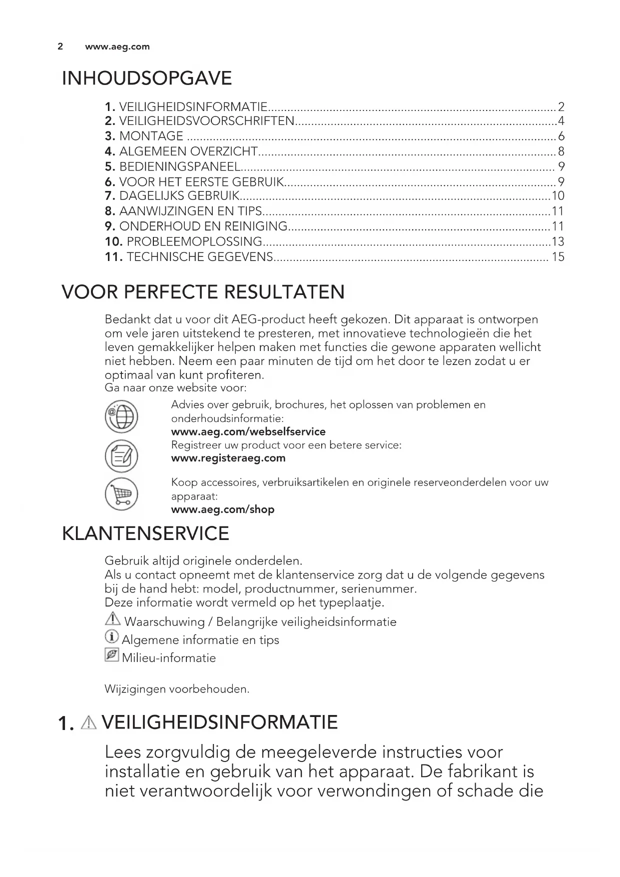 Bedankt dat u voor dit AEG-product heeft gekozen. Dit apparaat is ontworpen om vele jaren uitstekend te presteren, met innovatieve technologieën die het leven gemakkelijker helpen maken met functies die gewone apparaten wellicht niet hebben. Neem een paar minuten de tijd om het door te lezen zodat u er optimaal van kunt profiteren. Ga naar onze website voor: Advies over gebruik, brochures, het oplossen van problemen en onderhoudsinformatie: www.aeg.com/webselfservice Registreer uw product voor een betere service: www.registeraeg.com Koop accessoires, verbruiksartikelen en originele reserveonderdelen voor uw apparaat: www.aeg.com/shop KLANTENSERVICE Gebruik altijd originele onderdelen. Als u contact opneemt met de klantenservice zorg dat u de volgende gegevens bij de hand hebt: model, productnummer, serienummer. Deze informatie wordt vermeld op het typeplaatje. Waarschuwing / Belangrijke veiligheidsinformatie Algemene informatie en tips Milieu-informatie Wijzigingen voorbehouden.