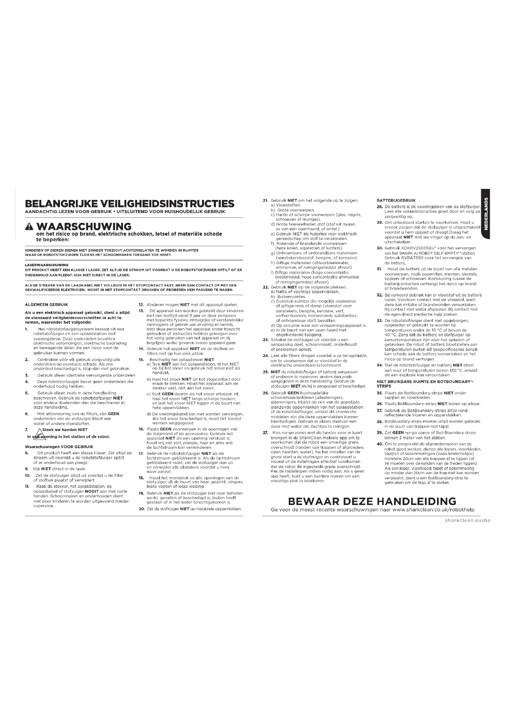 robot goed werken, dienen alle lopers, vloerkleden, tapijten of belemmeringen (zoals kinderhekjes) minstens 20cm van alle trappen af te liggen (of ze moeten over de randen van de treden liggen). Als een loper, vloerkleed, tapijt of belemmering op minder dan 20cm van de trap niet kan worden verplaatst, dient u een BotBoundary-strip te gebruiken om de trap af te sluiten. KINDEREN OF DIEREN DIENEN NIET ZONDER TOEZICHT ACHTERGELATEN TE WORDEN IN RUIMTES WAAR DE ROBOTSTOFZUIGER TIJDENS HET SCHOONMAKEN TOEGANG TOE HEEFT.LASERWAARSCHUWINGDIT PRODUCT HEEFT EEN KLASSE 1 LASER. ZET ALTIJD DE STROOM UIT VOORDAT U DE ROBOTSTOFZUIGER OPTILT OF ER ONDERHOUD AAN PLEEGT. KIJK NIET DIRECT IN DE LASER.