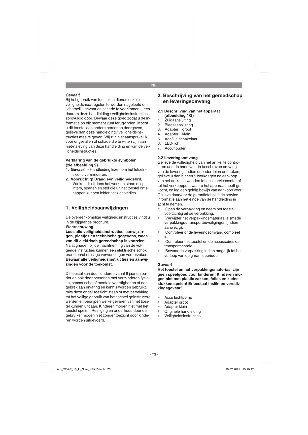 en de accupack op te sturen aan onze klantendienst. Voor een deskundige verzending verzoeken wij u contact op te nemen met onze klan- tendienst of het verkooppunt waar u het ap- paraat heeft aangekocht. Zorg er bij de verzending of verwerking van accu’s resp. het accu apparaat voor dat deze afzonderlijk worden verpakt in plastic zakken, om kortsluitingen en brand te vermijden! In het belang van een lange levensduur van de accupack is het raadzaam om op tijd voor het herladen van de accupack te zorgen. Dit is in elk geval noodzakelijk, wanneer u vaststelt dat het vermogen van het apparaat afneemt. Ontlaad de accupack nooit helemaal. Dat leidt tot een defect van de accupack!