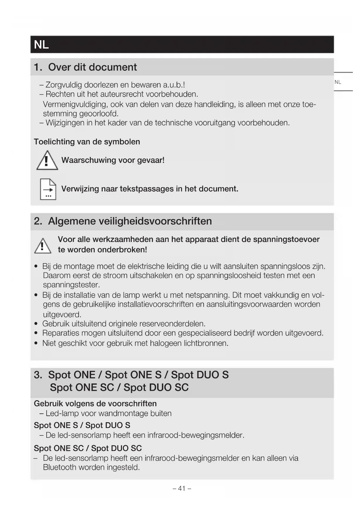 Spot ONESC / Spot DUO SC Gebruik volgens de voorschriften – Led-lamp voor wandmontage buiten Spot ONES / Spot DUOS – De led-sensorlamp heeft een infrarood-bewegingsmelder. Spot ONESC / Spot DUOSC – De led-sensorlamp heeft een infrarood-bewegingsmelder en kan alleen via Bluetooth worden ingesteld. NL– 42 – Gebruik niet conform de voorschriften – De led-lamp kan niet worden gedimd. Niet dimbaar Bij de levering inbegrepen Spot ONE (Afb. 3.1) – Lamp – Drie schroeven – Drie pluggen – Drie afstandhouders Bij de levering inbegrepen Spot DUO (Afb. 3.2) – Lamp – Vier schroeven – Vier pluggen – Vier afstandhouders Afmetingen product Spot ONE (Afb. 3.3) Spot DUO (Afb. 3.4) Productoverzicht (Afb. 3.5) A Wandhouder B Aansluitklem C Borgschroef D Lampvoet E Lampbehuizing F Schemerinstelling (alleen Spot ONES / DUOS) G Tijdinstelling (alleen Spot ONES / DUOS) Registratiebereik Spot ONES / DUOS (Afb. 3.6 – 3.8) Lichtsterkteverdeling (Afb. 3.9)