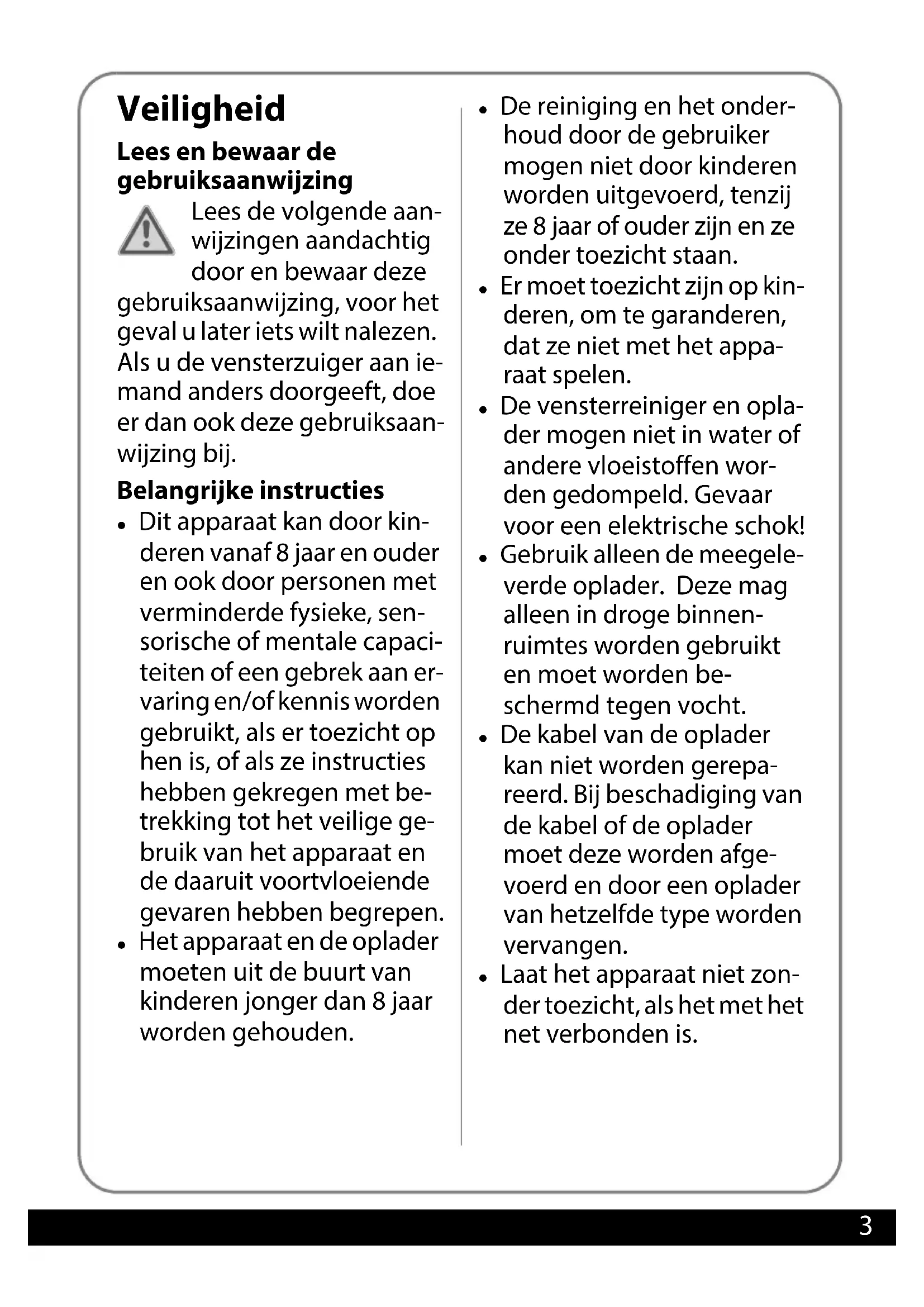 - Conformiteitsverklaring Levering z Accu-vensterreinigingsapparaatz Opladerz Spuitflesz Microvezelovertrek (2x)z Gebruiksaanwijzingz Garantiebewijs Druckbuch Fensterreiniger BEL QUIGG.book Seite 2 Dienstag, 15. November 2016 3:11 153 Veiligheid Lees en bewaar de gebruiksaanwijzing Lees de volgende aan- wijzingen aandachtig door en bewaar deze gebruiksaanwijzing, voor het geval u later iets wilt nalezen. Als u de vensterzuiger aan ie- mand anders doorgeeft, doe er dan ook deze gebruiksaan- wijzing bij. Belangrijke instructies z Dit apparaat kan door kin- deren vanaf 8 jaar en ouder en ook door personen met verminderde fysieke, sen- sorische of mentale capaci- teiten of een gebrek aan er- varing en/of kennis worden gebruikt, als er toezicht op hen is, of als ze instructies hebben gekregen met be- trekking tot het veilige ge- bruik van het apparaat en de daaruit voortvloeiende gevaren hebben begrepen. z Het apparaat en de oplader moeten uit de buurt van kinderen jonger dan 8 jaar worden gehouden. z De reiniging en het onder- houd door de gebruiker mogen niet door kinderen worden uitgevoerd, tenzij ze 8 jaar of ouder zijn en ze onder toezicht staan. z Er moet toezicht zijn op kin- deren, om te garanderen, dat ze niet met het appa- raat spelen. z De vensterreiniger en opla- der mogen niet in water of andere vloeistoffen wor- den gedompeld. Gevaar voor een elektrische schok! z Gebruik alleen de meegele- verde oplader. Deze mag alleen in droge binnen- ruimtes worden gebruikt en moet worden be- schermd tegen vocht. z De kabel van de oplader kan niet worden gerepa- reerd. Bij beschadiging van de kabel of de oplader moet deze worden afge- voerd en door een oplader van hetzelfde type worden vervangen. z Laat het apparaat niet zon- der toezicht, als het met het net verbonden is. Druckbuch Fensterreiniger BEL QUIGG.book Seite 3 Dienstag, 15. November 2016 3:11 154 z Gebruik het apparaat niet - als het gevallen is, - als er duidelijke beschadi- gingen zichtbaar zijn of -als het lek is. z Houd het apparaat uit de buurt van kinderen, als het ingeschakeld is of afkoelt. Gebruiksdoel z Dit apparaat dient voor de natte rei- niging van vensters en andere glad- de oppervlakken die daarvoor geschikt zijn. z Het apparaat is bedoeld voor privé- gebruik binnenshuis. Het is niet geschikt voor gebruik buiten en evenmin voor zakelijk gebruik. Gevaar voor kinderen z Houd verpakkingszakken en beschermfolies uit de buurt van baby's en peuters, er bestaat ver- stikkingsgevaar! Let er ook op, dat de zak van de verpakking niet over het hoofd wordt getrokken. Gevaar door elektriciteit z Let erop, dat u droge handen hebt en gebruik het apparaat niet in een vochtige omgeving of een omge- ving met hoge luchtvochtigheid. z Sluit de oplader aan op een naar behoren geïnstalleerd stopcontact, waarvan de spanning overeenkomt met de 'Technische specificaties'. z Gebruik uitsluitend de meegelever- de oplader om de accu van het apparaat op te laden. z Let erop, dat het stopcontact goed toegankelijk is, zodat u de oplader er zo nodig snel kunt uittrekken. z Wikkel de laadkabel voor het opla- den helemaal af. Let er daarbij op, dat deze niet door scherpe randen of hete voorwerpen beschadigd wordt. z Scheid de oplader van de venster- reiniger en trek de stekker van de oplader uit het stopcontact: – als de accu opgeladen is, – als er tijdens het laden kennelijk een storing optreedt ( bijv. een walm, geur etc.), – voordat u het apparaat schoon- maakt of wegbergt,- voordat u het apparaat schoonmaakt of wegzet, – bij onweer. Trek daarbij steeds aan de opla- der, niet aan het snoer. z Breng geen veranderingen aan aan het apparaat of de oplader, om risi- co's te vermijden. z Breng geen veranderingen aan aan het apparaat. Om risico's te vermij- den moet u het apparaat als het beschadigd is, door een vakwerk- plaats laten repareren. Let ook op de garantievoorwaarden. z Controleer het voor elk gebruik visueel. Als u schades opmerkt, mag u het apparaat pas weer gebruiken, als de schade door een vakwerk- plaats gerepareerd is. z Zet het apparaat niet in plassen of andere poelen vloeistof. Druckbuch Fensterreiniger BEL QUIGG.book Seite 4 Dienstag, 15. November 2016 3:11 155 Gevaar voor brand z Zuig met het apparaat geen bran- dende of gloeiende voorwerpen op zoals sigaretten, lucifers of gloeien- de as. z Gebruik het apparaat niet om licht ontvlambare of brandbare vloei- stoffen zoals benzine op te nemen. Gebruik het apparaat ook niet in ruimtes waarin zulke vloeistoffen zouden kunnen voorkomen. Gevaar voor letsels z Neem het apparaat niet in bedrijf als het kennelijk beschadigd is, er onderdelen los zitten of ontbreken of veiligheidsinrichtingen of andere onderdelen niet vlekkeloos functio- neren. z Breng geen veranderingen aan aan het apparaat. Laat reparaties uit- sluitend door een vakwerkplaats uitvoeren, om risico's te vermijden. z Bij verkeerd gebruik kan er vloeistof uit de accu's lopen. z Vermijd contact daarmee. z Bij toevallig contact met water afspoelen. Als de vloeistof in de ogen komt, dient u bovendien medische hulp in te roepen. Naar buiten lopende accuvloeistof kan leiden tot huidirritaties of verbran- dingen. z Zet het apparaat na het gebruik weg, om ongevallen te vermijden. Let op - materiële schade z Gebruik geen accessoires van een andere fabrikant. Gebruik de ven- sterreiniger uitsluitend zoals in de handleiding beschreven is. z Gebruik alleen het meegeleverde, al geplaatste accupakket. z Gebruik geen andere accu's en geen niet-oplaadbare batterijen. z Schakel de vensterreiniger bij onge- wone geluiden onmiddellijk uit. z Zuig met het apparaat geen touw- tjes, lange vezels, spitse voorwer- pen of glassplinters op. z Gebruik het apparaat ook niet om chemische producten zoals bijv. gips, cement of dergelijke op te zui- gen. z Gebruik de oplader niet met een verlengsnoer. z Gebruik het apparaat nooit zonder dat het waterreservoir erin zit. z Bewaar het apparaat alleen in dro- ge binnenruimtes. z Dek de koelopeningen v
