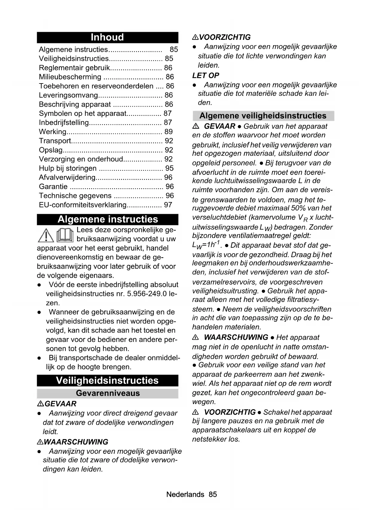 Comprimento do cabo m 10Nederlands 85 Inhoud Algemene instructies Lees deze oorspronkelijke ge- bruiksaanwijzing voordat u uw apparaat voor het eerst gebruikt, handel dienovereenkomstig en bewaar de ge- bruiksaanwijzing voor later gebruik of voor de volgende eigenaars. ● Vóór de eerste inbedrijfstelling absoluut veiligheidsinstructies nr. 5.956-249.0 le- zen. ● Wanneer de gebruiksaanwijzing en de veiligheidsinstructies niet worden opge- volgd, kan dit schade aan het toestel en gevaar voor de bediener en andere per- sonen tot gevolg hebben. ● Bij transportschade de dealer onmiddel- lijk op de hoogte brengen. Veiligheidsinstructies Gevarenniveaus GEVAAR ● Aanwijzing voor direct dreigend gevaar dat tot zware of dodelijke verwondingen leidt. 몇 WAARSCHUWING ● Aanwijzing voor een mogelijk gevaarlijke situatie die tot zware of dodelijke verwon- dingen kan leiden. 몇 VOORZICHTIG ● Aanwijzing voor een mogelijk gevaarlijke situatie die tot lichte verwondingen kan leiden. LET OP ● Aanwijzing voor een mogelijk gevaarlijke situatie die tot materiële schade kan lei- den. Algemene veiligheidsinstructies GEVAAR ● Gebruik van het apparaat en de stoffen waarvoor het moet worden gebruikt, inclusief het veilig verwijderen van het opgezogen materiaal, uitsluitend door opgeleid personeel. ● Bij terugvoer van de afvoerlucht in de ruimte moet een toerei- kende luchtuitwisselingswaarde L in de ruimte voorhanden zijn. Om aan de vereis- te grenswaarden te voldoen, mag het te- ruggevoerde debiet maximaal 50% van het verseluchtdebiet (kamervolume V