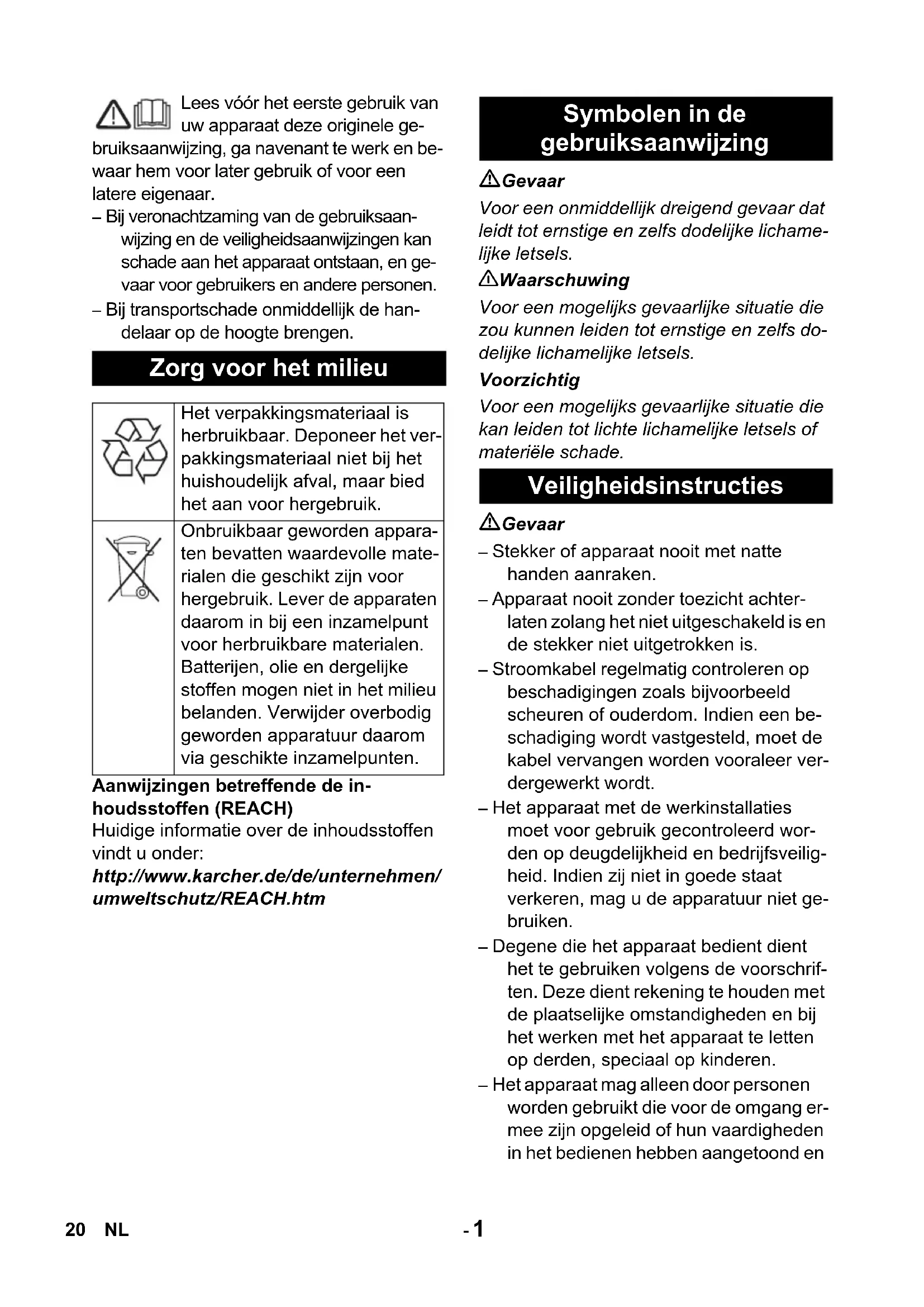 CEO Head of Approbation 19IT- 1 Lees vóór het eerste gebruik van uw apparaat deze originele ge- bruiksaanwijzing, ga navenant te werk en be- waar hem voor later gebruik of voor een latere eigenaar. – Bij veronachtzaming van de gebruiksaan- wijzing en de veiligheidsaanwijzingen kan schade aan het apparaat ontstaan, en ge- vaar voor gebruikers en andere personen. – Bij transportschade onmiddellijk de han- delaar op de hoogte brengen. Aanwijzingen betreffende de in- houdsstoffen (REACH) Huidige informatie over de inhoudsstoffen vindt u onder: http://www.karcher.de/de/unternehmen/ umweltschutz/REACH.htm Gevaar Voor een onmiddellijk dreigend gevaar dat leidt tot ernstige en zelfs dodelijke lichame- lijke letsels. 몇 Waarschuwing Voor een mogelijks gevaarlijke situatie die zou kunnen leiden tot ernstige en zelfs do- delijke lichamelijke letsels. Voorzichtig Voor een mogelijks gevaarlijke situatie die kan leiden tot lichte lichamelijke letsels of materiële schade. Gevaar – Stekker of apparaat nooit met natte handen aanraken. – Apparaat nooit zonder toezicht achter- laten zolang het niet uitgeschakeld is en de stekker niet uitgetrokken is. – Stroomkabel regelmatig controleren op beschadigingen zoals bijvoorbeeld scheuren of ouderdom. Indien een be- schadiging wordt vastgesteld, moet de kabel vervangen worden vooraleer ver- dergewerkt wordt. – Het apparaat met de werkinstallaties moet voor gebruik gecontroleerd wor- den op deugdelijkheid en bedrijfsveilig- heid. Indien zij niet in goede staat verkeren, mag u de apparatuur niet ge- bruiken. – Degene die het apparaat bedient dient het te gebruiken volgens de voorschrif- ten. Deze dient rekening te houden met de plaatselijke omstandigheden en bij het werken met het apparaat te letten op derden, speciaal op kinderen. – Het apparaat mag alleen door personen worden gebruikt die voor de omgang er- mee zijn opgeleid of hun vaardigheden in het bedienen hebben aangetoond en Zorg voor het milieu Het verpakkingsmateriaal is herbruikbaar. Deponeer het ver- pakkingsmateriaal niet bij het huishoudelijk afval, maar bied het aan voor hergebruik. Onbruikbaar geworden appara- ten bevatten waardevolle mate- rialen die geschikt zijn voor hergebruik. Lever de apparaten daarom in bij een inzamelpunt voor herbruikbare materialen. Batterijen, olie en dergelijke stoffen mogen niet in het milieu belanden. Verwijder overbodig geworden apparatuur daarom via geschikte inzamelpunten. Symbolen in de gebruiksaanwijzing Veiligheidsinstructies 20 NL- 2 uitdrukkelijk de opdracht hebben gekre- gen voor het gebruik. – Dit apparaat is niet ervoor gedacht, door personen (inclusieve kinderen) met beperkte fysieke, sensorische of geestelijke mogelijkheden of door ge- brek aan ervaring en/of door gebrek aan kennis te worden benut, tenzij deze personen door personen worden geob- serveerd die voor hun veiligheid verant- woordelijk zijn of door deze hun instructies hebben verkregen, hoe het apparaat dient te worden gebruikt. – Over kinderen dient toezicht te worden gehouden, om te waarborgen dat ze niet met het apparaat spelen. – Het apparaat mag niet in open lucht ge- bruikt of weggezet worden. – Om risico 's te vermijden, mogen repa- raties en het vervangen van onderdelen aan het apparaat alleen worden uitge- voerd door een erkende klantendienst. – Deze blazer is bestemd voor het drogen van nat gereinigde tapijten / vast tapijt. – Dit apparaat is uitsluitend bestemd voor industrieel gebruik. Ieder daarboven uitgaand gebruik geldt als niet volgens de voorschriften. Voor hieruit resulterende schades is de fabrikant niet aansprakelijk, het risico hiervoor draagt al- leen de gebruiker. 1 Transportgreep 2 Bevestiging transportgreep 3 Netkabel 4 Transportwiel 5 Klemstuk met kruisgrepen 6 Blazer 7 Handgreep 8 Apparaatschakelaar Î Transportgreep monteren. Instructie: Bij de opstelling van het appa- raat erop letten dat de ventilatieroosters vrijgehouden worden. Î Deuren en vensters openen, indien mo- gelijk, om de ventilatie te verbeteren. Î Apparaat op het te drogen tapijt plaatsen. Reglementair gebruik Apparaat-elementen Inbedrijfstelling Bediening Tapijt bovenaan drogen