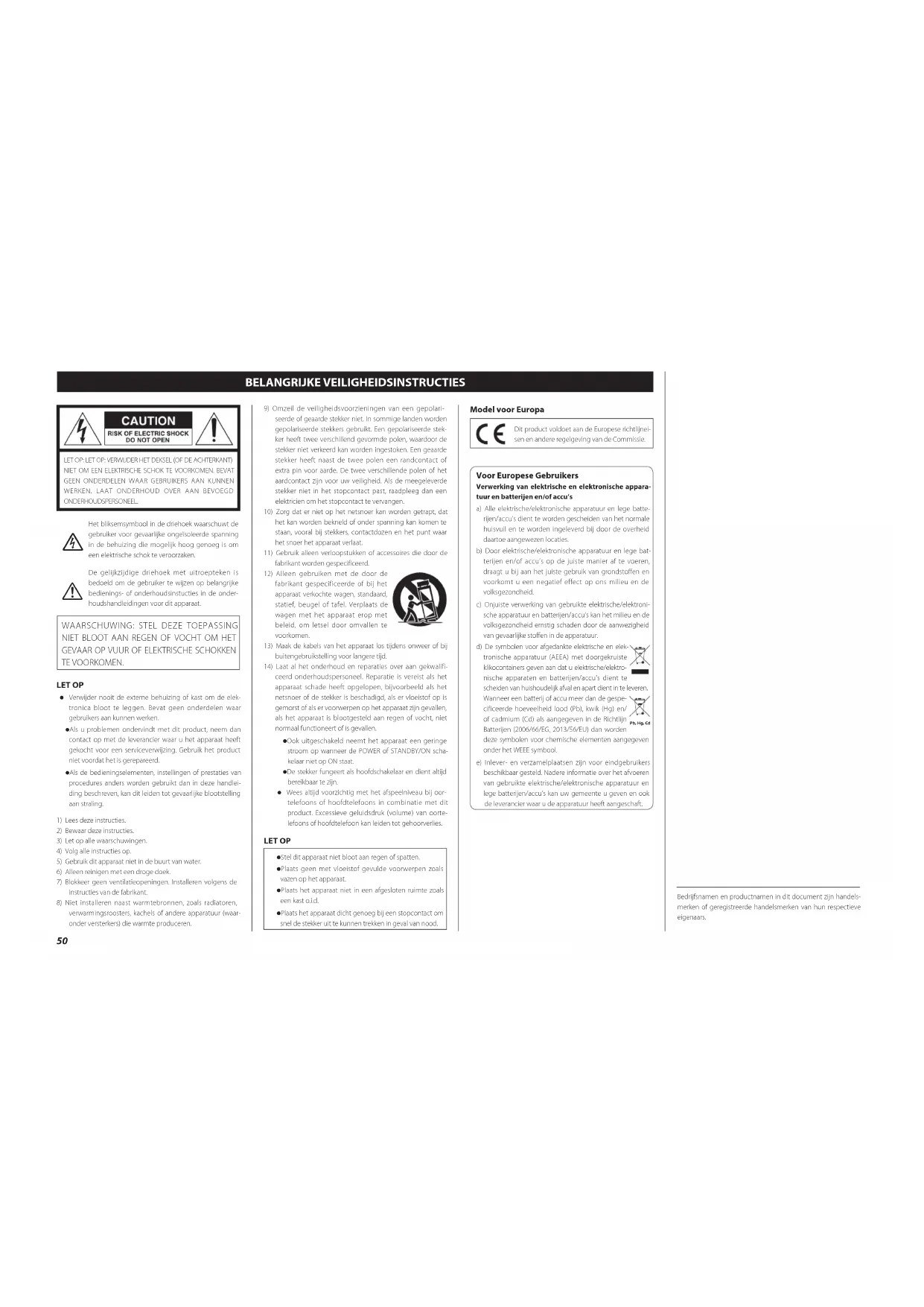 - TE VOORKOMEN. LET OP o Verwijder nooit de externe behuizing of kast om de elek- tronica bloot te leggen. Bevat geen onderdelen waar gebruikers aan kunnen werken. o Als u problemen ondervindt met dit product, neem dan contact op met de leverancier waar u het apparaat heeft gekocht voor een serviceverwijzing. Gebruik het product niet voordat het is gerepareerd. o Als de bedieningselementen, instellingen of prestaties van procedures anders worden gebruikt dan in deze handlei-ding beschreven, kan dit leiden tot gevaarlijke blootstelling aan straling.1) Lees deze instructies.2) Bewaar deze instructies.3) Let op alle waarschuwingen.4) Volg alle instructies op.5) Gebruik dit apparaat niet in de buurt van water.6) Alleen reinigen met een droge doek.7) Blokkeer geen ventilatieopeningen. Installeren volgens de instructies van de fabrikant.8) Niet installeren naast warmtebronnen, zoals radiatoren, verwarmingsroosters, kachels of andere apparatuur (waar-onder versterkers) die warmte produceren.9) Omzeil de veiligheidsvoorzieningen van een gepolari-seerde of geaarde stekker niet. In sommige landen worden gepolariseerde stekkers gebruikt. Een gepolariseerde stek-ker heeft twee verschillend gevormde polen, waardoor de stekker niet verkeerd kan worden ingestoken. Een geaarde stekker heeft naast de twee polen een randcontact of extra pin voor aarde. De twee verschillende polen of het aardcontact zijn voor uw veiligheid. Als de meegeleverde stekker niet in het stopcontact past, raadpleeg dan een elektricien om het stopcontact te vervangen.10) Zorg dat er niet op het netsnoer kan worden getrapt, dat het kan worden bekneld of onder spanning kan komen te staan, vooral bij stekkers, contactdozen en het punt waar het snoer het apparaat verlaat.11) Gebruik alleen verloopstukken of accessoires die door de fabrikant worden gespecificeerd.12) Alleen gebruiken met de door de fabrikant gespecificeerde of bij het apparaat verkochte wagen, standaard, statief, beugel of tafel. Verplaats de wagen met het apparaat erop met beleid, om letsel door omvallen te voorkomen.13) Maak de kabels van het apparaat los tijdens onweer of bij buitengebruikstelling voor langere tijd.14) Laat al het onderhoud en reparaties over aan gekwalifi-ceerd onderhoudspersoneel. Reparatie is vereist als het apparaat schade heeft opgelopen, bijvoorbeeld als het netsnoer of de stekker is beschadigd, als er vloeistof op is gemorst of als er voorwerpen op het apparaat zijn gevallen, als het apparaat is blootgesteld aan regen of vocht, niet normaal functioneert of is gevallen. o Ook uitgeschakeld neemt het apparaat een geringe stroom op wanneer de POWER of STANDBY/ON scha-kelaar niet op ON staat. o De stekker fungeert als hoofdschakelaar en dient altijd bereikbaar te zijn. o Wees altijd voorzichtig met het afspeelniveau bij oor- telefoons of hoofdtelefoons in combinatie met dit product. Excessieve geluidsdruk (volume) van oorte-lefoons of hoofdtelefoon kan leiden tot gehoorverlies. LET OP o Stel dit apparaat niet bloot aan regen of spatten. o Plaats geen met vloeistof gevulde voorwerpen zoals vazen op het apparaat. o Plaats het apparaat niet in een afgesloten ruimte zoals een kast o.i.d. o Plaats het apparaat dicht genoeg bij een stopcontact om snel de stekker uit te kunnen trekken in geval van nood. Model voor Europa Dit product voldoet aan de Europese richtlijnei-sen en andere regelgeving van de Commissie. Voor Europese Gebruikers Verwerking van elektrische en elektronische appara-tuur en batterijen en/of accu’sa) Alle elektrische/elektronische apparatuur en lege batte-rijen/accu’s dient te worden gescheiden van het normale huisvuil en te worden ingeleverd bij door de overheid daartoe aangewezen locaties.b) Door elektrische/elektronische apparatuur en lege bat-terijen en/of accu’s op de juiste manier af te voeren, draagt u bij aan het juiste gebruik van grondstoffen en voorkomt u een negatief effect op ons milieu en de volksgezondheid.c) Onjuiste verwerking van gebruikte elektrische/elektroni-sche apparatuur en batterijen/accu’s kan het milieu en de volksgezondheid ernstig schaden door de aanwezigheid van gevaarlijke stoffen in de apparatuur. d) De symbolen voor afgedankte elektrische en elek- tronische apparatuur (AEEA) met doorgekruiste klikocontainers geven aan dat u elektrische/elektro-nische apparaten en batterijen/accu's dient te scheiden van huishoudelijk afval en apart dient in te leveren.Wanneer een batterij of accu meer dan de gespe-cificeerde hoeveelheid lood (Pb), kwik (Hg) en/of cadmium (Cd) als aangegeven in de Richtlijn Batterijen (2006/66/EG, 2013/56/EU) dan worden deze symbolen voor chemische elementen aangegeven onder het WEEE symbool.e) Inlever- en verzamelplaatsen zijn voor eindgebruikers beschikbaar gesteld. Nadere informatie over het afvoeren van gebruikte elektrische/elektronische apparatuur en lege batterijen/accu’s kan uw gemeente u geven en ook de leverancier waar u de apparatuur heeft aangeschaft. Pb, Hg, Cd Bedrijfsnamen en productnamen in dit document zijn handels-merken of geregistreerde handelsmerken van hun respectieve eigenaars.NEDERLANDS Dank u voor het gebruik van TEAC.Lees deze handleiding aandachtig om dit apparaat zo goed mogelijk te kunnen gebruiken.Berg deze na het lezen op een veilige plek op, zodat u deze later kunt raadplegen.BELANGRIJKE VEILIGHEIDSINSTRUCTIES p. 50