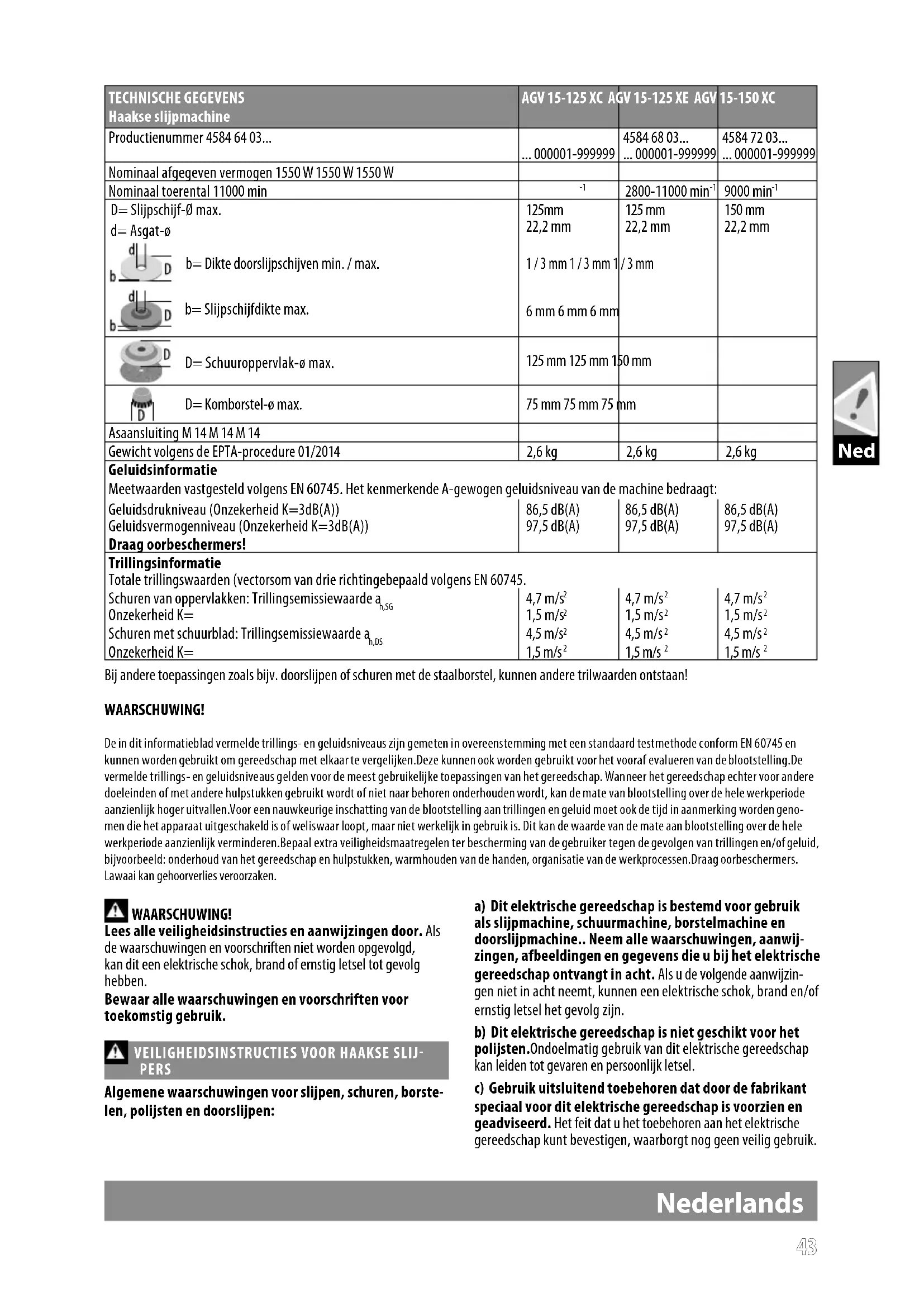 PERS Algemene waarschuwingen voor slijpen, schuren, borste- len, polijsten en doorslijpen: a) Dit elektrische gereedschap is bestemd voor gebruik als slijpmachine, schuurmachine, borstelmachine en doorslijpmachine.. Neem alle waarschuwingen, aanwij- zingen, afbeeldingen en gegevens die u bij het elektrische gereedschap ontvangt in acht. Als u de volgende aanwijzin- gen niet in acht neemt, kunnen een elektrische schok, brand en/of ernstig letsel het gevolg zijn. b) Dit elektrische gereedschap is niet geschikt voor het polijsten.Ondoelmatig gebruik van dit elektrische gereedschap kan leiden tot gevaren en persoonlijk letsel. c) Gebruik uitsluitend toebehoren dat door de fabrikant speciaal voor dit elektrische gereedschap is voorzien en geadviseerd. Het feit dat u het toebehoren aan het elektrische gereedschap kunt bevestigen, waarborgt nog geen veilig gebruik. TECHNISCHE GEGEVENS Haakse slijpmachine AGV 15-125 XC AGV 15-125 XE AGV 15-150 XC Productienummer 4584 64 03... ... 000001-999999