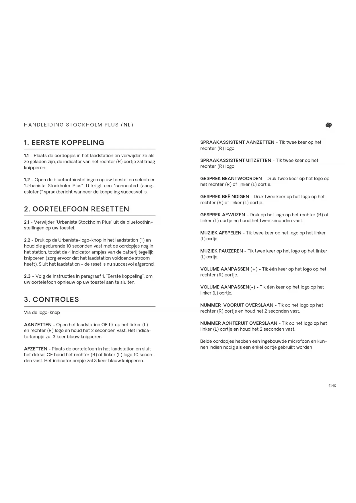 Via de logo-knop AANZETTEN - Open het laadstation OF tik op het linker (L) en rechter (R) logo en houd het 2 seconden vast. Het indica- torlampje zal 3 keer blauw knipperen. AFZETTEN - Plaats de oortelefoon in het laadstation en sluit het deksel OF houd het rechter (R) of linker (L) logo 10 secon- den vast. Het indicatorlampje zal 3 keer blauw knipperen. SPRAAKASSISTENT AANZETTEN - Tik twee keer op het rechter (R) logo. SPRAAKASSISTENT UITZETTEN - Tik twee keer op het rechter (R) logo. GESPREK BEANTWOORDEN - Druk twee keer op het logo op het rechter (R) of linker (L) oortje. GESPREK BEËINDIGEN - Druk twee keer op het logo op het rechter (R) of linker (L) oortje. GESPREK AFWIJZEN - Druk op het logo op het rechter (R) of linker (L) oortje en houd het twee seconden vast. MUZIEK AFSPELEN - Tik twee keer op het logo op het linker (L) oortje. MUZIEK PAUZEREN - Tik twee keer op het logo op het linker (L) oortje. VOLUME AANPASSEN (+) - Tik één keer op het logo op het rechter (R) oortje. VOLUME AANPASSEN(-) - Tik één keer op het logo op het linker (L) oortje. NUMMER VOORUIT OVERSLAAN - Tik op het logo op het rechter (R) oortje en houd het 2 seconden vast. NUMMER ACHTERUIT OVERSLAAN - Tik op het logo op het linker (L) oortje en houd het 2 seconden vast. Beide oordopjes hebben een ingebouwde microfoon en kun- nen indien nodig als een enkel oortje gebruikt worden4342 HANDLEIDING STOCKHOLM PLUS (NL) BATTERIJNIVEAU: 0-25%: Een lampje brandt 26-50%: Twee lampjes branden 51-75%: Drie lampjes branden 76-100%: Vier lampjes branden DE HOUDER LADEN - Om de houder te laden - Steek de USB-kabel van het type C in een energiebron. 0-25%: Een lampje knippert 26-50%: Het eerste lampje brandt, het tweede lampje knippert 51-75%: De eerste twee lampjes branden, het derde lampje knippert 76-100%: De eerste drie lampjes branden, het vierde lampje knippert 100%: Co ntinu licht Als de indicatorlampjes van de batterij niet werken zoals beschreven, ontkoppel de lader dan van het laadstation en sluit die weer aan. WAARSCHUWING VOOR LAGE BATTERIJ - Als de batterij bijna leeg is, zal u een pieptoon horen en er is nog 15 minuten afspeeltijd over voordat de oortelefoon automatisch wordt uitgeschakeld. GARANTIE
