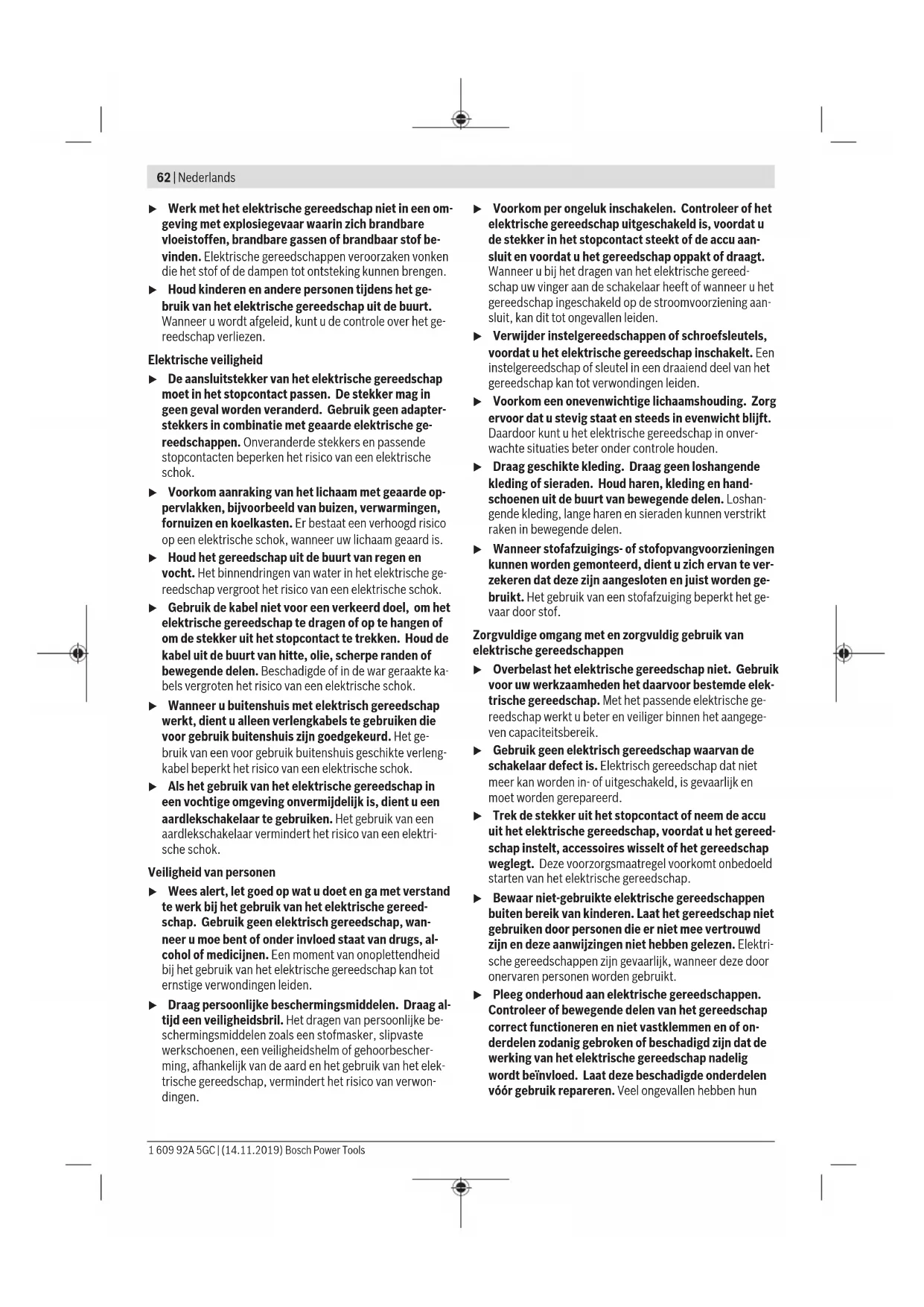 1,5 1,5 Het in deze gebruiksaanwijzing vermelde trillingsniveau en de geluidsemissiewaarde zijn gemeten met eengenormeer- de meetmethode en kunnen worden gebruikt om elektrische gereedschappen met elkaar te vergelijken. Ze zijn ook ge- schikt voor een voorlopige inschatting van de trillings- en ge- luidsemissie. Het aangegeven trillingsniveau en de aangegeven ge- luidsemissiewaarde representeren de voornaamste toepas- singen van het elektrische gereedschap. Wanneer het elek- trische gereedschap echter wordt gebruikt voor andere toe- passingen, met afwijkende inzetgereedschappen of onvol- doende onderhoud, dan kunnen het trillingsniveau en de ge- luidsemissiewaarde afwijken. Dit kan de trillings- en ge- luidsemissie gedurende de gehele arbeidsperiode duidelijk verhogen. Voor een nauwkeurige schatting van de trillings- en ge- luidsemissies moet ook rekening worden gehouden met de tijden waarin het gereedschap uitgeschakeld is, of waarin het gereedschap wel loopt, maar niet werkelijk wordt ge- bruikt. Dit kan de trillings- en geluidsemissies gedurende de gehele arbeidsperiode duidelijk verminderen. Leg aanvullende veiligheidsmaatregelen ter bescherming van de gebruiker tegen het effect van trillingen vast, zoals: onderhoud van elektrische gereedschappen en inzetgereed- schappen, warm houden van de handen, organisatie van het arbeidsproces. Bosch Power Tools 1 609 92A 5GC | (14.11.2019)66 | Nederlands Montage u Zet vóór alle werkzaamheden aan de machine (bijv. onderhoud, gereedschapswissel, enz.) evenals bij het transporteren en opbergen ervan de draairichting- schakelaar in de middelste stand. Bij per ongeluk bedie- nen van de aan/uit-schakelaar bestaat gevaar voor letsel. Accu opladen u Gebruik alleen de in de technische gegevens vermelde oplaadapparaten. Alleen deze oplaadapparaten zijn af- gestemd op de bij het elektrische gereedschap gebruikte Li-Ion-accu. Aanwijzing: De accu wordt gedeeltelijk geladen geleverd. Om de volledige capaciteit van de accu te verkrijgen, laadt u voor het eerste gebruik de accu volledig in het oplaadappa- raat op. De Lithium-Ion-accu kan op elk moment worden opgeladen zonder de levensduur te verkorten. Een onderbreking van het opladen schaadt de accu niet. De Li-Ion-accu is door de „Electronic Cell Protection (ECP)“ tegen diepontlading beschermd. Als de accu leeg is, wordt het elektrische gereedschap door een veiligheidsschakeling uitgeschakeld. Het inzetgereedschap beweegt niet meer. u Druk na het automatisch uitschakelen van het elektri- sche gereedschap niet meer op de aan/uit-schakelaar. De accu kan anders beschadigd worden. Neem de aanwijzingen met betrekking tot afvalverwijdering in acht. Accu verwijderen De accu(14) beschikt over twee vergrendelingsstanden die moeten voorkomen dat de accu bij het onbedoeld indrukken van de accu-ontgrendelingstoets(10) uit de machine valt. Zolang de accu in het elektrische gereedschap is geplaatst, wordt deze door een veer op de juiste plaats gehouden. – Voor het verwijderen van de accu (14) drukt u op de ont- grendelingstoets (10) en trekt u de accu uit het elektri- sche gereedschap. Gebruik daarbij geen geweld. Accu-oplaadaanduiding De groene LED's van de accu-oplaadaanduiding geven de laadtoestand van de accu aan. Uit veiligheidsoverwegingen is het opvragen van de laadtoestand alleen bij stilstaand elektrisch gereedschap mogelijk. Druk op de toets voor de oplaadaanduiding of , om de laadtoestand aan te geven. Dit is ook mogelijk, wanneer de accu is weggenomen. Als er na het drukken op de toets voor de oplaadaanduiding geen LED brandt, dan is de accu defect en moet vervangen worden. Accutype GBA 18V... LED's Capaciteit Permanent licht 3× groen 60−100% Permanent licht 2× groen 30−60% Permanent licht 1× groen 5−30% Knipperlicht 1× groen 0−5% Accutype ProCORE18V... LED's Capaciteit Permanent licht 5× groen 80−100 % Permanent licht 4× groen 60−80 % Permanent licht 3× groen 40−60 % Permanent licht 2× groen 20−40 % Permanent licht 1× groen 5−20 % Knipperlicht 1× groen 0−5 % Extra handgreep u Gebruik uw elektrische gereedschap alleen met de ex- tra handgreep (19). Extra handgreep draaien (zie afbeelding A) U kunt de extra handgreep (19) willekeurig draaien voor een veilige en comfortabele werkhouding. – Draai het onderste deel van de extra handgreep (19) linksom en draai de extra handgreep (19) in de gewenste stand. Draai vervolgens het onderste deel van de extra handgreep (19) rechtsom weer vast. Let erop dat de spanband van de extra handgreep in de daarvoor bedoelde groef in het machinehuis ligt. Boorhouder en inzetgereedschap kiezen Voor hamerboor- en beitelwerkzaamheden hebt u SDS-plus inzetgereedschappen nodig die in de SDS-plus boorhouder worden geplaatst. Voor boorwerkzaamheden zonder slag in hout, metaal, kera- miek en kunststof en voor het in- en uitdraaien van schroe- ven worden inzetgereedschappen zonder SDS-plus (bijv. bo- ren met cilindrische schacht) gebruikt. Voor deze inzetge- reedschappen hebt u een snelspanboorhouder of tandkrans- boorhouder nodig. Tandkransboorhouder inzetten/uitnemen (GBH18V-26) Tandkransboorhouder monteren (zie afbeelding B) – Schroef de SDS-plus opnameschacht (23) in een tand- kransboorhouder (22). Borg de tandkransboorhouder 1 609 92A 5GC | (14.11.2019) Bosch Power ToolsNederlands | 67 (22) met de borgschroef (21). Denk eraan dat de borg- schroef linkse schroefdraad heeft. Tandkransboorhouder aanbrengen (zie afbeelding B) – Reinig de schacht van de opnameschacht en smeer deze iets met vet in. – Zet de tandkransboorhouder met de opnameschacht draaiend in de gereedschapopname tot deze automatisch wordt vergrendeld. – Controleer de vergrendeling door aan de tandkransboor- houder te trekken. Tandkransboorhouder verwijderen – Schuif de vergrendelingshuls (5) naar achteren en verwij- der de tandkransboorhouder (22). Wisselboorhouder verwijderen/bevestigen (GBH18V-26F) Wisselboorhouder verwijderen (zie afbeelding C) – Trek de vergrendelingsri