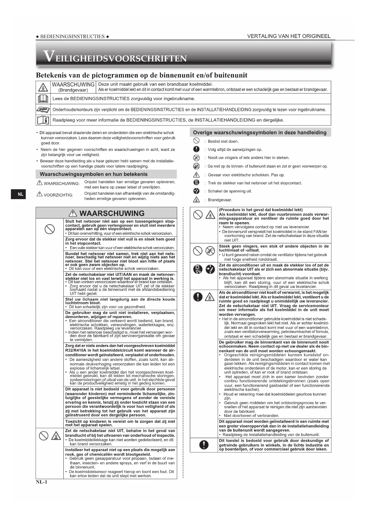 - Dit apparaat bevat draaiende delen en onderdelen die een elektrische schok kunnen veroorzaken. Lees daarom deze veiligheidsvoorschriften voor gebruik goed door.• Neem de hier gegeven voorschriften en waarschuwingen in acht, want ze zijn belangrijk voor uw veiligheid.• Bewaar deze handleiding als u haar gelezen hebt samen met de installatie-voorschriften op een handige plaats voor latere raadpleging. Waarschuwingssymbolen en hun betekenis WAARSCHUWING:Onjuist handelen kan ernstige gevaren opleveren, met een kans op zwaar letsel of overlijden. VOORZICHTIG:Onjuist handelen kan afhankelijk van de omstandig-heden ernstige gevaren opleveren. Overige waarschuwingssymbolen in deze handleiding : Beslist niet doen. : Volg altijd de aanwijzingen op. : Nooit uw vingers of iets anders hier in steken. : Ga niet op de binnen- of buitenunit staan en zet er geen voorwerpen op. : Gevaar voor elektrische schokken. Pas op. : Trek de stekker van het netsnoer uit het stopcontact. : Schakel de spanning uit. : Brandgevaar. WAARSCHUWING Sluit het netsnoer niet aan op een tussengelegen stop-contact, gebruik geen verlengsnoer en sluit niet meerdere apparaten aan op één stopcontact.• Dit kan oververhitting, vuur of een elektrische schok veroorzaken.Zorg ervoor dat de stekker niet vuil is en steek hem goed in het stopcontact. Een vuile stekker kan vuur of een elektrische schok veroorzaken.Bundel het netsnoer niet samen, trek niet aan het nets-noer, beschadig het netsnoer niet en wijzig niets aan het netsnoer. Stel het netsnoer niet bloot aan hitte of plaats er ook geen zware objecten op.• Dit kan vuur of een elektrische schok veroorzaken.Zet de netschakelaar niet UIT/AAN en maak de netsnoer-stekker niet los en vast terwijl het apparaat in werking is.• Dit kan vonken veroorzaken waardoor er brand kan ontstaan.• Zorg ervoor dat u de netschakelaar UIT zet of de stekker losmaakt nadat u de binnenunit met de afstandsbediening UIT hebt gezet. Stel uw lichaam niet langdurig aan de directe koude luchtstroom bloot.• Dit kan schadelijk zijn voor uw gezondheid.De gebruiker mag de unit niet installeren, verplaatsen, demonteren, wijzigen of repareren.• Een airconditioner die verkeerd wordt bediend, kan brand, elektrische schokken, verwondingen, waterlekkages, enz. veroorzaken. Raadpleeg uw leverancier.• Indien het netsnoer beschadigd is, moet het vervangen wor-den door de fabrikant of zijn serviceorganisatie om gevaar te vermijden.Zorg dat er niets anders dan het voorgeschreven koelmiddel R32/R410A in het koelmiddelcircuit komt wanneer de air-conditioner wordt geïnstalleerd, verplaatst of onderhouden.• De aanwezigheid van andere stoffen, zoals lucht, kan ab-normale drukverhoging veroorzaken die kan leiden tot een explosie of lichamelijk letsel. • Als u een ander koelmiddel dan het voorgeschreven koel-middel gebruikt, kan dit leiden tot mechanische storingen, systeemstoringen of uitval van de unit. In het slechtste geval kan de productveiligheid ernstig in het geding komen.Dit apparaat is niet bedoeld voor gebruik door personen (waaronder kinderen) met verminderde lichamelijke, zin-tuiglijke of geestelijke vermogens of zonder de vereiste ervaring en kennis, tenzij zij onder toezicht staan van een persoon die verantwoordelijk is voor hun veiligheid of als zij met betrekking tot het gebruik van het apparaat zijn geïnstrueerd door een dergelijke persoon.Toezicht op kinderen is vereist om te zorgen dat zij niet met het apparaat spelen. Zet de netschakelaar niet UIT, behalve in het geval van brandlucht of bij het uitvoeren van onderhoud of inspectie.• De koelmiddellekkage kan niet worden gedetecteerd, en dit kan brand veroorzaken.Installeer het apparaat niet op een plaats die mogelijk aan rook, gas of chemicaliën wordt blootgesteld.• Gebruik geen gasapparatuur voor propaan, butaan of me-thaan, insecten- en andere sprays, en verf in de buurt van de binnenunit.• De koelmiddelsensor reageert hierop en toont een fout. Dit kan ertoe leiden dat de unit stopt met werken. (Procedure in het geval dat koelmiddel lekt)Als koelmiddel lekt, doof dan vuurbronnen zoals verwar-mingsapparatuur en ventileer de ruimte goed door het raam te openen.• Neem vervolgens contact op met uw leverancier.• De binnenunit verspreidt het koelmiddel in de stand FAN ter voorkoming van brand. Zet de netschakelaar in deze situatie niet UIT. Steek geen vingers, een stok of andere objecten in de luchtinlaat of -uitlaat.• U kunt gewond raken omdat de ventilator tijdens het gebruik met hoge snelheid ronddraait. Zet de airconditioner uit en maak de stekker los of zet de netschakelaar UIT als er zich een abnormale situatie (bijv. brandlucht) voordoet.• Als het apparaat tijdens een abnormale situatie in werking blijft, kan dit een storing, vuur of een elektrische schok veroorzaken. Raadpleeg in dit geval uw leverancier. Als de airconditioner niet koelt of verwarmt, is het mogelijk dat er koelmiddel lekt. Als er koelmiddel lekt, ventileert u de ruimte goed en raadpleegt u onmiddellijk uw leverancier. Zet de netschakelaar niet UIT. Vraag de servicemonteur om meer informatie als het koelmiddel in de unit moet worden vervangen.• Het in de airconditioner gebruikte koelmiddel is niet schade-lijk. Normaal gesproken lekt het niet. Als er echter koelmid-del lekt en dit in contact komt met vuur of een warmtebron, zoals een ventilatorverwarming, petroleumkachel of fornuis, ontstaat er een schadelijk gas en bestaat er brandgevaar.De gebruiker mag de binnenkant van de binnenunit nooit schoonmaken. Neem contact op met uw dealer als de bin-nenkant van de unit moet worden schoongemaakt.• Ongeschikte reinigingsmiddelen kunnen kunststof on-derdelen in de unit beschadigen waardoor er water kan gaan lekken. Als reinigingsmiddelen in contact komen met elektrische onderdelen of de motor, kan er een storing de unit optreden, of kan er rook of brand ontstaan.• Het apparaat moet zich in een kamer bevinden zonder continu functionerende ontstekingsbronnen 