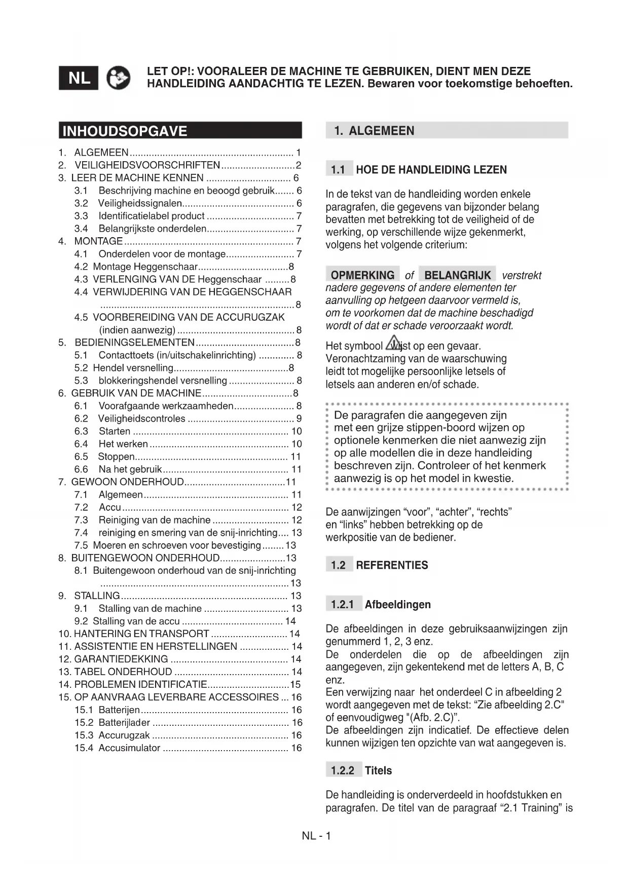I. Accu(indien niet met de machine geleverd, zie