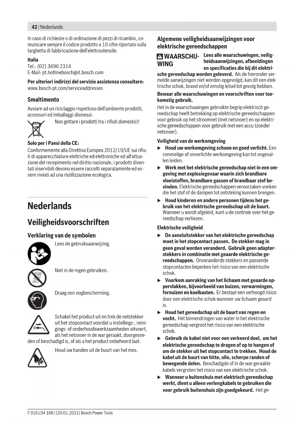 Impiego u Osservare la tensione di rete! La tensione riportata sulla targhetta di identificazione dell'apparecchio deve corri- spondere alla tensione della rete elettrica di alimentazio- ne. Accensione/spegnimento (vedi figure C e D) Per l'accensione premere innanzitutto il pulsante di sicurez- za (3) e tenerlo premuto. Premere quindi l'interruttore di av- vio/arresto (2) e tenerlo premuto. Per lo spegnimento rilasciare il pulsante di sicurezza (3) e successivamente l'interruttore di avvio/arresto (2). Funzione sega Nonostante l’apertura dente per taglio rami è permessa fino aØ20mm, la punta della lama è concepita per tagli fino a Ø25mm. F 016 L94 168 | (20.01.2021) Bosch Power ToolsItaliano | 41 Lavoro con la tagliasiepi (vedi figura E) Muovere uniformemente in avanti la tagliasiepi sulla linea di taglio. La lama a doppio taglio permettere di tagliare in en- trambe le direzioni oppure mediante movimenti pendolari da una parte all’altra. Tagliare prima i lati della siepe e poi il bordo superiore. Per ottenere lati diritti, raccomandiamo di tagliare seguendo la direzione della crescita partendo dal basso e proseguendo verso l’alto. Tagliando dall’alto verso il basso, i ramoscelli più sottili si spostano verso l’esterno provocando in questo mo- do punti sottili oppure buchi. Per poter infine tagliare uniformemente il bordo superiore, tendere su tutta la lunghezza della siepe un'apposita corda di riferimento regolata all’altezza che si ritiene necessaria. Prestare attenzione affinché non vengano tagliati oggetti co- me ad es. fili metallici. Le lame oppure l'azionamento ne po- trebbero essere danneggiati. Individuazione dei guasti e rimedi Problema Possibili cause Rimedi La tagliasiepi non fun- ziona Tensione di rete assente Controllare ed inserire Presa elettrica difettosa Utilizzare un’altra presa Cavo di rete danneggiato Controllare il cavo di rete e qualora fosse danneg- giato contattare il Servizio Assistenza Tecnica Clienti Cavo di prolunga danneggiato Controllare il cavo di prolunga e sostituirlo qualo- ra fosse danneggiato Il fusibile è scattato Sostituire il fusibile La tagliasiepi funziona con interruzioni Cablaggio interno dell’apparecchio per il giardi- naggio difettoso Contattare il Servizio Assistenza Tecnica Clienti Interruttore di avvio/arresto difettoso Contattare il Servizio Assistenza Tecnica Clienti Il motore è in funzione, le lame restano ferme Guasto interno Contattare il Servizio Assistenza Tecnica Clienti Le lame diventano bol- lenti Lama senza filo Far affilare le lame La lama ha delle tacche Far controllare le lame Troppo attrito a causa della mancanza di lubrifica- zione Spruzzare con olio lubrificante Vibrazioni/rumori ec- cessivi Apparecchio per il giardinaggio difettoso Contattare il Servizio Assistenza Tecnica Clienti Manutenzione ed assistenza Manutenzione, pulizia e magazzinaggio u Prima di tutti gli interventi al prodotto staccare la spi- na dalla presa di corrente. u Tenere il prodotto pulito per poter lavorare bene ed in modo sicuro. Non appoggiare nessun altro oggetto sull’apparecchio per il giardinaggio. Tenere il prodotto e le fessure di ventilazione puliti per poter lavorare bene ed in modo sicuro. Non spruzzare mai il prodotto con acqua. Non immergere mai il prodotto in acqua. Immagazzinare il prodotto in un posto sicuro ed asciutto e al di fuori della portata dei bambini. Non appoggiare nessun altro oggetto sul prodotto. Assicurarsi sempre che tutti i dadi, i perni e le viti siano ben serrati affinché sia possibile lavorare in modo sicuro con il prodotto. Controllare il prodotto e per ragioni di sicurezza sostituire parti usurate o danneggiate. Accertarsi che le parti di ricambio da sostituire provengano da Bosch. Servizio di assistenza e consulenza tecnica Il servizio di assistenza risponde alle Vostre domande relati- ve alla riparazione e alla manutenzione del Vostro prodotto nonché concernenti i pezzi di ricambio. Disegni in vista esplosa e informazioni relative ai pezzi di ricambio sono con- sultabili anche sul sito www.bosch-pt.com Il team di consulenza tecnica Bosch sarà lieto di rispondere alle Vostre domande in merito ai nostri prodotti e accessori. Bosch Power Tools F 016 L94 168 | (20.01.2021)42 | Nederlands In caso di richieste o di ordinazione di pezzi di ricambio, co- municare sempre il codice prodotto a 10cifre riportato sulla targhetta di fabbricazione dell’elettroutensile. Italia Tel.: (02) 3696 2314 E-Mail: pt.hotlinebosch@it.bosch.com Per ulteriori indirizzi del servizio assistenza consultare: www.bosch-pt.com/serviceaddresses Smaltimento Avviare ad un riciclaggio rispettoso dell’ambiente prodotti, accessori ed imballaggi dismessi. Non gettare i prodotti tra i rifiuti domestici! Solo per i Paesi dellaCE: Conformemente alla Direttiva Europea 2012/19/UE sui rifiu- ti di apparecchiature elettriche ed elettroniche ed all'attua- zione del recepimento nel diritto nazionale, i prodotti diven- tati inservibili devono essere raccolti separatamente ed es- sere inviati ad una riutilizzazione ecologica. Nederlands Veiligheidsvoorschriften Verklaring van de symbolen Lees de gebruiksaanwijzing. Niet in de regen gebruiken. Draag een oogbescherming. Schakel het product uit en trek de netstekker uit het stopcontact voordat u instellings-, reini- gings- of onderhoudswerkzaamheden uitvoert, als het netsnoer in de war geraakt, doorgesne- den of beschadigd is, of als u het product onbeheerd laat. Houd uw handen uit de buurt van het mes. Algemene veiligheidsaanwijzingen voor elektrische gereedschappen WAARSCHU- WING Lees alle waarschuwingen, veilig- heidsaanwijzingen, afbeeldingen en specificaties die bij dit elektri- sche gereedschap worden geleverd. Als de hieronder ver- melde aanwijzingen niet worden opgevolgd, kan dit een elek- trische schok, brand en/of ernstig letsel tot gevolg hebben. Bewaar alle waarschuwingen en voorschriften voor toe- komstig gebruik. Het in de waarschuwingen gebruikte begrip elektrisch ge- ree