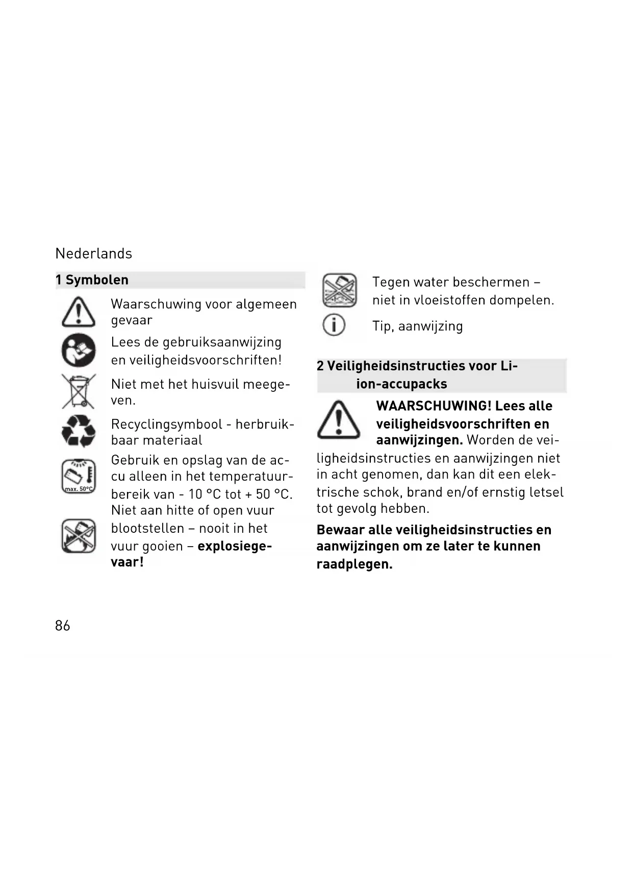 het accupack Het accupack wordt gedeeltelijk geladen geleverd. Om het volle vermogen van het accupack te garanderen, dient u het vóór het eerste gebruik geheel op te la den. Nederlands 91Het accupack kan altijd opgeladen wor den zonder de levensduur te verkorten. Een onderbreking van het opladen be schadigt het accupack niet. Na de automatische uitscha keling van het elektrisch ge reedschap niet verder op de aan-/uit-schakelaar drukken. Het ac cupack kan beschadigd worden. Het accupack is met een temperatuur bewaking uitgerust die alleen een opla ding in het temperatuurbereik tussen 0 °C en 55 °C toelaat. Hierdoor wordt een hoge acculevensduur bereikt. – Accupack zo koel mogelijk (5 °C tot 25 °C) en droog (luchtvochtigheid < 80%) opslaan. – Accupack bijv. in de zomer niet in de auto laten liggen. – Een aanzienlijk kortere bedrijfsduur na de oplading geeft aan dat het accu pack verbruikt is en vervangen dient te worden. – Instructies voor verwijdering.