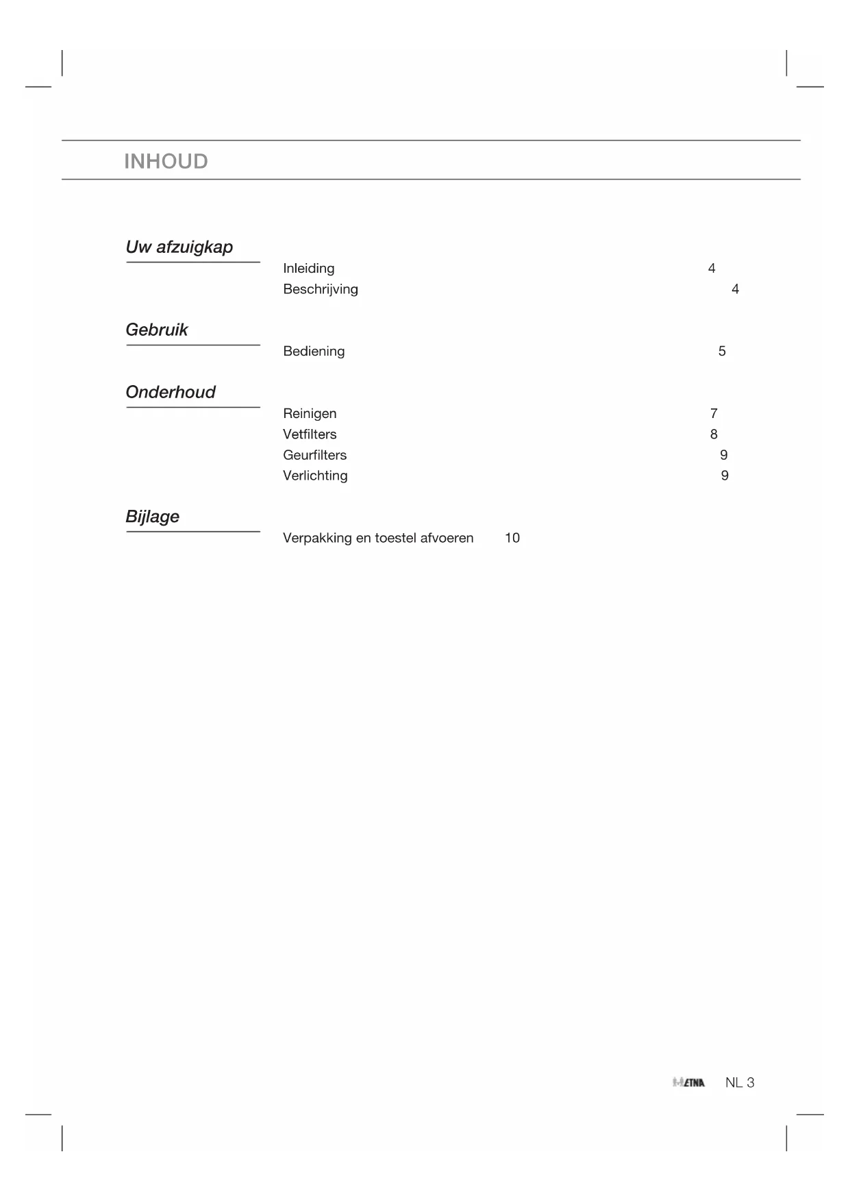 DUNSTABZUGSHAUBE COOKER HOOD AOP380WITNL 2 NL Handleiding NL 3 - NL 10 FR Notice d’utilisation FR 3 - FR 10 DE Anleitung DE 3 - DE 10 EN Manual EN 3 - EN 10 Gebruikte pictogrammen - Pictogrammes utilisés Benutzte Piktogramme - Pictograms used Belangrijk om te weten - Important à savoir Wissenswertes - Important information Tip - Conseil - Tipp - TipNL 3 INHOUD Uw afzuigkap Inleiding 4 Beschrijving 4 Gebruik Bediening 5 Onderhoud Reinigen 7 Vetfilters 8 Geurfilters 9 Verlichting 9 Bijlage Verpakking en toestel afvoeren 10NL 4 Inleiding Als u deze gebruiksaanwijzing doorleest, bent u snel op de hoogte van alle mogelijk heden die dit toestel u biedt. U vindt informatie voor uw veiligheid en over het onderhoud van het toestel. Lees eerst de afzonderlijke veiligheidsinstructies voordat u het toestel gaat gebruiken! Bewaar de gebruiksaanwijzing en het installatievoorschrift. Een eventueel volgende gebruiker van dit toestel kan daar zijn voordeel mee doen. Beschrijving