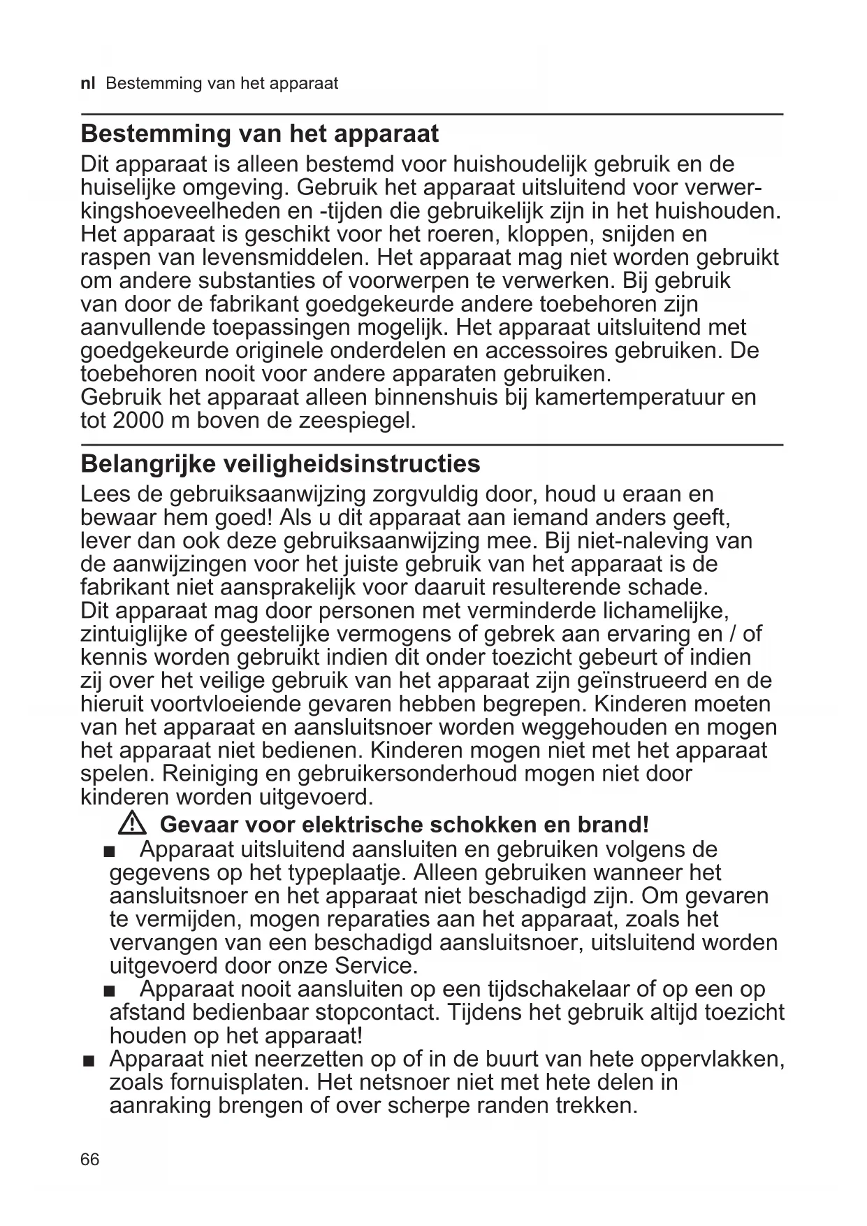 tare il documento di acquisto. Con riserva di modica.66 nl Bestemming van het apparaat Bestemming van het apparaat Dit apparaat is alleen bestemd voor huishoudelijk gebruik en de huiselijke omgeving. Gebruik het apparaat uitsluitend voor verwer- kingshoeveelheden en -tijden die gebruikelijk zijn in het huishouden. Het apparaat is geschikt voor het roeren, kloppen, snijden en raspen van levensmiddelen. Het apparaat mag niet worden gebruikt om andere substanties of voorwerpen te verwerken. Bij gebruik van door de fabrikant goedgekeurde andere toebehoren zijn aanvullende toepassingen mogelijk. Het apparaat uitsluitend met goedgekeurde originele onderdelen en accessoires gebruiken. De toebehoren nooit voor andere apparaten gebruiken. Gebruik het apparaat alleen binnenshuis bij kamertemperatuur en tot 2000 m boven de zeespiegel. Belangrijke veiligheidsinstructies Lees de gebruiksaanwijzing zorgvuldig door, houd u eraan en bewaar hem goed! Als u dit apparaat aan iemand anders geeft, lever dan ook deze gebruiksaanwijzing mee. Bij niet-naleving van de aanwijzingen voor het juiste gebruik van het apparaat is de fabrikant niet aansprakelijk voor daaruit resulterende schade. Dit apparaat mag door personen met verminderde lichamelijke, zintuiglijke of geestelijke vermogens of gebrek aan ervaring en / of kennis worden gebruikt indien dit onder toezicht gebeurt of indien zij over het veilige gebruik van het apparaat zijn geïnstrueerd en de hieruit voortvloeiende gevaren hebben begrepen. Kinderen moeten van het apparaat en aansluitsnoer worden weggehouden en mogen het apparaat niet bedienen. Kinderen mogen niet met het apparaat spelen. Reiniging en gebruikersonderhoud mogen niet door kinderen worden uitgevoerd. W Gevaar voor elektrische schokken en brand! ■ Apparaat uitsluitend aansluiten en gebruiken volgens de gegevens op het typeplaatje. Alleen gebruiken wanneer het aansluitsnoer en het apparaat niet beschadigd zijn. Om gevaren te vermijden, mogen reparaties aan het apparaat, zoals het vervangen van een beschadigd aansluitsnoer, uitsluitend worden uitgevoerd door onze Service. ■ Apparaat nooit aansluiten op een tijdschakelaar of op een op afstand bedienbaar stopcontact. Tijdens het gebruik altijd toezicht houden op het apparaat! ■ Apparaat niet neerzetten op of in de buurt van hete oppervlakken, zoals fornuisplaten. Het netsnoer niet met hete delen in aanraking brengen of over scherpe randen trekken.67