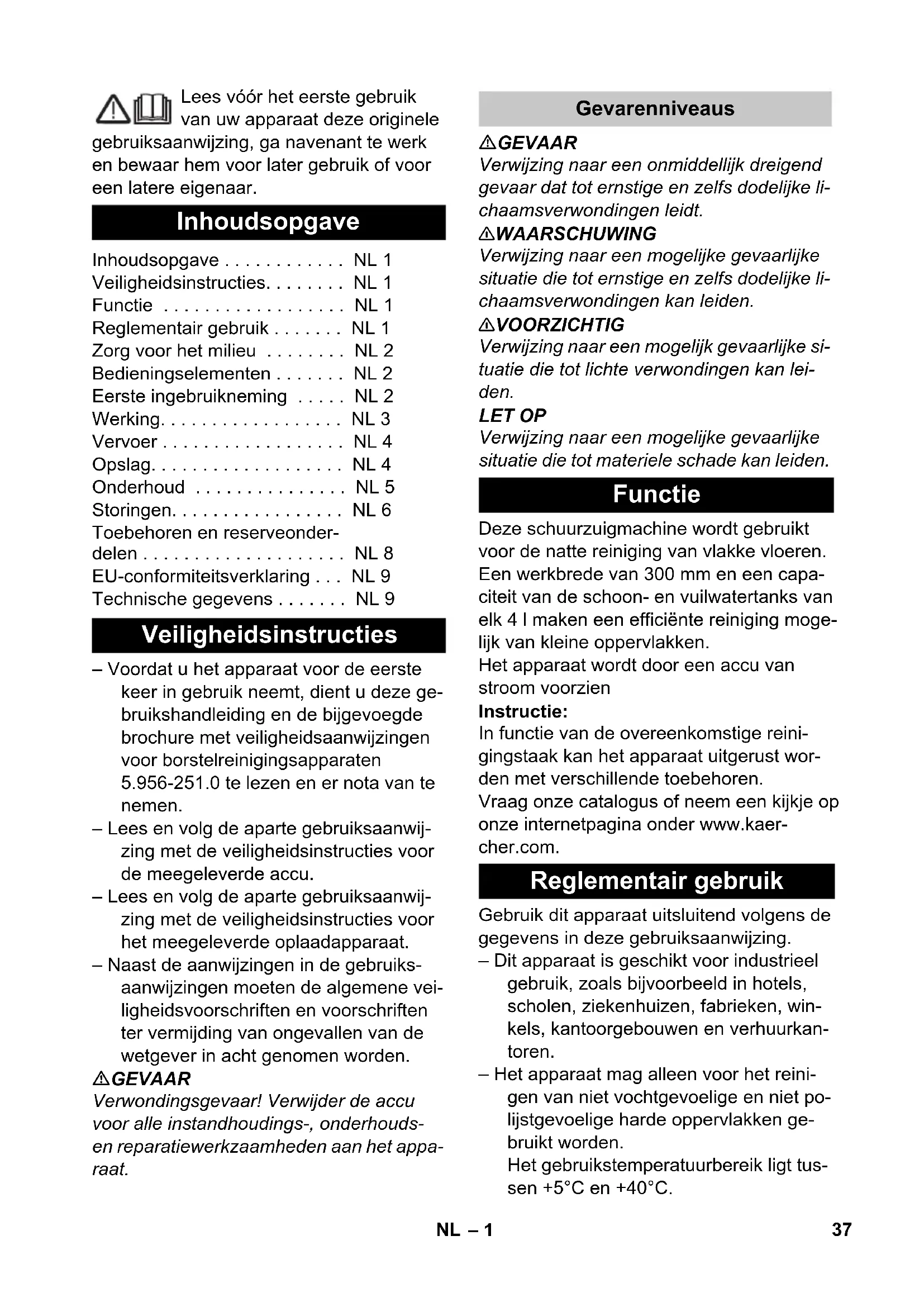 dB(A) 1 36 IT– 1 Lees vóór het eerste gebruik van uw apparaat deze originele gebruiksaanwijzing, ga navenant te werk en bewaar hem voor later gebruik of voor een latere eigenaar. – Voordat u het apparaat voor de eerste keer in gebruik neemt, dient u deze ge- bruikshandleiding en de bijgevoegde brochure met veiligheidsaanwijzingen voor borstelreinigingsapparaten 5.956-251.0 te lezen en er nota van te nemen. – Lees en volg de aparte gebruiksaanwij- zing met de veiligheidsinstructies voor de meegeleverde accu. – Lees en volg de aparte gebruiksaanwij- zing met de veiligheidsinstructies voor het meegeleverde oplaadapparaat. – Naast de aanwijzingen in de gebruiks- aanwijzingen moeten de algemene vei- ligheidsvoorschriften en voorschriften ter vermijding van ongevallen van de wetgever in acht genomen worden. GEVAAR Verwondingsgevaar! Verwijder de accu voor alle instandhoudings-, onderhouds- en reparatiewerkzaamheden aan het appa- raat. GEVAAR Verwijzing naar een onmiddellijk dreigend gevaar dat tot ernstige en zelfs dodelijke li- chaamsverwondingen leidt. 몇 WAARSCHUWING Verwijzing naar een mogelijke gevaarlijke situatie die tot ernstige en zelfs dodelijke li- chaamsverwondingen kan leiden. 몇 VOORZICHTIG Verwijzing naar een mogelijk gevaarlijke si- tuatie die tot lichte verwondingen kan lei- den. LET OP Verwijzing naar een mogelijke gevaarlijke situatie die tot materiele schade kan leiden. Deze schuurzuigmachine wordt gebruikt voor de natte reiniging van vlakke vloeren. Een werkbrede van 300 mm en een capa- citeit van de schoon- en vuilwatertanks van elk 4 l maken een efficiënte reiniging moge- lijk van kleine oppervlakken. Het apparaat wordt door een accu van stroom voorzien Instructie: In functie van de overeenkomstige reini- gingstaak kan het apparaat uitgerust wor- den met verschillende toebehoren. Vraag onze catalogus of neem een kijkje op onze internetpagina onder www.kaer- cher.com. Gebruik dit apparaat uitsluitend volgens de gegevens in deze gebruiksaanwijzing. – Dit apparaat is geschikt voor industrieel gebruik, zoals bijvoorbeeld in hotels, scholen, ziekenhuizen, fabrieken, win- kels, kantoorgebouwen en verhuurkan- toren. – Het apparaat mag alleen voor het reini- gen van niet vochtgevoelige en niet po- lijstgevoelige harde oppervlakken ge- bruikt worden. Het gebruikstemperatuurbereik ligt tus- sen +5°C en +40°C. Inhoudsopgave Inhoudsopgave . . . . . . . . . . . . NL 1 Veiligheidsinstructies. . . . . . . . NL 1 Functie . . . . . . . . . . . . . . . . . . NL 1 Reglementair gebruik . . . . . . . NL 1 Zorg voor het milieu . . . . . . . . NL 2 Bedieningselementen . . . . . . . NL 2 Eerste ingebruikneming . . . . . NL 2 Werking. . . . . . . . . . . . . . . . . . NL 3 Vervoer . . . . . . . . . . . . . . . . . . NL 4 Opslag. . . . . . . . . . . . . . . . . . . NL 4 Onderhoud . . . . . . . . . . . . . . . NL 5 Storingen. . . . . . . . . . . . . . . . . NL 6 Toebehoren en reserveonder- delen . . . . . . . . . . . . . . . . . . . . NL 8 EU-conformiteitsverklaring . . . NL 9 Technische gegevens . . . . . . . NL 9 Veiligheidsinstructies Gevarenniveaus Functie Reglementair gebruik 37NL– 2 – Het apparaat is niet geschikt voor de reiniging van bevroren vloeren (bijv. in koelhuizen). – Het apparaat mag alleen uitgerust wor- den met originele toebehoren en reser- veonderdelen. – Het apparaat werd ontwikkeld voor het reinigen van vloeren binnen resp. over- dekte oppervlakken. – Het apparaat is niet bestemd voor de reiniging van openbare verkeerswegen. – Het apparaat is niet geschikt voor het gebruik in explosiegevaarlijke omgevin- gen. Aanwijzingen betreffende de inhouds- stoffen (REACH) Huidige informatie over de inhoudsstoffen vindt u onder: www.kaercher.com/REACH Afbeeldingen zie omslagpagina Afbeelding 1 Greep 2 Schakelaar waterpomp 3 Knop Borstel-/zuigwerking 4 Handgreep 5 Draagbeugel vuilwatertank 6 Vuilwaterreservoir 7 Schoonwaterreservoir 8 Sluiting schoonwaterreservoir (vulope- ning) 9 Batterij 10 Accuhouder 11 Reinigingskop 12 Pedaal Omhoog zetten zuigbalk 13 Ontgrendeling parkeerstand 14 Accu-indicatie Zie hiervoor de gebruiksaanwijzing van de accu 15 Ontgrendeling accu 16 Ontgrendelingsknop, wisselborstel 17 Borstelrol 18 Zuigbalk 19 Deksel reservoir vuil water 20 Sluiting deksel vuilwaterreservoir 21 Aanduiding vulstand 22 Indicator accu-laadtoestand 3 leds branden: 100-76% restcapaciteit 2 leds branden: 75-51% restcapaciteit 1 led brandt: 50-26% restcapaciteit 1 led knippert: minder dan 26% restca- paciteit, accu opladen 23 Verbinding zuigbuis-zuigslang 24 Zuigbuis 25 Zuigslang Afbeelding Buis aan het uiteinde van de greep in de opening aan het apparaat steken. Arrêteringen indrukken en greep in- schuiven tot hij in het apparaat vastklikt. Zorg voor het milieu Het verpakkingsmateriaal is her- bruikbaar. Deponeer het verpak- kingsmateriaal niet bij het huis- houdelijk afval, maar bied het aan voor hergebruik. Onbruikbaar geworden appara- ten bevatten waardevolle materi- alen die geschikt zijn voor herge- bruik. Lever de apparaten daar- om in bij een inzamelpunt voor herbruikbare materialen. Batterij- en en accu's bevatten stoffen die niet in het milieu mogen terecht- komen. Gelieve oude apparaten, batterijen en accu's in te leveren op de geschikte inzamelpunten. Elektrische en elektronische ap- paraten bevatten vaak onderde- len die een potentieel gevaar kunnen vormen voor de menselij- ke gezondheid en het milieu als ze foutief worden gebruikt of niet correct worden afgevoerd. Deze onderdelen zorgen er desalniet- temin voor dat het apparaat naar behoren functioneert. Apparaten die dit symbool dragen, mogen niet met het huisvuil worden afge- voerd. Bedieningselementen Eerste ingebruikneming 38 NL– 3 Kabel in het toestel plaatsen en deksel aanbrengen, zoals weergegeven in het bijgevoegde blad. Accu opladen. De beschrijving hiervan vindt u in de aparte gebruiksaanwijzingen van de accu en het oplaadapparaat Afbeelding De opgeladen accu in de accuhouder plaat