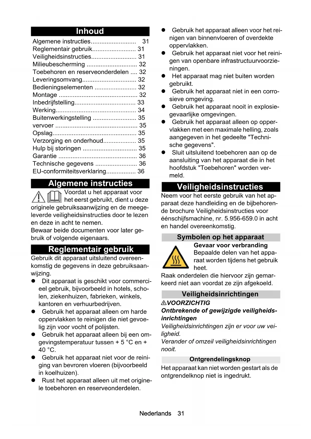 - 67,1 71,5 BDS 43/Or- bital C BDS 43/Or- bital C SprayNederlands 31 Inhoud Algemene instructies Voordat u het apparaat voor het eerst gebruikt, dient u deze originele gebruiksaanwijzing en de meege- leverde veiligheidsinstructies door te lezen en deze in acht te nemen. Bewaar beide documenten voor later ge- bruik of volgende eigenaars. Reglementair gebruik Gebruik dit apparaat uitsluitend overeen- komstig de gegevens in deze gebruiksaan- wijzing. Dit apparaat is geschikt voor commerci- eel gebruik, bijvoorbeeld in hotels, scho- len, ziekenhuizen, fabrieken, winkels, kantoren en verhuurbedrijven. Gebruik het apparaat alleen om harde oppervlakken te reinigen die niet gevoe- lig zijn voor vocht of polijsten. Gebruik het apparaat alleen bij een om- gevingstemperatuur tussen + 5 °C en + 40 °C. Gebruik het apparaat niet voor de reini- ging van bevroren vloeren (bijvoorbeeld in koelhuizen). Rust het apparaat alleen uit met origine- le toebehoren en reserveonderdelen. Gebruik het apparaat alleen voor het rei- nigen van binnenvloeren of overdekte oppervlakken. Gebruik het apparaat niet voor het reini- gen van openbare infrastructuurvoorzie- ningen. Het apparaat mag niet buiten worden gebruikt. Gebruik het apparaat niet in een corro- sieve omgeving. Gebruik het apparaat nooit in explosie- gevaarlijke omgevingen. Gebruik het apparaat alleen op opper- vlakken met een maximale helling, zoals aangegeven in het gedeelte "Techni- sche gegevens". Sluit uitsluitend toebehoren aan op de aansluiting van het apparaat die in het hoofdstuk "Toebehoren" worden ver- meld. Veiligheidsinstructies Neem voor het eerste gebruik van het ap- paraat deze handleiding en de bijbehoren- de brochure Veiligheidsinstructies voor éénschijfsmachine, nr. 5.956-659.0 in acht en handel overeenkomstig. Symbolen op het apparaat Gevaar voor verbranding Bepaalde delen van het appa- raat worden tijdens het gebruik heet. Raak onderdelen die hiervoor zijn gemar- keerd niet aan voordat ze zijn afgekoeld. Veiligheidsinrichtingen 몇 VOORZICHTIG Ontbrekende of gewijzigde veiligheids- inrichtingen Veiligheidsinrichtingen zijn er voor uw vei- ligheid. Verander of omzeil veiligheidsinrichtingen nooit. Ontgrendelingsknop Het apparaat kan niet worden gestart als de ontgrendelknop niet is ingedrukt. Algemene instructies p. 31