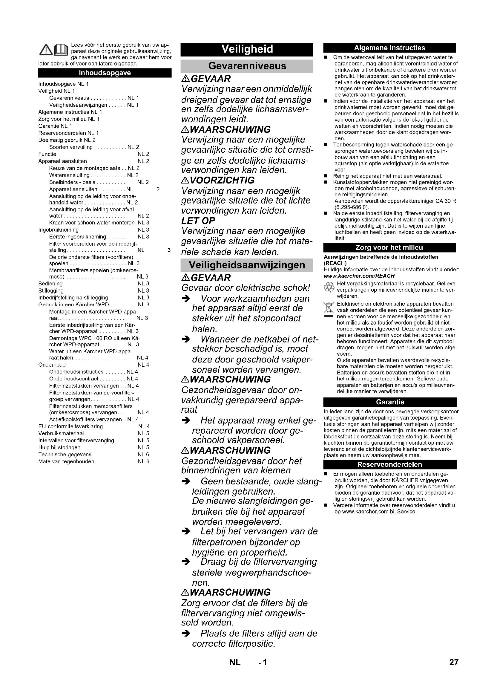 Chairman of the Board of ManagementDirector Regulatory Affairs & Certification 24 IT- 5 Materiale di consumo Denominazione Descrizione Codice N° Filtro fine Primo livello filtrante per la ritenuta dello sporco grossolano 6.640-765.0 Filtro a carboni attivi (granulato) Secondo livello filtrante per la separazione preliminare di sostanze dannose 6.640-766.0 Filtro a carboni attivi (blocco) Terzo livello filtrante per la separazione di sostanze dannose 6.640-767.0 Filtro a membrana (osmosi inversa) Quarto livello filtrante per la desalinizzazione 6.640-783.0 Filtro a carboni attivi superiore Quinto livello filtrante per assicurare il gusto neutro dopo l'osmosi inversa 6.640-769.0 Intervallo di cambio filtro Filtro fine 3 - 6 Mensile o secondo necessità (vedi capitolo: "Guida alla risoluzione dei guasti") Filtro a carboni attivi (granulato) 6 - 12 Filtro a carboni attivi (blocco) 6 - 12 Filtro a membrana (osmosi inversa) 18 - 24 Filtro a carbone attivo 6 - 12 Guida alla risoluzione dei guasti Guasto Possibile causa Rimedio Nessuna emissione di acqua Spina di rete non inserita nella presa elettrica. Inserire la spina di alimentazione. Nessuna alimentazione di acqua Assicurare l'alimentazione di acqua Pressostato del dispositivo guasto Contattare il servizio di assistenza clienti. Guasto della valvola elettromagnetica. Contattare il servizio di assistenza clienti. Ridotta emissione di acqua La pompa non si accende Controllare la pompa. Valvola di by-pass aperta Chiudere la valvola di by-pass. Filtro fine otturato. Sostituire il filtro fine. Filtro a membrana (osmosi inversa) otturato. Sostituire il filtro a membrana (osmosi inver- sa). La pompa non si arresta Pressostato sull'uscita dispositivo guasto. Contattare il servizio di assistenza clienti. La pompa non si accende. Pressostato sull'uscita dispositivo guasto. Contattare il servizio di assistenza clienti. Filtro fine otturato. Sostituire il filtro fine. Ingresso pressostato difettoso. Contattare il servizio di assistenza clienti. Nessuna alimentazione di acqua Controllare l’alimentazione dell'acqua. Spina di rete non inserita nella presa elettrica. Inserire la spina di alimentazione. Pompa difettosa. Contattare il servizio di assistenza clienti. Uscita acqua dall'alloggiamento filtro Alloggiamento filtro non serrato. Serrare l'alloggiamento filtro. Guarnizione ad anello alloggiamento filtro spostata o di- fettosa Controllare la guarnizione ad anello, inserirla correttamente e sostituirla in caso di danni. L'acqua fuoriesce solo dalla tubazione dell'acqua di scarico. Valvola di by-pass aperta Chiudere la valvola di by-pass. Filtro a membrana (osmosi inversa) otturato. Sostituire il filtro a membrana (osmosi inver- sa). Pompa difettosa. Gusto forte dell'acqua potabile Filtro ai carboni attivi superiore usurato. Sostituire il filtro a carboni attivi superiore. La pompa si interrompe e riprende dopo poco. Difetto di tenuta/fuoriuscita di acqua/perdita di pressione nell’apparecchio o nel sistema di condotte successivo. Serrare a fondo l’alloggiamento filtro. Chiudere completamente il rubinetto dell’ac- qua. Ricercare la causa della perdita ed eliminarla. Valvola di non ritorno nell’apparecchio difettosa Contattare il servizio di assistenza clienti. 25IT- 6 Dati tecnici WPC 100 RO Tensione d’esercizio V/~/Hz 110...240/1/50-60 Potenza W80 Sicurezza minima della rete A6 Pressione di mandata dell'acqua MPa (bar) 0,1...0,3 (1...3) Temperatura della mandata d'acqua °C 5...45 Potenza filtro l/h 70 Potenza filtro (max.) l/h 100 Temperatura ambiente °C 5...45 Larghezza mm 372 Profondità mm 240 Altezza mm 530 Peso (vuoto) kg 13,45 Peso, pronto per l'uso (riempito di acqua e con accessori) kg 17,86 Pressione acusti durante il funzionamento normale dB(A) < 60 Materiali / Omologazioni In conformità alle regole generalmente riconosciute della tecnica, tutti i componenti di conduzione dell’acqua sono adatti all’impiego per il contatto diretto con acqua potabile. Grado di ritenuta Il grado di ritenuta di sostanze chimiche dannose, agenti patogeni biologici e sporcizia può essere determinato in base alla seguente tabella (valori approssimativi). L'effettiva capacità di ritenuta dipende dal grado di sporcizia! Batteri Grado di ritenuta fino a 99,99% Cloro Grado di ritenuta fino a 100% Sali (sodio, potassio, calcio...) Grado di ritenuta fino a 90% Alluminio Grado di ritenuta fino a 98% Arsenico Grado di ritenuta fino a 88% Metalli pesanti (ad esempio: piombo) Grado di ritenuta fino a 99% Nitrato Grado di ritenuta fino a 50% Erbicidi (glifosato) Grado di ritenuta fino a 60% Residui di prodotti farmaceutici Grado di ritenuta fino a 99,9% Residui di ormoni Grado di ritenuta fino a 99,95% Coloranti Grado di ritenuta fino a 100% 26 IT- 1 Lees vóór het eerste gebruik van uw ap-paraat deze originele gebruiksaanwijzing, ga navenant te werk en bewaar hem voor later gebruik of voor een latere eigenaar. GEVAAR Verwijzing naar een onmiddellijk dreigend gevaar dat tot ernstige en zelfs dodelijke lichaamsver- wondingen leidt. 몇 WAARSCHUWING Verwijzing naar een mogelijke gevaarlijke situatie die tot ernsti- ge en zelfs dodelijke lichaams- verwondingen kan leiden. 몇 VOORZICHTIG Verwijzing naar een mogelijk gevaarlijke situatie die tot lichte verwondingen kan leiden. LET OP Verwijzing naar een mogelijke gevaarlijke situatie die tot mate- riele schade kan leiden. GEVAAR Gevaar door elektrische schok! Voor werkzaamheden aan het apparaat altijd eerst de stekker uit het stopcontact halen. Wanneer de netkabel of net- stekker beschadigd is, moet deze door geschoold vakper- soneel worden vervangen. 몇 WAARSCHUWING Gezondheidsgevaar door on- vakkundig gerepareerd appa- raat Het apparaat mag enkel ge- repareerd worden door ge- schoold vakpersoneel. 몇 WAARSCHUWING Gezondheidsgevaar door het binnendringen van kiemen Geen bestaande, oude slang- leidingen gebruiken. De nieuwe slangleidingen ge- bruiken die bij het apparaat worden meegeleverd. Let bij het verv