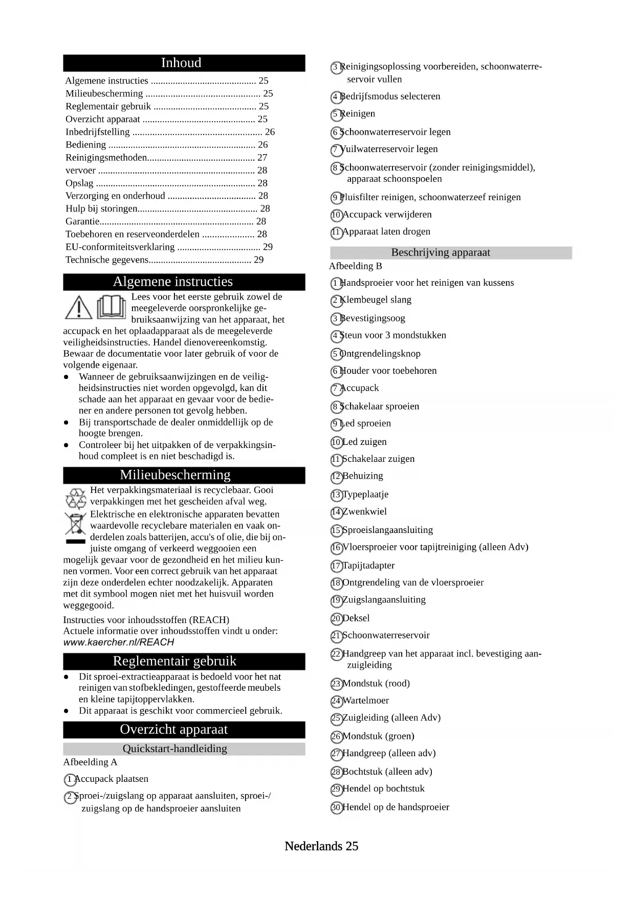 - 0,2Nederlands 25 Inhoud Algemene instructies Lees voor het eerste gebruik zowel de meegeleverde oorspronkelijke ge- bruiksaanwijzing van het apparaat, het accupack en het oplaadapparaat als de meegeleverde veiligheidsinstructies. Handel dienovereenkomstig. Bewaar de documentatie voor later gebruik of voor de volgende eigenaar. ● Wanneer de gebruiksaanwijzingen en de veilig- heidsinstructies niet worden opgevolgd, kan dit schade aan het apparaat en gevaar voor de bedie- ner en andere personen tot gevolg hebben. ● Bij transportschade de dealer onmiddellijk op de hoogte brengen. ● Controleer bij het uitpakken of de verpakkingsin- houd compleet is en niet beschadigd is. Milieubescherming Het verpakkingsmateriaal is recyclebaar. Gooi verpakkingen met het gescheiden afval weg. Elektrische en elektronische apparaten bevatten waardevolle recyclebare materialen en vaak on- derdelen zoals batterijen, accu's of olie, die bij on- juiste omgang of verkeerd weggooien een mogelijk gevaar voor de gezondheid en het milieu kun- nen vormen. Voor een correct gebruik van het apparaat zijn deze onderdelen echter noodzakelijk. Apparaten met dit symbool mogen niet met het huisvuil worden weggegooid. Instructies voor inhoudsstoffen (REACH) Actuele informatie over inhoudsstoffen vindt u onder: www.kaercher.nl/REACH Reglementair gebruik ● Dit sproei-extractieapparaat is bedoeld voor het nat reinigen van stofbekledingen, gestoffeerde meubels en kleine tapijtoppervlakken. ● Dit apparaat is geschikt voor commercieel gebruik. Overzicht apparaat Quickstart-handleiding Afbeelding A 1 Accupack plaatsen 2 Sproei-/zuigslang op apparaat aansluiten, sproei-/ zuigslang op de handsproeier aansluiten 3 Reinigingsoplossing voorbereiden, schoonwaterre- servoir vullen 4 Bedrijfsmodus selecteren 5 Reinigen 6 Schoonwaterreservoir legen 7 Vuilwaterreservoir legen 8 Schoonwaterreservoir (zonder reinigingsmiddel), apparaat schoonspoelen 9 Pluisfilter reinigen, schoonwaterzeef reinigen 10 Accupack verwijderen 11 Apparaat laten drogen Beschrijving apparaat Afbeelding B 1 Handsproeier voor het reinigen van kussens 2 Klembeugel slang 3 Bevestigingsoog 4 Steun voor 3 mondstukken 5 Ontgrendelingsknop 6 Houder voor toebehoren 7 Accupack 8 Schakelaar sproeien 9 Led sproeien 10 Led zuigen 11 Schakelaar zuigen 12 Behuizing 13 Typeplaatje 14 Zwenkwiel 15 Sproeislangaansluiting 16 Vloersproeier voor tapijtreiniging (alleen Adv) 17 Tapijtadapter 18 Ontgrendeling van de vloersproeier 19 Zuigslangaansluiting 20 Deksel 21 Schoonwaterreservoir 22 Handgreep van het apparaat incl. bevestiging aan- zuigleiding 23 Mondstuk (rood) 24 Wartelmoer 25 Zuigleiding (alleen Adv) 26 Mondstuk (groen) 27 Handgreep (alleen adv) 28 Bochtstuk (alleen adv) 29 Hendel op bochtstuk 30 Hendel op de handsproeier Algemene instructies p. 25