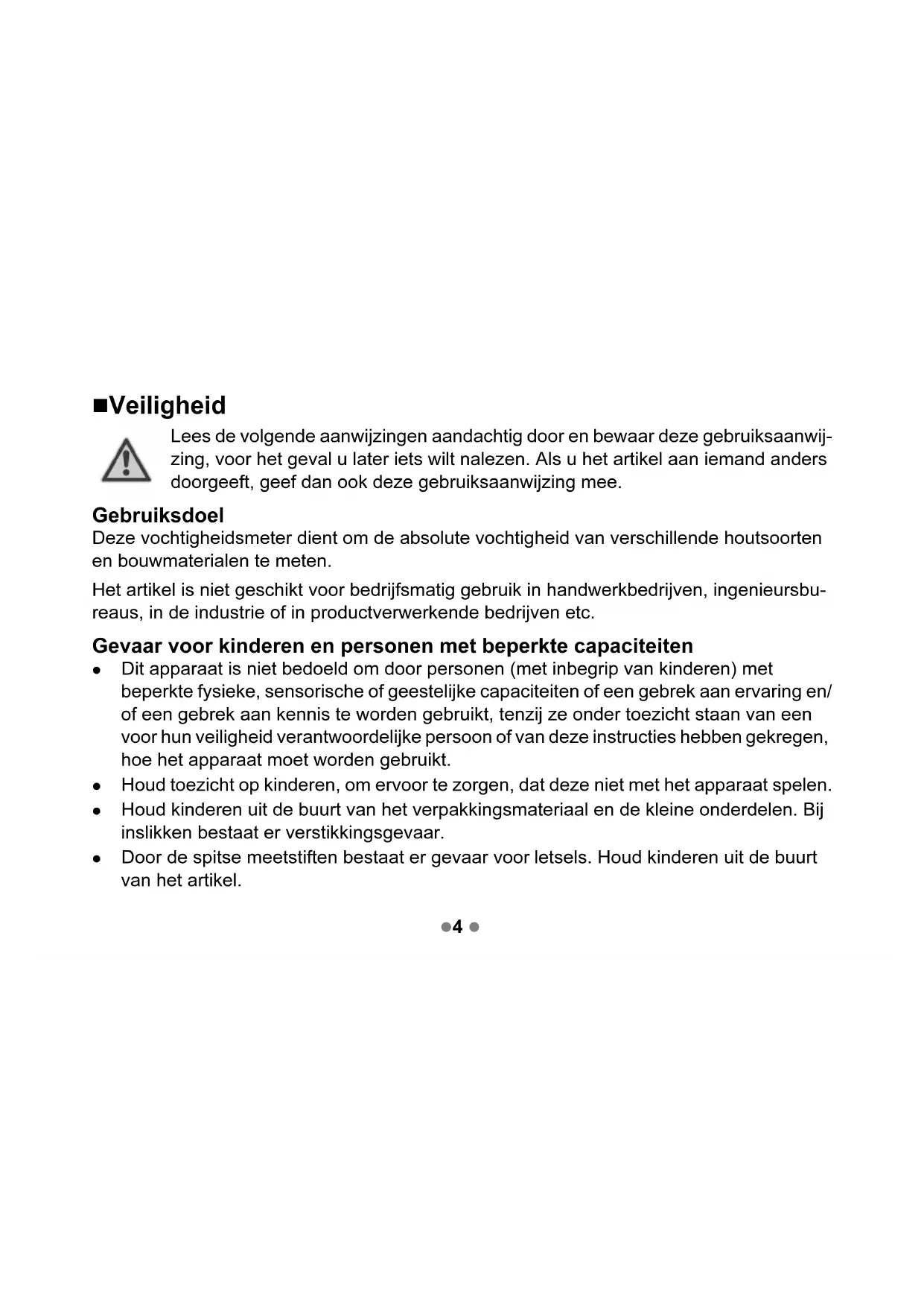 - Garantiebewijs Druckbuch Feuchtigkeitsmesser Belgien.book Seite 3 Freitag, 1. Juni 2012 12:34 12 4 Veiligheid Lees de volgende aanwijzingen aandachtig door en bewaar deze gebruiksaanwij- zing, voor het geval u later iets wilt nalezen. Als u het artikel aan iemand anders doorgeeft, geef dan ook deze gebruiksaanwijzing mee. Gebruiksdoel Deze vochtigheidsmeter dient om de absolute vochtigheid van verschillende houtsoorten en bouwmaterialen te meten. Het artikel is niet geschikt voor bedrijfsmatig gebruik in handwerkbedrijven, ingenieursbu- reaus, in de industrie of in productverwerkende bedrijven etc. Gevaar voor kinderen en personen met beperkte capaciteiten Dit apparaat is niet bedoeld om door personen (met inbegrip van kinderen) met beperkte fysieke, sensorische of geestelijke capaciteiten of een gebrek aan ervaring en/ of een gebrek aan kennis te worden gebruikt, tenzij ze onder toezicht staan van een voor hun veiligheid verantwoordelijke persoon of van deze instructies hebben gekregen, hoe het apparaat moet worden gebruikt. Houd toezicht op kinderen, om ervoor te zorgen, dat deze niet met het apparaat spelen. Houd kinderen uit de buurt van het verpakkingsmateriaal en de kleine onderdelen. Bij inslikken bestaat er verstikkingsgevaar. Door de spitse meetstiften bestaat er gevaar voor letsels. Houd kinderen uit de buurt van het artikel. Druckbuch Feuchtigkeitsmesser Belgien.book Seite 4 Freitag, 1. Juni 2012 12:34 12 5 p. 43