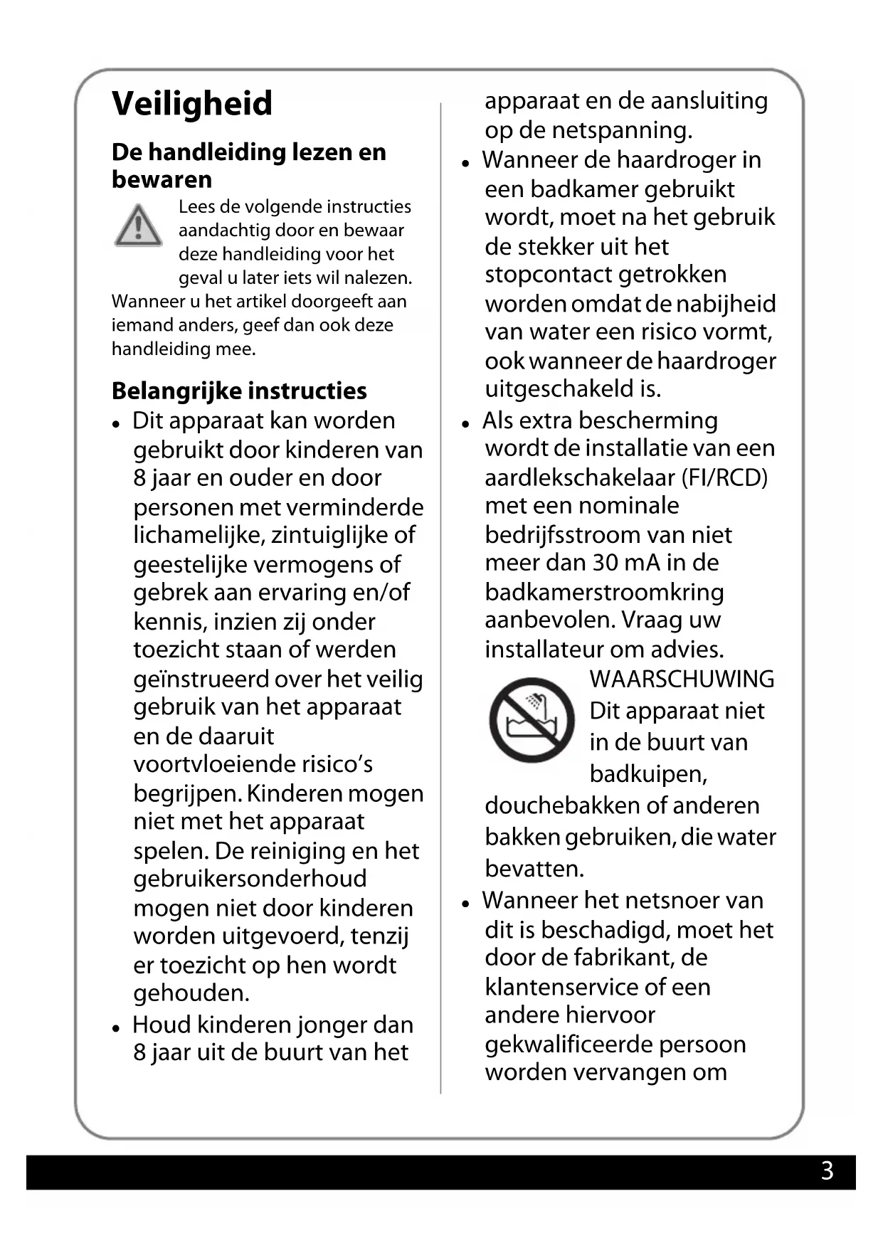 - Afvoer Op het netsnoer van de haardroger zit een sticker met symbolen. Deze sticker mag niet verwijderd worden. Levering Haardroger Stylingmondstuk Stylingmondstuk voor krullen Diffusor Gebruiksaanwijzing Garantiekaart Profi Haartrockner BEL Druckbuch.book Seite 2 Montag, 16. August 2021 3:25 153 Veiligheid De handleiding lezen en bewaren Lees de volgende instructies aandachtig door en bewaar deze handleiding voor het geval u later iets wil nalezen. Wanneer u het artikel doorgeeft aan iemand anders, geef dan ook deze handleiding mee. Belangrijke instructies Dit apparaat kan worden gebruikt door kinderen van 8 jaar en ouder en door personen met verminderde lichamelijke, zintuiglijke of geestelijke vermogens of gebrek aan ervaring en/of kennis, inzien zij onder toezicht staan of werden geïnstrueerd over het veilig gebruik van het apparaat en de daaruit voortvloeiende risico’s begrijpen. Kinderen mogen niet met het apparaat spelen. De reiniging en het gebruikersonderhoud mogen niet door kinderen worden uitgevoerd, tenzij er toezicht op hen wordt gehouden. Houd kinderen jonger dan 8 jaar uit de buurt van het apparaat en de aansluiting op de netspanning. Wanneer de haardroger in een badkamer gebruikt wordt, moet na het gebruik de stekker uit het stopcontact getrokken worden omdat de nabijheid van water een risico vormt, ook wanneer de haardroger uitgeschakeld is. Als extra bescherming wordt de installatie van een aardlekschakelaar (FI/RCD) met een nominale bedrijfsstroom van niet meer dan 30 mA in de badkamerstroomkring aanbevolen. Vraag uw installateur om advies. WAARSCHUWING Dit apparaat niet in de buurt van badkuipen, douchebakken of anderen bakken gebruiken, die water bevatten. Wanneer het netsnoer van dit is beschadigd, moet het door de fabrikant, de klantenservice of een andere hiervoor gekwalificeerde persoon worden vervangen om Profi Haartrockner BEL Druckbuch.book Seite 3 Montag, 16. August 2021 3:25 154 gevaarlijke situaties te voorkomen. Beoogd gebruik Deze haardroger dient voor het drogen en kappen van natuurlijk, menselijk haar. Synthetisch of kunsthaar mag niet behandeld worden met de haardroger. De haardroger is bedoeld voor privégebruik. Voor commercieel gebruik in bijvoorbeeld kapsalons of schoonheidsstudio’s is het niet geschikt. Gevaar voor kinderen en een uitgebreidere kring personen Houd kinderen uit de buurt van verpakkingsmateriaal. Bij inslikken bestaat er verstikkingsgevaar. Let er ook op, dat de zak van de verpakking niet over het hoofd wordt getrokken. Gevaar door elektriciteit De haardroger mag niet ondergedompeld worden in water of andere vloeistoffen en ermee in contact komen. Gevaar voor een elektrische schok! Gebruik het apparaat daarom ook niet in de buurt van vochtbronnen of buiten. Bedien de haardroger niet met natte handen. Sluit het apparaat aan op een correct geïnstalleerd stopcontact aan waarvan de spanning overeenkomt met de “Technische gegevens”. Zorg ervoor dat het stopcontact gemakkelijk toegankelijk is zodat u de stekker van de haardroger snel uit het stopcontact kunt trekken als dat nodig is. Gebruik het apparaat niet: – wanneer apparaat, netsnoer of stekker beschadigd zijn, – het apparaat gevallen is. Zorg ervoor dat het netsnoer niet beschadigd wordt door scherpe randen of hete voorwerpen. Trek de stekker uit het stopcontact: – zodra u de haardroger niet gebruikt, – na elk gebruik, – voor u het apparaat schoonmaakt of opbergt, – wanneer er tijdens het gebruik blijkbaar een storing optreedt, – bij onweer. Trek dan altijd aan de stekker, niet aan de voedingskabel. Voer geen wijzigingen uit aan het artikel. Laat reparaties alleen door een vakwerkplaats uitvoeren. Let ook op de garantiebepalingen. Gevaar voor brand/ brandwonden en/of explosie Schakel de haardroger altijd uit wanneer u hem neerlegt. Leg hem dan alleen op vaste en hittebestendige oppervlakken. Ook na gebruik blijft de haardroger nog langere tijd warm. Laat de haardroger voldoende afkoelen voor u hem reinigt of opbergt. Spuit geen haarlak wanneer het apparaat ingeschakeld is. Er is gevaar op brand of explosie! Gebruik de haardroger niet zonder toezicht. Laat hem ook bij het afkoelen niet alleen. Profi Haartrockner BEL Druckbuch.book Seite 4 Montag, 16. August 2021 3:25 155 Gevaar voor letsels Steek nooit vingers of voorwerpen in de roosteropeningen. Zorg ervoor dat u niet struikelt over de voedingskabel. Aanwijzing - materiële schade Dek de rooster van de luchtinlaat tijdens de werking niet af en reinig het van tijd tot tijd. Anders kan het gebeuren dat de ingebouwde bescherming tegen oververhitting de haardroger uitschakelt. Meer informatie hierover vindt u in het hoofdstuk “Bescherming tegen oververhitting”. Gebruik de haardroger niet op pruiken of haarstukken uit synthetisch materiaal. Richt de hete luchtstraal niet op dieren, planten of voorwerpen. Symbolen in deze handleiding Conformiteits- verklaring De conformiteit van het product met de wettelijk voorgeschreven normen wordt gewaarborgd. De volledige Conformiteitsverklaring vindt u op het internet op www.gt-support.de. Met dit symbool gemarkeerde producten voldoen aan alle toepasselijke Gemeenschapsvoorschrif ten van de Europese Economische Ruimte. Dit symbool in combinatie met het signaalwoord WAARSCHUWING waarschuwt voor gevaren waarbij gevaar op verwonding bestaat. Dit symbool in combinatie met het signaalwoord AANWIJZING waarschuwt voor mogelijke materiële schade. Voor het overige wijst het op nuttige aanvullende informatie. Profi Haartrockner BEL Druckbuch.book Seite 5 Montag, 16. August 2021 3:25 156 Onderdelen en bedieningselementen Uitpakken en controleren p. 11