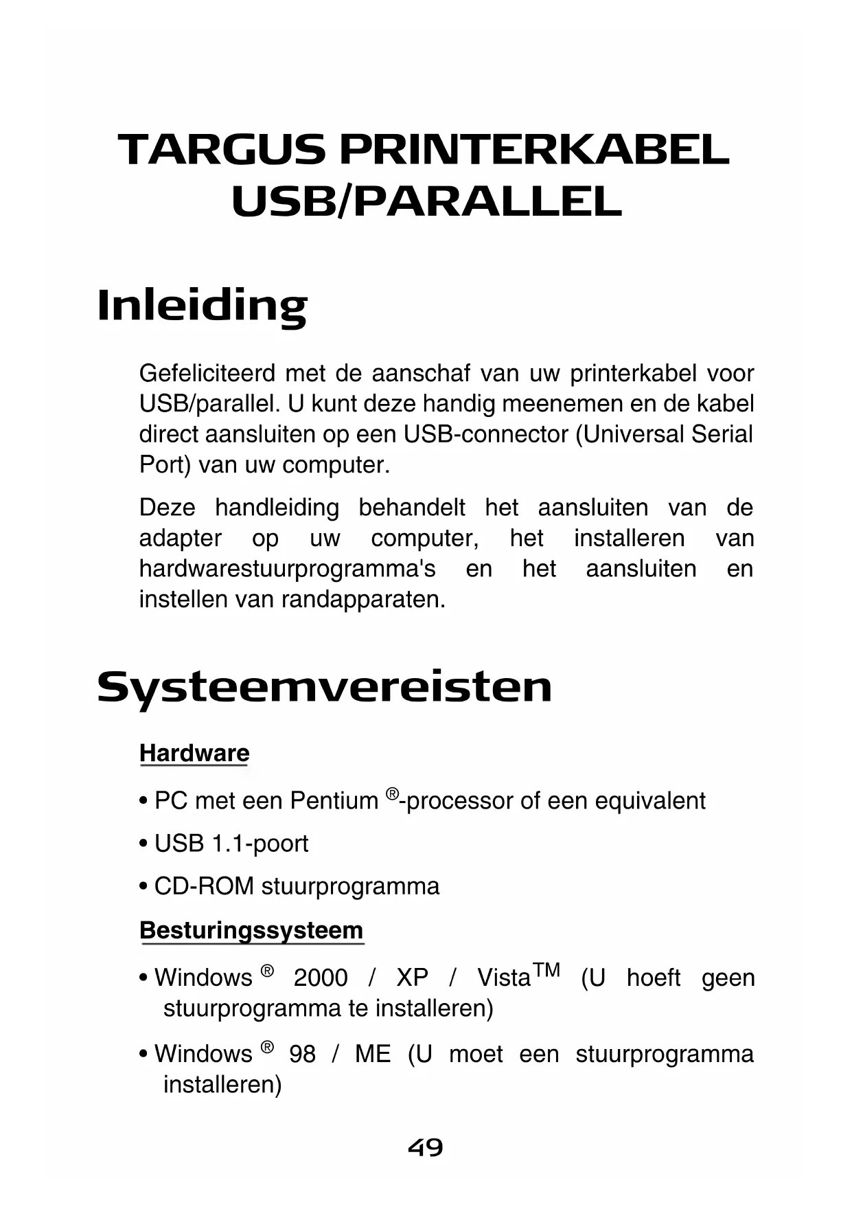 98 / ME (U moet een stuurprogramma installeren)50 Targus printerkabel USB/parallel Apparaat en stuurprogramma's installeren Voor het werken met de USB/parallel-printer moet u eerst de stuurprogramma's op uw computer installeren als het Windows
