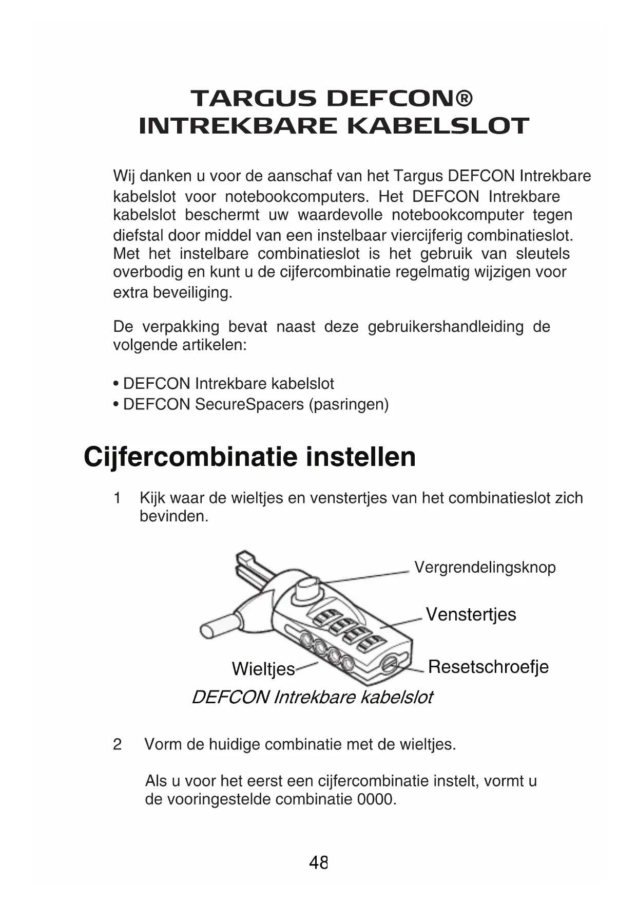 Verwijder het DEFCON Intrekbare kabelslot uit het veiligheidsslot van de notebookcomputer. 53Technische ondersteuning Met technische vragen kunt u terecht op: Internet http://www.targus.com/support Engels http://www.targus.com/uk/support.asp Duits http://www.targus.com/de/support.asp Spaans http://www.targus.com/sp/support.asp Italiaans http://www.targus.com/it/support.asp Ook kunnen wij uw vragen tevens telefonisch beantwoorden. België 02-717-2451 Denemarken 45 0 35-25-87 51 Frankrijk 01-64-53-9151 Duitsland 0211-6579-1151 Finland 922948016 Italië 02-4827-1151 Nederland 02 0504 0671 Noorwegen 022577729 Oostenrijk 01 795 676 42 Portugal +351 21 415 4123 Spanje 91-745-6221 Zweden 08-751-4058 Zwitserland 01-212-0007 Groot-Brittannië 020-7744-0330 Oost-Europa en overige landen +31 0 20-5040671 Frans http://www.targus.com/fr/support.asp 54Productregistratie Targus raadt aan dat u uw Targus-product zo snel mogelijk na de aankoop registreert. U kunt uw Targus-product registreren op: http://www.targus.com/registration.asp U zult uw volledige naam, e-mailadres, telefoonnummer en bedrijfsinformatie (indien van toepassing) moeten opgeven. Garantie Targus biedt de garantie dat dit product gedurende twee jaar vrij is van tekortkomingen in materiaal en vakmanschap. Als uw Targus-product binnen die periode defect raakt, zullen wij het onmiddellijk herstellen of vervangen. Deze garantie is niet van toepassing op schade door ongelukken, slijtage of bijkomende of incidentele schade. Targus is onder geen beding aansprakelijk voor verlies of beschadiging van een computer, verlies of beschadiging van programma's, records of gegevens, of bijkomende of gevolgschade, zelfs als Targus is gewezen op die mogelijkheid. Deze garantie is niet van invloed op uw wettelijke rechten. 55DEFCON Intrekbare kabelslot cijfercombinatie Vergrendelingsknop Venstertjes Uw cijfercombinatie noteren Noteer gemakshalve uw cijfercombinatie in de daarvoor bestemde ruimte. Lees de combinatie van links naar rechts af, te beginnen met het cijfer dat zich het dichtst bij de vergrendelingsknop bevindt. Targus wijst alle aansprakelijkheid voor verloren, misplaatste of vergeten cijfercombinaties van de hand. 56Definir a combinação numérica DEFCON Marcadores rotativos decombinação numéricaParafuso de redefinição Mostradores da combinação numérica TARGUS DEFCON®