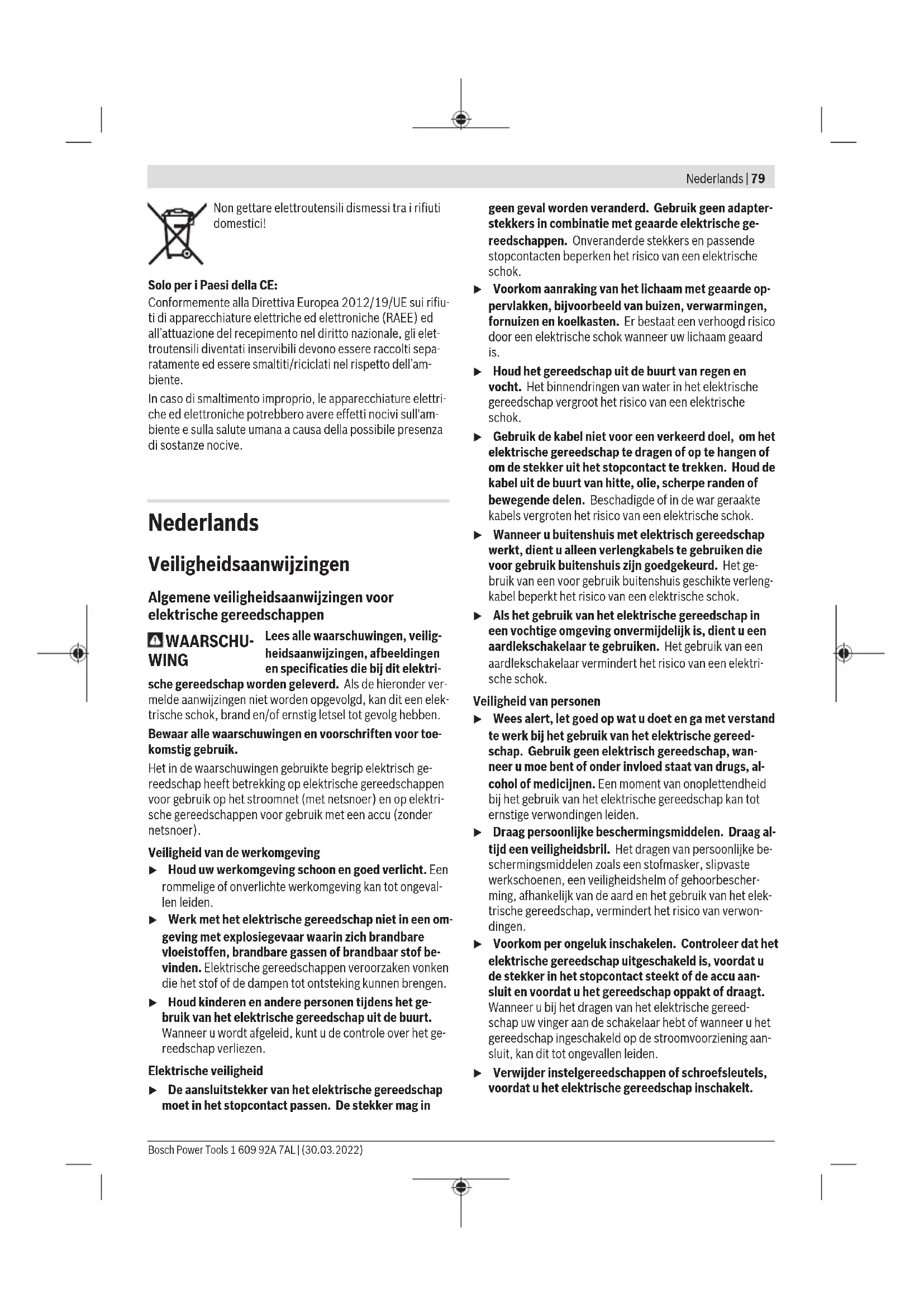 De aangegeven waarden van de toerentalstanden zijn richt- waarden. Montage Veiligheidsvoorziening monteren u Trek vóór werkzaamheden aan het elektrische gereed- schap altijd de stekker uit het stopcontact. Aanwijzing: Na breuk van de slijpschijf tijdens het gebruik of bij beschadiging van de opnamevoorzieningen bij de be- schermkap/het elektrische gereedschap moet het elektri- sche gereedschap zo spoedig mogelijk naar de klantenservi- ce worden opgestuurd. Zie voor adressen het gedeelte „Klantenservice en gebruiksadvies“. Beschermkap voor slijpen Leg de beschermkap (8) op de houder op het elektrische gereedschap tot de codeer- nokken van de beschermkap overeenstemmen met de houder. Druk daarbij op de ontgrendelingshendel (1) en houd deze ingedrukt. Duw de beschermkap (8) op de ashals tot de kraag van de beschermkap op de flens van het elektrische gereedschap zit en draai de beschermkap tot deze duidelijk hoorbaar vastklikt. Pas de positie van de beschermkap (8) aan de eisen van de bewerking aan. Druk hiervoor de ontgrendelingshendel (1) naar boven en draai de beschermkap (8) in de gewenste po- sitie. u Stel de beschermkap(8) steeds zodanig in dat beide nokken van de ontgrendelingshendel (1) in de betref- fende uitsparingen van de beschermkap (8) grijpen. u Stel de beschermkap (8) zodanig in dat er geen von- ken in de richting van de gebruiker vliegen. u De beschermkap (8) mag alleen bij bediening van de ontgrendelingshendel (1) verdraaid kunnen worden! Anders mag u het elektrische gereedschap in geen ge- val verder gebruiken, maar moet u het opsturen naar de klantenservice. Aanwijzing: De codeernokken op de beschermkap (8) zor- gen ervoor dat uitsluitend een bij het elektrische gereed- schap passende beschermkap gemonteerd kan worden. Afzuigkap voor schuren Voor het stofarm schuren van verf, lak en kunststoffen in combinatie met hardmetalen komschijven (11) kunt u de af- zuigkap (7) gebruiken. De afzuigkap (7) is niet geschikt voor het bewerken van metaal. Op de afzuigkap (7) kan een geschikte Bosch stofzuiger wor- den aangesloten. Steek hiervoor de zuigslang met afzui- gadapter in de daarvoor bestemde opname-opening van de afzuigkap. Beschermkap voor doorslijpen u Gebruik voor het doorslijpen altijd de beschermkap voor doorslijpen (9) of de beschermkap voor slijpen (8) samen met de afdekking voor doorslijpen (27). u Zorg bij het doorslijpen van steen voor voldoende stofafzuiging. De beschermkap voor doorslijpen (9) wordt net als de be- schermkap voor slijpen (8) gemonteerd. Afdekking voor doorslijpen van metaal Monteer de afdekking voor doorslijpen (27) van metaal op de beschermkap voor slijpen (8) (zie afbeelding A): draai de bevestigingsbeugel terug (➊). Steek de afdekking (27) op de beschermkap voor slijpen (8) (➋). Duw de bevestigings- beugel stevig tegen de beschermkap (8) (➌). Voor demontage (zie afbeelding B) drukt u op de knop op de bevestigingsbeugel (➊) en draait deze terug (➋). Trek de af- dekking (27) van de beschermkap (8) af (➌). Afdekking voor doorslijpen van kunststof Steek de afdekking voor doorslijpen(27) van kunststof op de beschermkap voor slijpen(8) (zie afbeeldingC). De afdekking(27) klikt hoorbaar en zichtbaar vast op de beschermkap(8). Voor demontage (zie afbeeldingD) ontgrendelt u de afdekking(27) op de beschermkap(8) (➊) links of rechts en trekt u de afdekking eraf (➋). Stofafzuigkap voor doorslijpen met geleidebeugels De stofafzuigkap voor doorslijpen met geleidebeugels(19) wordt net als de beschermkap voor slijpen gemonteerd. Door de extra handgreep (6)/(32) door de beugel op de af- zuigkap heen aan het drijfwerkhuis te bevestigen, wordt het elektrische gereedschap vast verbonden met de afzuigkap. Op de afzuigkap met geleidebeugels (19) kan een geschikte Bosch stofzuiger worden aangesloten. Steek hiervoor de zuigslang met afzuigadapter in de daarvoor bestemde opna- me-opening van de afzuigkap. Aanwijzing: De wrijving die door het stof in de zuigslang en in het accessoire tijdens het afzuigen ontstaat, veroorzaakt een elektrostatische oplading die de gebruiker als statische ontlading kan voelen (afhankelijk van omgevingsfactoren en zijn lichamelijke gesteldheid). Bosch adviseert algemeen het gebruik van een antistatische zuigslang (accessoire) voor het opzuigen van fijnstof en droge materialen. Handbescherming u Monteer voor werkzaamheden met het rubber schuur- plateau (22) of met de komstaalborstel/kegelborstel/ diamantboorkroon altijd de handbescherming (21). Bevestig de handbescherming (21) met de extra handgreep (6)/(32). 1 609 92A 7AL | (30.03.2022) Bosch Power ToolsNederlands | 87 Standaard extra handgreep/trillingsdempende extra handgreep Schroef de extra handgreep (6)/(32) afhankelijk van de werkwijze rechts of links van de machinekop vast. u Gebruik uw elektrische gereedschap alleen met de ex- tra handgreep (6)/(32). u Gebruik het elektrische gereedschap niet meer, wan- neer de extra handgreep (6)/(32) beschadigd is. Ver- ander de extra handgreep (6)/(32) op geen enkele wijze. Dankzij de trillingsdempen- de extra handgreep (32) kunt u met weinig trillingen en daardoor aangenamer en veiliger werken. Slijpgereedschap monteren u Trek vóór werkzaamheden aan het elektrische gereed- schap altijd de stekker uit het stopcontact. u Raak de (door)slijpschijven niet aan, voordat ze afge- koeld zijn. De schijven worden bij het werken erg heet. Reinig de slijpas (18) en alle te monteren delen. Druk voor het vastspannen en losmaken van de slijpgereed- schappen op de asblokkeerknop (2) om de slijpas vast te zetten. u Bedien de asblokkeerknop alleen, als de slijpas stil- staat. Anders kan het elektrische gereedschap bescha- digd raken. (Door)slijpschijf Let op de afmetingen van de slijpaccessoires. De gatdiame- ter moet bij de opnameflens passen. Gebruik geen adapters of reduceerstukken. Let er bij het gebruik van diamantdoorslijpschijven op dat de draairichtingpijl op de diamantdoorslijpschijf en de draai- richting van het elektrisch gereedsc