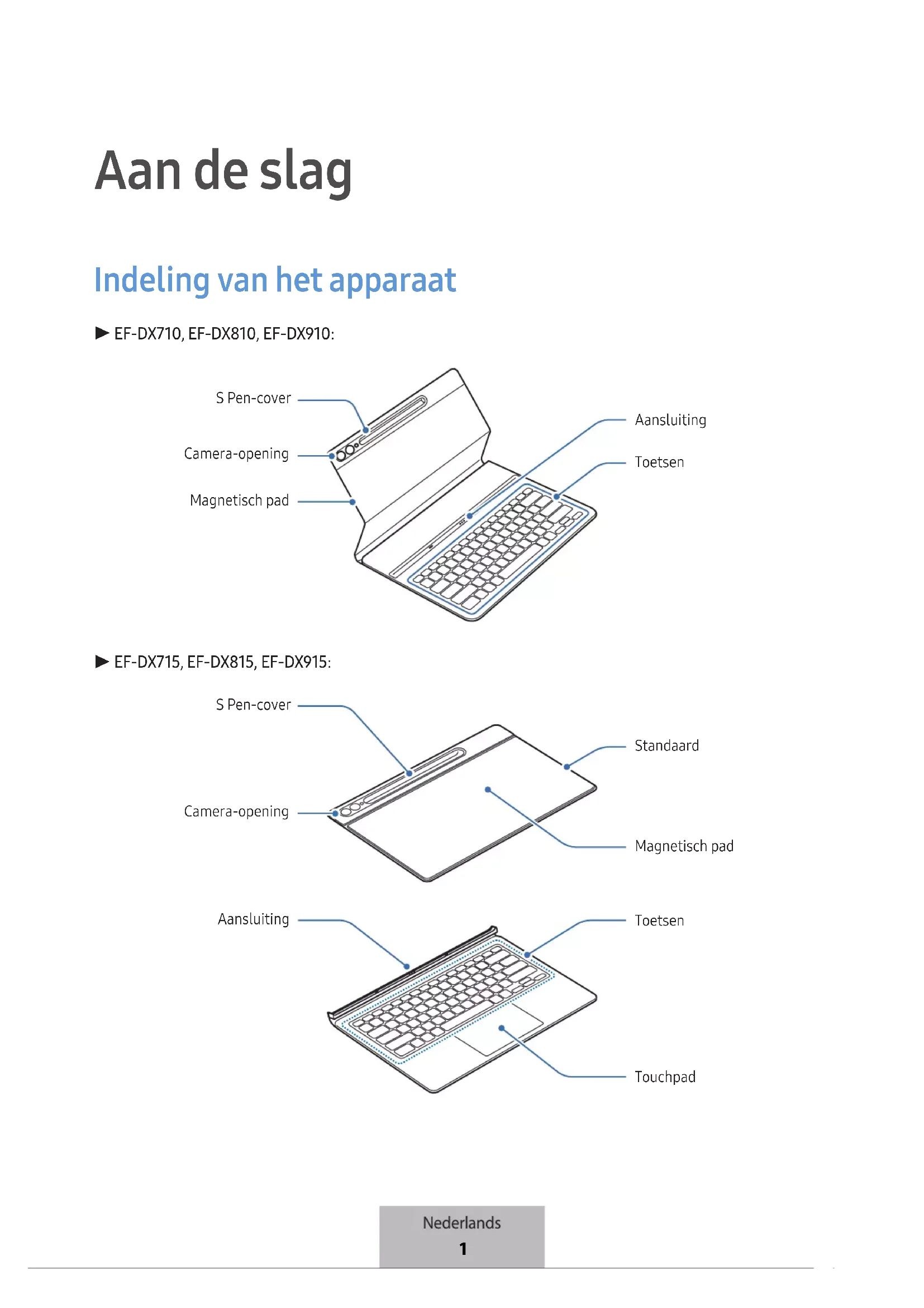 De toetsen gebruiken Stel de invoertaal in op de tablet voordat u het toetsenbord gebruikt. Raadpleeg de gebruiksaanwijzing van de tablet voor meer informatie over het instellen van de invoertaal. EF-DX710, EF-DX715: DeX
