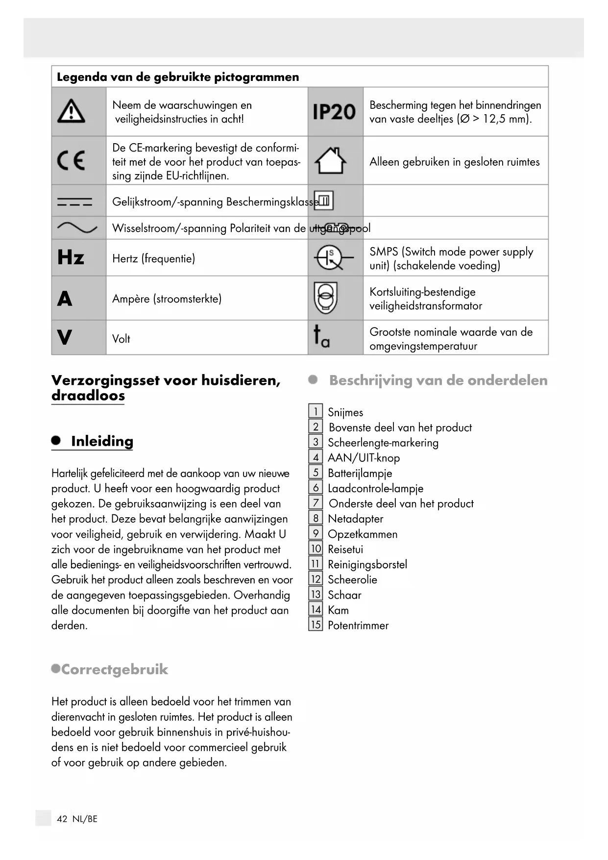 product. U heeft voor een hoogwaardig product gekozen. De gebruiksaanwijzing is een deel van het product. Deze bevat belangrijke aanwijzingen voor veiligheid, gebruik en verwijdering. Maakt U zich voor de ingebruikname van het product met alle bedienings- en veiligheidsvoorschriften vertro uwd. Gebruik het product alleen zoals beschreven en voor de aangegeven toepassingsgebieden. Overhandig alle documenten bij doorgifte van het product aan derden. Correct gebruik Het product is alleen bedoeld voor het trimmen van dierenvacht in gesloten ruimtes. Het product is alleen bedoeld voor gebruik binnenshuis in privé-huishou- dens en is niet bedoeld voor commercieel gebruik of voor gebruik op andere gebieden. Beschrijving van de onderdelen