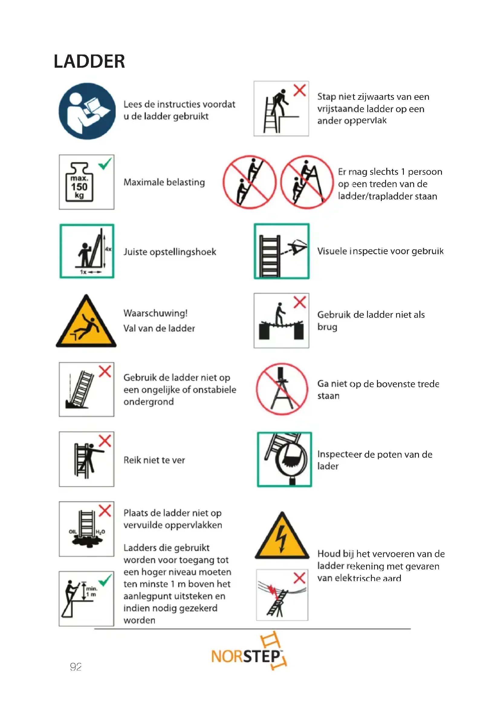 Overschrijd de maximum toegestane belasting voor het type ladder niet; Reik niet te ver. Gebruikers dienen hun riemgesp (navel) binnen de stijlen te houden en met beide voeten op dezelfde trede/sport te staan tijdens de werkzaamheden; Stap niet van een enkele ladder af op een hoger niveau zonder aanvullende veiligheidsmaatregelen, zoals vastzetten of door gebruik te maken van een geschikt stabiliteitshulpmiddel; Gebruik vrijstaande ladders niet voor toegang tot een hoger niveau; Ga niet op de bovenste drie sporten van een enkele ladder staan; Ga niet op de bovenste twee treden/sporten staan van een vrijstaande ladder zonder een platform en een hand-/ knieleuning; Ga niet op de bovenste vier treden/sporten staan van een vrijstaande ladder met een uitschuifbaar bovendeel;. Ladders mogen alleen gebruikt worden voor licht werk met een korte tijdsduur; Gebruik niet-geleidende ladders voor onvermijdelijke elektrische werkzaamheden onder spanning; Gebruik de ladder niet buiten bij ongunstige weersomstandigheden, zoals bij sterke wind; Neem maatregelen zodat kinderen niet op de ladder kunnen spelen; Sluit deuren (behalve nooduitgangen) en ramen in het werkbereik zo mogelijk; Klim de ladder alleen op of af met uw gezicht naar de ladder toe; Houd de ladder goed vast wanneer u deze op-/afklimt. Houd de ladder met een hand vast terwijl u werkt of neem aanvullende veiligheidsmaatregelen indien dat niet mogelijk is; Gebruik de ladder niet als brug; Draag geen ongeschikt schoeisel tijdens het beklimmen van de ladder; Voorkom overmatige zijdelingse belasting, zoals het boren in steen en beton; Sta niet voor langere periodes op een ladder zonder regelmatige pauzes (vermoeidheid is een risico); Enkele ladders die gebruikt worden voor toegang tot een hoger niveau moeten ten minste 1 m boven het aanlegpunt uitsteken en indien nodig gezekerd worden; Draag geen zware of moeilijk hanteerbare materialen terwijl u een ladder beklimt; Voorkom werkzaamheden die ladders zijdelings belasten, zoals zijwaarts boren in massief materiaal (bijv. steen of beton);97