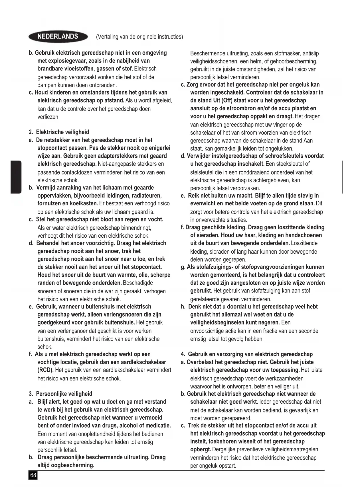 a. Houd uw werkomgeving schoon en opgeruimd. Op rommelige of donkere plekken kunnen gemakkelijk ongelukken gebeuren.68 (Vertaling van de originele instructies) NEDERLANDS b. Gebruik elektrisch gereedschap niet in een omgeving met explosiegevaar, zoals in de nabijheid van brandbare vloeistoffen, gassen of stof. Elektrisch gereedschap veroorzaakt vonken die het stof of de dampen kunnen doen ontbranden. c. Houd kinderen en omstanders tijdens het gebruik van elektrisch gereedschap op afstand. Als u wordt afgeleid, kan dat u de controle over het gereedschap doen verliezen.