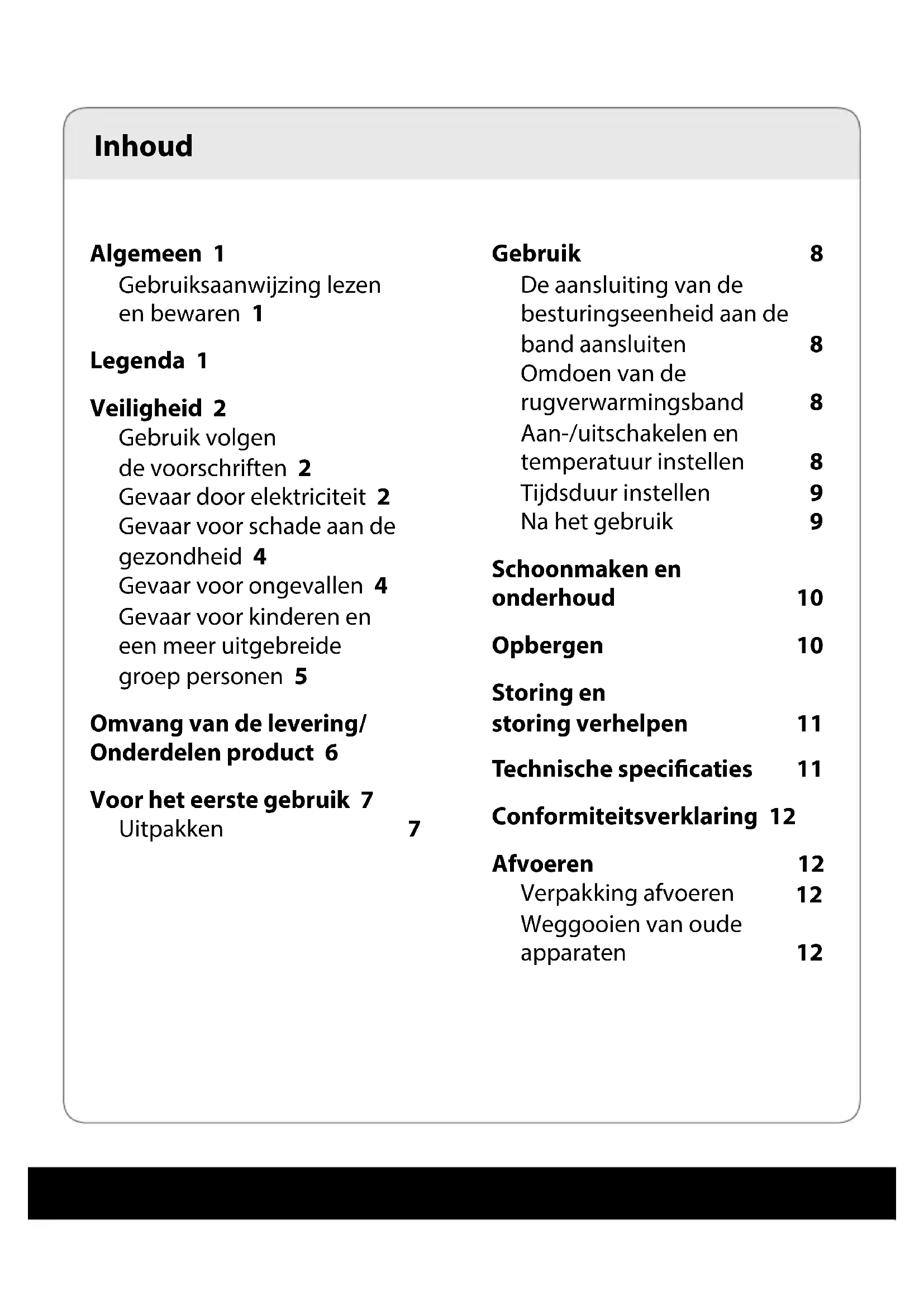 - De rugverwarmingsband mag niet worden gebruikt door personen of per- sonen die bescherming behoeven, die ongevoelig zijn voor warmte of die niet op oververhitting kunnen reageren. Gevaar voor ongevallen