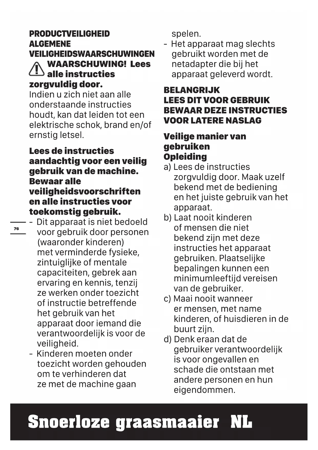Veilige manier van gebruiken Opleiding a) Lees de instructies zorgvuldig door. Maak uzelf bekend met de bediening en het juiste gebruik van het apparaat. b) Laat nooit kinderen of mensen die niet bekend zijn met deze instructies het apparaat gebruiken. Plaatselijke bepalingen kunnen een minimumleeftijd vereisen van de gebruiker. c) Maai nooit wanneer er mensen, met name kinderen, of huisdieren in de buurt zijn. d) Denk eraan dat de gebruiker verantwoordelijk is voor ongevallen en schade die ontstaan met andere personen en hun eigendommen.77 Snoerloze graasmaaier NL Voorbereiding a) Draag bij het maaien altijd stevige schoenen en een lange broek. Gebruik dit apparaat niet wanneer u op blote voeten of op open sandalen/slippers loopt. b) Inspecteer de omgeving van de gebruikte apparatuur en verwijder alle voorwerpen die door de machine weggeworpen zouden kunnen worden; c) Controleer voor het gebruik altijd of de messen, de bouten waarmee de messen vastzitten en het snijgedeelte niet versleten of beschadigd zijn. Vervang versleten of beschadigde messen en bouten in paren om zo de balans te bewaren. Vervang beschadigde en onleesbare labels. Bediening a) Maai alleen overdag of in goed kunstlicht. b) Gebruik het apparaat, voor zover mogelijk, niet in nat gras. c) Zorg er op hellingen altijd voor dat u stevig staat. d) Loop, ren niet; e) Een ronddraaiende machine op wielen gebruikt u evenwijdig aan hellingen, niet op en neer; f) Wees extra voorzichtig wanneer u op hellingen van richting verandert. g) Maai niet op zeer steile hellingen. h) Wees extra voorzichtig wanneer u het apparaat achteruit of naar u toe haalt.
