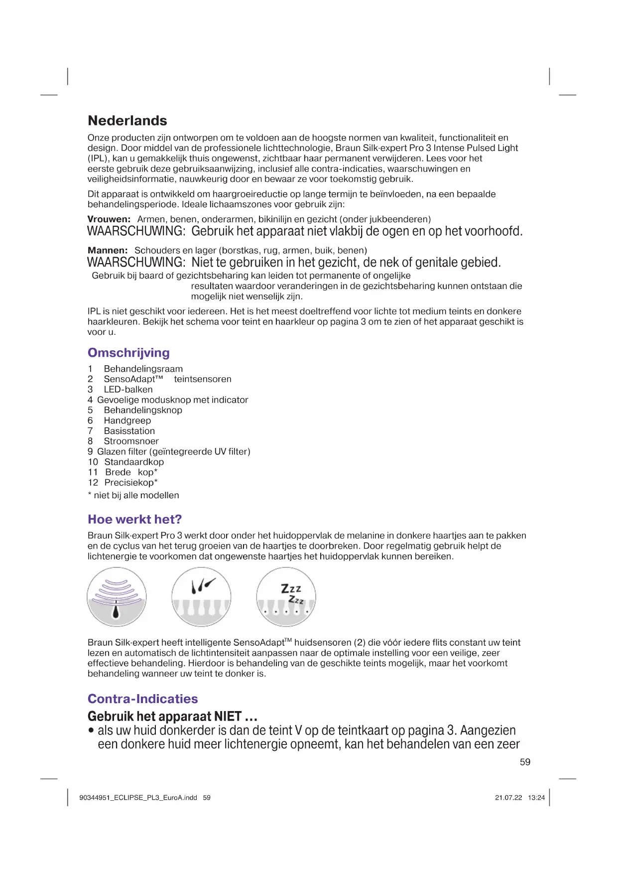Baard/gezichtsbeharing voor mannen Het wordt niet aangeraden om dit apparaat te gebruiken op zones met huidfillers. 90344951_ECLIPSE_PL3_EuroA.indd 6090344951_ECLIPSE_PL3_EuroA.indd 60 21.07.22 13:2421.07.22 13:2461 Gebruik het niet vaker dan eenmaal per week op dezelfde plek. Na langdurige of herhaalde behandeling op één plaats kan de huid beschadigd geraken. Veiligheidsvoorschriften voor de ogen Kijk niet direct in de glazen filter (9) of probeer het apparaat niet in de buurt van de ogen te activeren. Om uw ogen en die van mensen in uw omgeving te beschermen, activeert het apparaat alleen als beide teintsensoren tegen de huid worden geplaatst. In het geval het apparaat aangaat wanneer beide sensoren NIET tegen de huid worden gehouden, STOP dan direct het gebruik van het apparaat en neem contact op met uw leverancier. Kans op oogletsels (mogelijk leidend tot verlies van het gezichtsvermogen) of huidletsels als de instructies niet opgevolgd worden. Bescherm de ogen tegen blootstelling. Gebruik het apparaat niet op de oogleden of in de buurt van de ogen. Voorzorgsmaatregelen