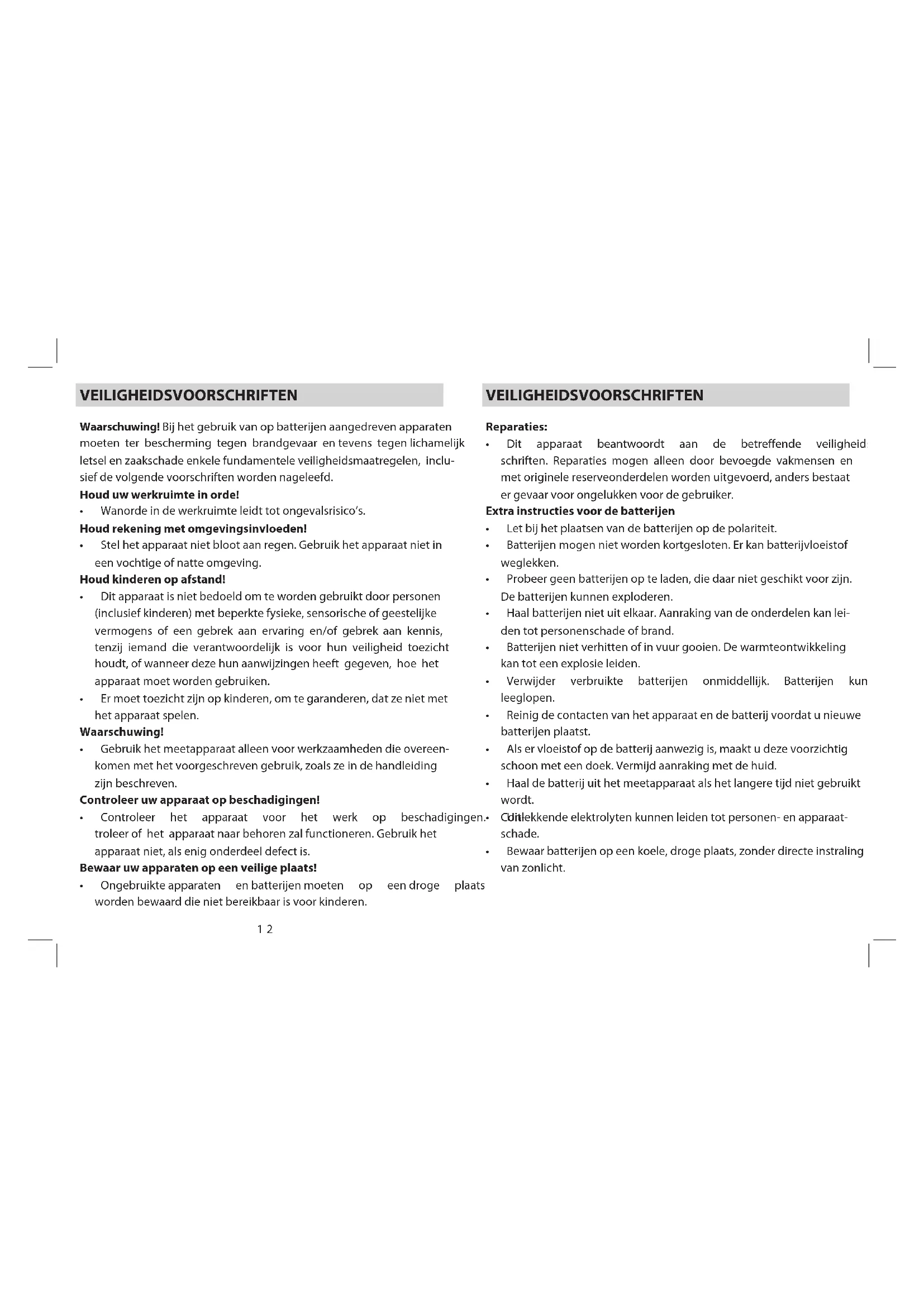 - Dit apparaat beantwoordt aan de betreffende veiligheidsvoor- schriften. Reparaties mogen alleen door bevoegde vakmensen en met originele reserveonderdelen worden uitgevoerd, anders bestaat er gevaar voor ongelukken voor de gebruiker. Extra instructies voor de batterijen