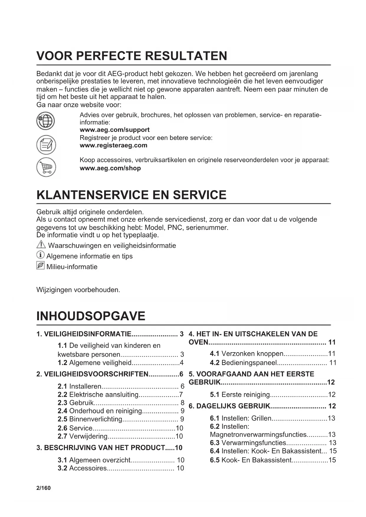 Bedankt dat je voor dit AEG-product hebt gekozen. We hebben het gecreëerd om jarenlang onberispelijke prestaties te leveren, met innovatieve technologieën die het leven eenvoudiger maken – functies die je wellicht niet op gewone apparaten aantreft. Neem een paar minuten de tijd om het beste uit het apparaat te halen. Ga naar onze website voor: Advies over gebruik, brochures, het oplossen van problemen, service- en reparatie- informatie: www.aeg.com/support Registreer je product voor een betere service: www.registeraeg.com Koop accessoires, verbruiksartikelen en originele reserveonderdelen voor je apparaat: www.aeg.com/shop
