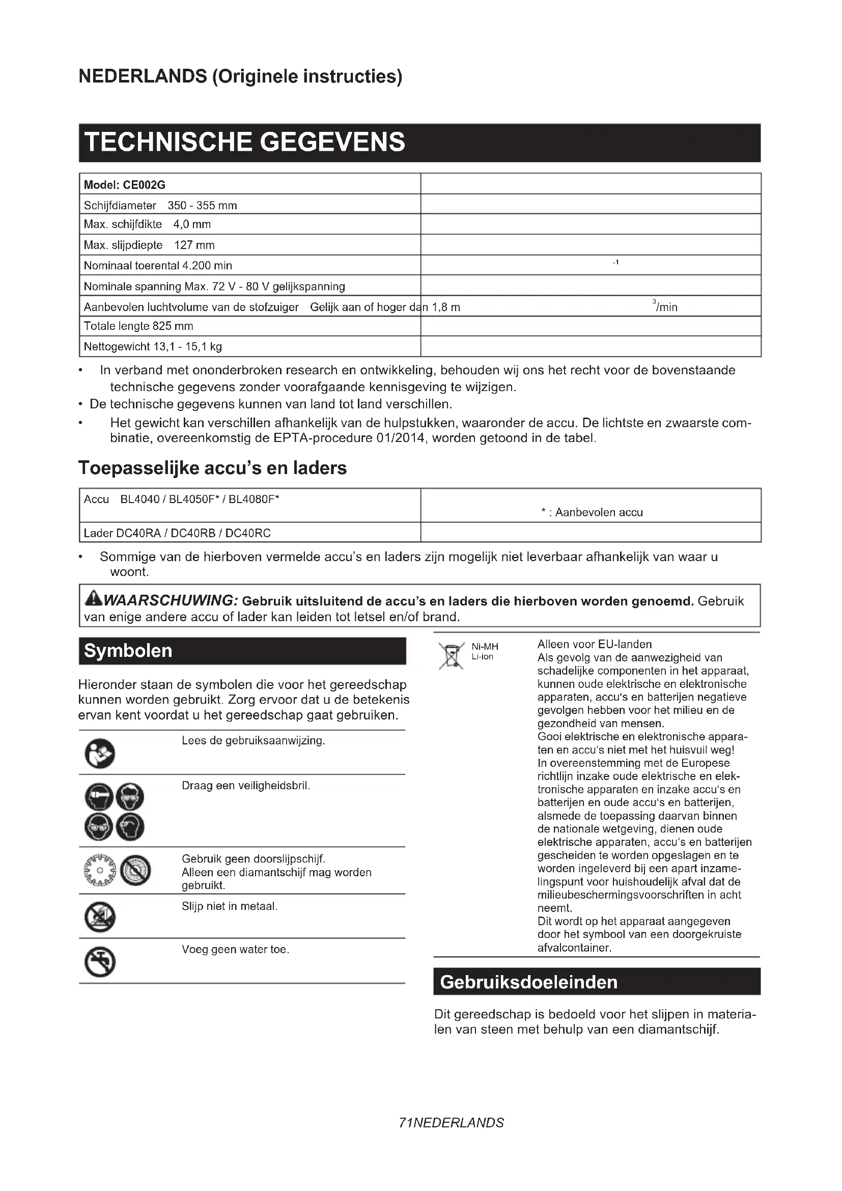 - Sommigevandehierbovenvermeldeaccu’senladerszijnmogelijknietleverbaarafhankelijkvanwaaru woont. WAARSCHUWING: Gebruik uitsluitend de accu’s en laders die hierboven worden genoemd.Gebruik vanenigeandereaccuofladerkanleidentotletselen/ofbrand. Symbolen Hieronderstaandesymbolendievoorhetgereedschap kunnenwordengebruikt.Zorgervoordatudebetekenis ervankentvoordatuhetgereedschapgaatgebruiken. Leesdegebruiksaanwijzing. Draageenveiligheidsbril. Gebruikgeendoorslijpschijf. Alleeneendiamantschijfmagworden gebruikt. Slijpnietinmetaal. Voeg geen water toe. Ni-MH Li-ion AlleenvoorEU-landen Alsgevolgvandeaanwezigheidvan schadelijkecomponenteninhetapparaat, kunnen oude elektrische en elektronische apparaten,accu‘senbatterijennegatieve gevolgenhebbenvoorhetmilieuende gezondheid van mensen. Gooi elektrische en elektronische appara- ten en accu‘s niet met het huisvuil weg! In overeenstemming met de Europese richtlijninzakeoudeelektrischeenelek- tronische apparaten en inzake accu‘s en batterijenenoudeaccu‘senbatterijen, alsmededetoepassingdaarvanbinnen de nationale wetgeving, dienen oude elektrischeapparaten,accu‘senbatterijen gescheiden te worden opgeslagen en te wordeningeleverdbijeenapartinzame- lingspuntvoorhuishoudelijkafvaldatde milieubeschermingsvoorschrifteninacht neemt. Dit wordt op het apparaat aangegeven doorhetsymboolvaneendoorgekruiste afvalcontainer. Gebruiksdoeleinden Ditgereedschapisbedoeldvoorhetslijpeninmateria- lenvansteenmetbehulpvaneendiamantschijf.72 NEDERLANDS Geluidsniveau Detypische,A-gewogengeluidsniveauszijngemetenvolgensEN60745-2-22: Geluidsdrukniveau(L