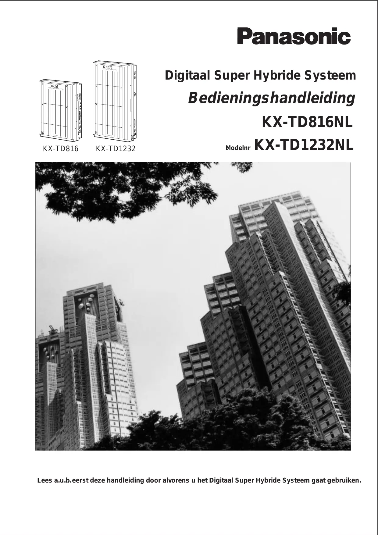 KX-TD816 Panasonic KX-TD1232 KX-TD816NL Modelnr KX-TD1232NL Lees a.u.b.eerst deze handleiding door alvorens u het Digitaal Super Hybride Systeem gaat gebruiken. Hartelijk dank voor de aanschaf van het Panasonic Digitaal Super Hybride Systeem. Telefoontoestellen Parallelle Aansluiting Dit systeem kan digitale en analoge systeemtoestellen van Panasonic aansluiten. Standaardtoestellen zoals een enkelvoudig toestel, fax, draadloze telefoon, Voice Processing Systeem, enz., kunnen ook worden aangesloten. Dit systeem kan de aansluitcapaciteit verdubbelen door een systeemtoestel en een enkelvoudig toestel aan te sluiten. De systeemtoestel kan de aansluiting delen met een ander enkelvoudig toestel. Bovendien kunt u een Panasonic digitaal systeemtoestel en een enkelvoudig toestel digitaal aansluiten en deze gebruiken als aparte toestellen. D1232