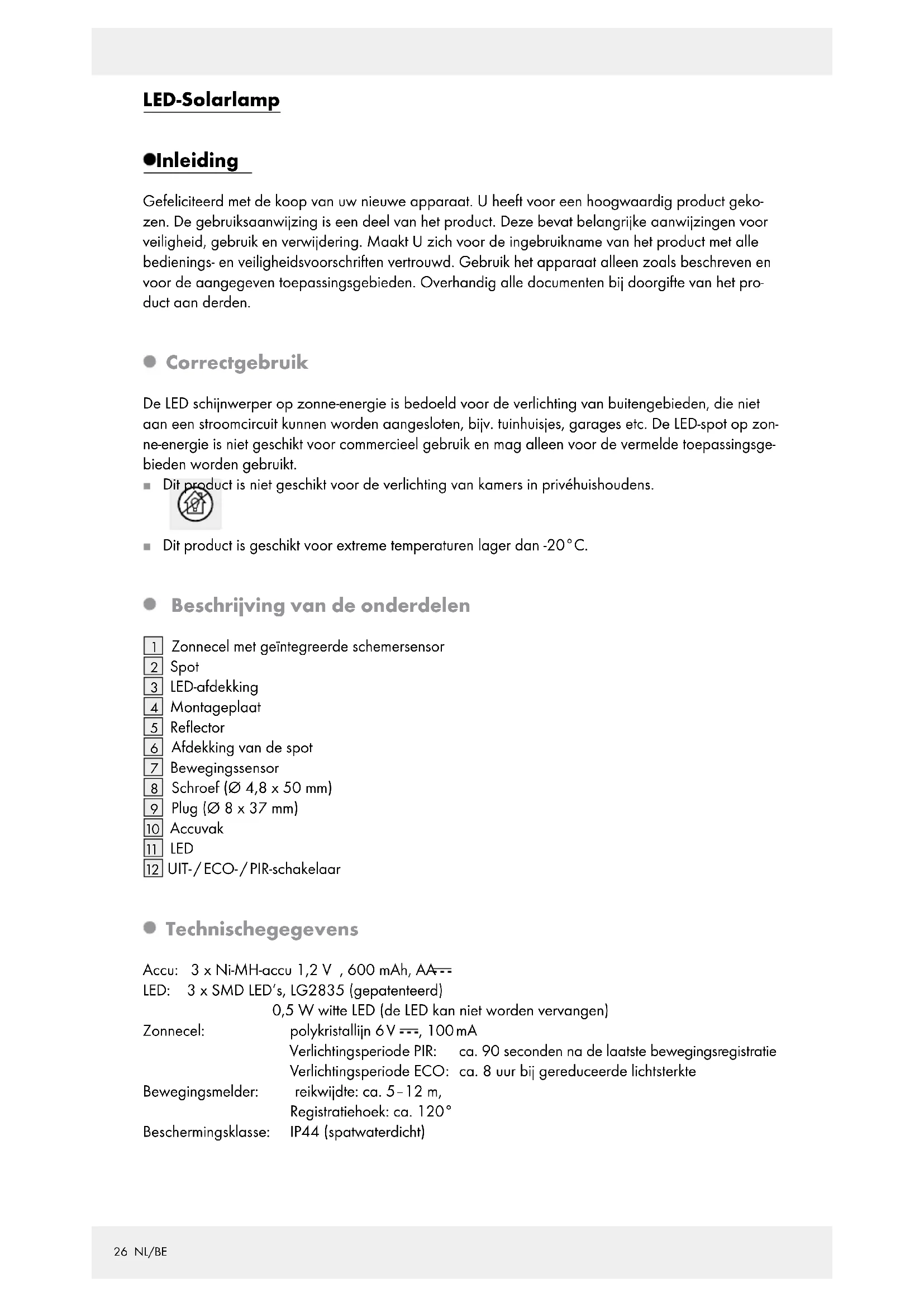 UIT- / ECO- / PIR-schakelaar Technische gegevens Accu: 3 x Ni-MH-accu 1,2 V , 600 mAh, AA LED: 3 x SMD LED‘s, LG2835 (gepatenteerd) 0,5 W witte LED (de LED kan niet worden vervangen) Zonnecel: polykristallijn 6 V , 100 mA Verlichtingsperiode PIR: ca. 90 seconden na de laatste bewegingsregistratie Verlichtingsperiode ECO: ca. 8 uur bij gereduceerde lichtsterkte Bewegingsmelder: reikwijdte: ca. 5–12 m, Registratiehoek: ca. 120° Beschermingsklasse: IP44 (spatwaterdicht)27 NL/BE Omvang van de levering 1 LED-solarlamp 2 schroeven (Ø 4,8 x 50 mm) 2 pluggen (Ø 8 x 37 mm) 1 montage- en gebruiksaanwijzing Algemene veiligheidsinstructies Maak u voor de eerste ingebruikname van het product vertrouwd met alle bedienings- en veiligheids- instructies! Overhandig ook alle documenten als u het product aan derden overhandigt! Dit apparaat kan door kinderen vanaf 8 alsook personen met verminderde psychische, sensorische of mentale vaardigheden of een gebrek aan ervaring en / of kennis worden gebruikt, als zij on- der toezicht staan of geïnstrueerd werden met betrekking tot het veilige gebruik van het apparaat en de hieruit voortvloeiende gevaren begrijpen. Kinderen mogen niet met het apparaat spelen. Reiniging en gebruikersonderhoud mogen niet door kinderen zonder toezicht worden uitgevoerd. Laat kinderen nooit zonder toezicht bij het verpakkingsmateriaal. Er bestaat verstikkingsgevaar door het verpakkingsmateriaal. Kinderen onderschatten vaak de gevaren. Houd kinderen tijdens de montage uit de buurt van de montageplek. Tot de levering behoren tal van schroeven en andere kleine voorwerpen. Deze kunnen bij het inslikken of inademen levens- gevaarlijk zijn. Gebruik het product niet, als u een beschadiging constateert! Veiligheidsinstructies voor de accu‘s LEVENSGEVAAR! Houd accu‘s uit de buurt van kinderen. Raadpleeg in geval van inslikken direct een arts! WEES VOORZICHTIG! EXPLOSIEGEVAAR! Gooi accu‘s nooit in vuur of water! Stel accu‘s nooit bloot aan mechanische belastingen! Gebruik geen niet-oplaadbare accu‘s. Sluit de accu‘s niet kort en / of open ze niet. Gevaar voor materiële schade Gebruik uitsluitend het vermelde accutype! Let bij het plaatsen van de batterijen op de juiste polariteit! Deze staat in het accuvak
