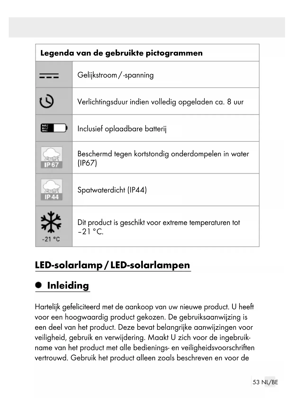 KINDEREN! Houd batterijen uit de buurt van kinderen. Laat de batterijen niet rondslingeren. Het gevaar bestaat dat deze door kinderen of huis- dieren worden ingeslikt. Raadpleeg bij inslikken onmiddellijk een arts. Kinderen of personen met onvoldoende kennis van en ervaring met de omgang met het product of met beperkte lichamelijke, sensorische of geestelijke vaardigheden mogen het product niet zonder toezicht of voorafgaande instructie door een voor hun veiligheid verant- woordelijke persoon gebruiken. Kinderen moeten in de gaten worden gehouden om te voorkomen dat ze met het product spelen. Laat kinderen nooit zonder toezicht bij het verpakkingsmateriaal. Er bestaat verstikkingsgevaar door het verpakkingsmateriaal. Kinderen onderschatten vaak de gevaren. Houd kinderen altijd uit de buurt van het product. Dit product is geen speelgoed, het hoort niet thuis in kinderhanden. Kinderen zien de gevaren niet die door de omgang met elektrische producten ontstaan. Gebruik het product niet als u beschadigingen constateert. De leds kunnen niet worden vervangen. Mochten de leds aan het einde van hun levensduur uitvallen dan dient het gehele product te worden vervangen. GEVAAR EXPLOSIEGEVAAR! Gebruik het pro- duct niet in explosieve omgevingen waarin zich brand- bare dampen, gassen of stoffen bevinden. Productspecifieke veiligheidsinstructies Stel het product niet bloot aan sterke trillingen of sterke mechanische belastingen.57 NL/BE Let erop dat de lampenkap niet vuil wordt of in de winter met sneeuw en ijs bedekt is. Dit vermindert de prestaties van de zonnemodule
