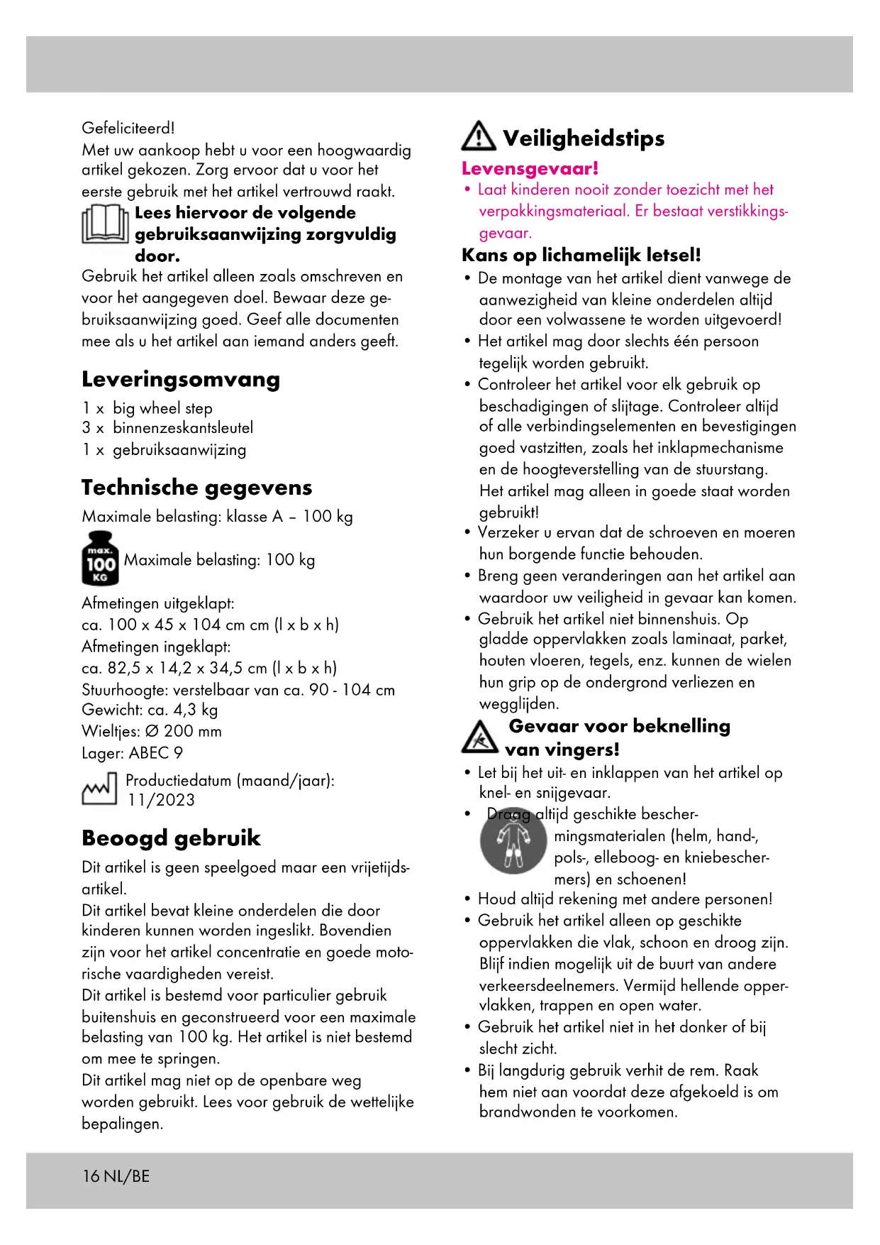 het gedeelte “Wieltjes vervangen”. Opslag, reiniging Het wordt aanbevolen het artikel na gebruik grondig te reinigen en te drogen. Verwijder kleine steentjes of andere voorwerpen die door gebruik aan de wieltjes zijn blijven han- gen. Droog natte of vochtige kogellagers af met een schone doek. Vet de lagers aan de buiten- kant met een hiertoe geschikt smeermiddel in om roestvorming aan de buitenkant te voorkomen. Bewaar het artikel altijd op een droge plaats. Afvalverwerking Voer het artikel en de verpakkingsmateri- alen af in overeenstemming met de actuele lokale voorschriften. Berg verpakkingsmaterialen (zoals bv. foliezakjes) op buiten het bereik van kinderen. Bijkomende informatie over de afvoer van het onbruikbaar geworden artikel krijgt u bij uw gemeente- of stadsbestuur. Voer het artikel en de verpakking milieuvriendelijk af. De recyclingcode dient om verschillende materialen voor recyclingdoeleinden te kenmerken. De code bestaat uit een recyclingsymbool voor de recyclingcyclus en een nummer dat het materiaal kenmerkt. Opmerkingen over garantie en serviceafhandeling Het artikel werd met de grootste zorgvuldigheid en onder permanent toezicht geproduceerd. De firma DELTA-SPORT HANDELSKONTOR GmbH verleent particuliere eindklanten op dit artikel drie jaar garantie, te rekenen vanaf de datum van aankoop (garantietermijn) en dit op grond van de volgende bepalingen. De garantie geldt alleen voor materiaal- en verwerkingsfouten. De garantie is niet van toepassing op onderde- len die aan een normale slijtage onderhevig zijn en daarom als niet-slijtvaste onderdelen te beschouwen zijn (bv. batterijen) en evenmin op breekbare onderdelen, bv. schakelaars, accu’s of onderdelen die van glas gemaakt zijn.19 Uit de garantie voortvloeiende claims zijn uitgeslo- ten als het artikel onvakkundig, verkeerd of niet in het kader van de voorziene bepaling of in het ka- der van het voorziene gebruiksdoeleinde gebruikt werd of indien richtlijnen in de gebruiksaanwijzing niet in acht genomen werden, tenzij de eindklant aantoont dat er sprake is van een materiaal- of verwerkingsfout die niet op één van de hoger vermelde omstandigheden gebaseerd is. Uit de garantie voortvloeiende claims kunnen alleen tijdens de garantieperiode op vertoon van de originele kassabon ingediend wor- den. Gelieve daarom de originele kassabon te bewaren. De garantieperiode wordt door eventuele reparaties op grond van de garantie, wettelijke waarborg of coulance niet verlengd. Dit geldt ook voor vervangen en gerepareerde onderdelen. Gelieve u bij klachten in eerste instantie tot de hieronder vermelde servicehotline te richten of met ons per e-mail contact op te nemen. Is er sprake van een garantiegeval, dan wordt het ar- tikel door ons – naar onze keuze – voor u gratis gerepareerd, wordt het vervangen of wordt de aankoopsom terugbetaald. Verdere rechten op grond van de garantie bestaan niet. Uw wettelijke rechten, in het bijzonder rechten op garantie tegenover de betreffende verkoper, worden door deze garantie niet beperkt. IAN: 437057_2304 Service België Tel.: 0800 12089 E-Mail: deltasport@lidl.be Service Nederland Tel.: 0800 0249630 E-Mail: deltasport@lidl.nl NL/BE20 PL Gratulujemy! Decydując się na ten produkt, otrzymują Pań- stwo towar wysokiej jakości. Należy zapoznać się z produktem przed jego pierwszym użyciem. Należy uważnie przeczytać następującą instrukcję użytkowania. Produkt ten należy użytkować wyłącznie w opisany sposób oraz zgodnie ze wskazanym przeznaczeniem. Niniejszą instrukcję użytko- wania należy przechowywać w bezpiecznym miejscu. Przekazując produkt innej osobie, należy upewnić się, że otrzyma ona także całą dokumentację dotyczącą produktu. Zakres dostawy 1 x hulajnoga bigwheel 3 x klucz sześciokątny 1 x instrukcja użytkowania Dane techniczne Maksymalne obciążenie: klasa A – 100 kg Maksymalne obciążenie: 100 kg Wymiary po rozłożeniu: ok. 100 x 45 x 104 cm (dł. x szer. x wys.) Wymiary po złożeniu: ok. 82,5 x 14,2 x 34,5 cm (dł. x szer. x wys.) Wysokość kierownicy: regulowana ok. 90–104 cm Waga: ok. 4,3 kg Kółka: Ø 200 mm Łożysko: ABEC 9 Data produkcji (miesiąc/rok): 11/2023 Użytkowanie zgodne z przeznaczeniem Niniejszy produkt nie jest zabawką, ale produk- tem rekreacyjnym. Produkt zawiera drobne elementy, które mogą zostać połknięte przez dzieci, a jego użytkowa- nie wymaga koncentracji i dobrych umiejętności motorycznych. Niniejszy produkt jest przeznaczony do użytku prywatnego na zewnątrz przy maksymalnym obciążeniu wynoszącym 100 kg. Produkt ten nie jest przeznaczony do wykonywania akro- bacji. Niniejszy produkt nie może być używany na drogach publicznych. Przed rozpoczęciem użytkowania należy zapoznać się z obowiązu- jącymi przepisami. Wskazówki bezpieczeństwa Śmiertelne niebezpieczeństwo!