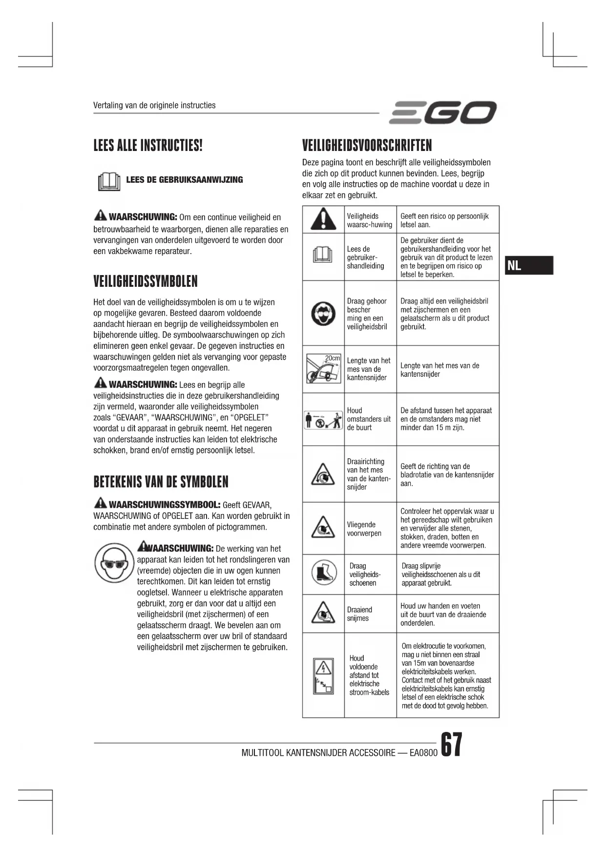 WAARSCHUWINGSSYMBOOL: Geeft GEVAAR, WAARSCHUWING of OPGELET aan. Kan worden gebruikt in combinatie met andere symbolen of pictogrammen. WAARSCHUWING: De werking van het apparaat kan leiden tot het rondslingeren van (vreemde) objecten die in uw ogen kunnen terechtkomen. Dit kan leiden tot ernstig oogletsel. Wanneer u elektrische apparaten gebruikt, zorg er dan voor dat u altijd een veiligheidsbril (met zijschermen) of een gelaatsscherm draagt. We bevelen aan om een gelaatsscherm over uw bril of standaard veiligheidsbril met zijschermen te gebruiken. VEILIGHEIDSVOORSCHRIFTEN Deze pagina toont en beschrijft alle veiligheidssymbolen die zich op dit product kunnen bevinden. Lees, begrijp en volg alle instructies op de machine voordat u deze in elkaar zet en gebruikt. Veiligheids waarsc-huwingGeeft een risico op persoonlijk letsel aan.Lees de gebruiker-shandleidingDe gebruiker dient de gebruikershandleiding voor het gebruik van dit product te lezen en te begrijpen om risico op letsel te beperken.Draag gehoor bescher ming en een veiligheidsbrilDraag altijd een veiligheidsbril met zijschermen en een gelaatscherm als u dit product gebruikt. 20cm Lengte van het mes van de kantensnijderLengte van het mes van de kantensnijder 15m Houd omstanders uit de buurtDe afstand tussen het apparaat en de omstanders mag niet minder dan 15 m zijn.Draairichting van het mes van de kanten-snijderGeeft de richting van de bladrotatie van de kantensnijder aan. Vliegende voorwerpenControleer het oppervlak waar u het gereedschap wilt gebruiken en verwijder alle stenen, stokken, draden, botten en andere vreemde voorwerpen.Draag veiligheids-schoenenDraag slipvrije veiligheidsschoenen als u dit apparaat gebruikt.Draaiend snijmesHoud uw handen en voeten uit de buurt van de draaiende onderdelen.Houd voldoende afstand tot elektrische stroom-kabelsOm elektrocutie te voorkomen, mag u niet binnen een straal van 15m van bovenaardse elektriciteitskabels werken. Contact met of het gebruik naast elektriciteitskabels kan ernstig letsel of een elektrische schok met de dood tot gevolg hebben. Vertaling van de originele instructiesMULTITOOL KANTENSNIJDER ACCESSOIRE — EA080068