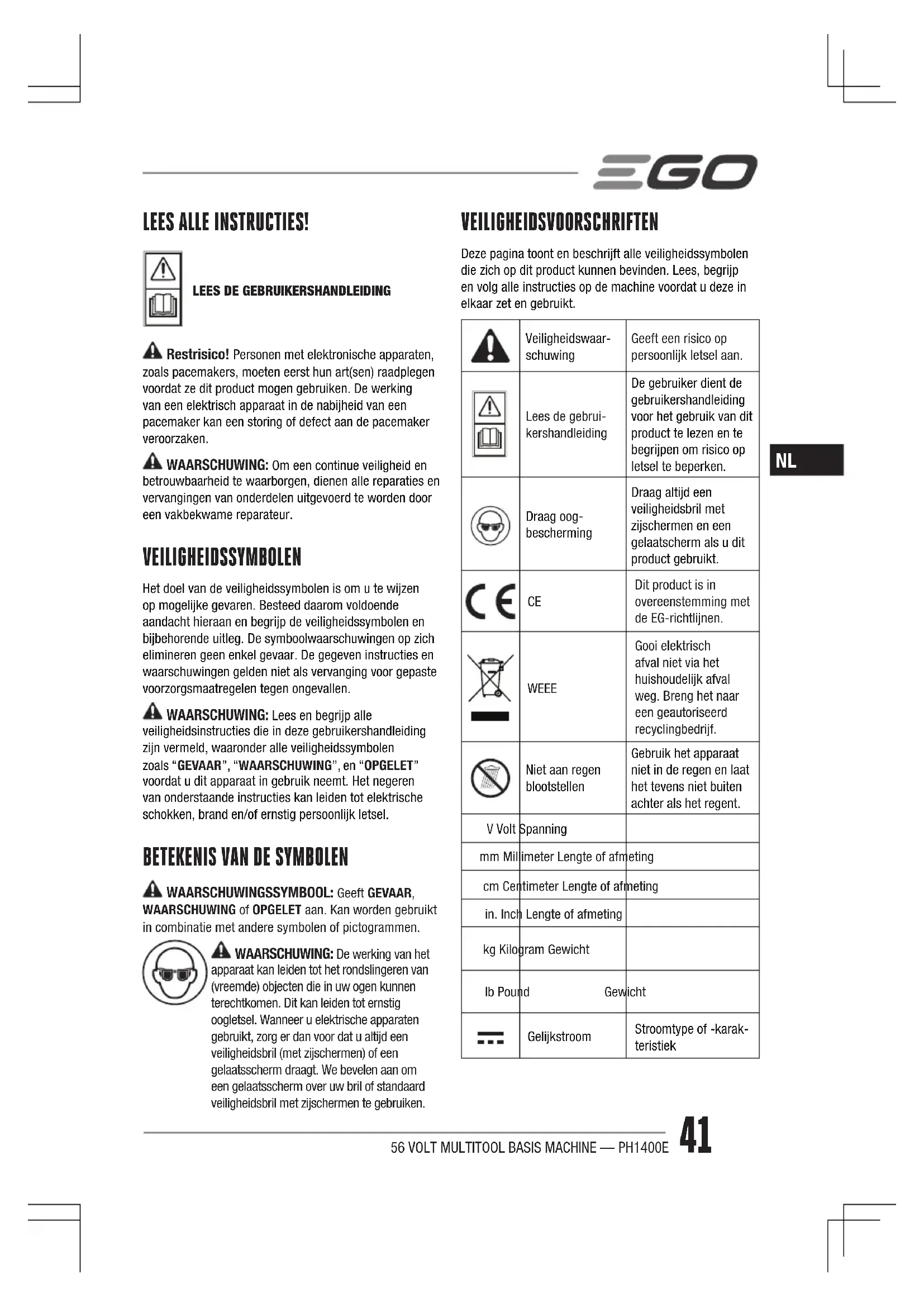 Dit product is in overeenstemming met de EG-richtlijnen. WEEE Gooi elektrisch afval niet via het huishoudelijk afval weg. Breng het naar een geautoriseerd recyclingbedrijf. Niet aan regen blootstellen Gebruik het apparaat niet in de regen en laat het tevens niet buiten achter als het regent. V Volt Spanning mm Millimeter Lengte of afmeting cm Centimeter Lengte of afmeting in. Inch Lengte of afmeting kg Kilogram Gewicht lb Pound Gewicht Gelijkstroom Stroomtype of -karak- teristiek56 VOLT MULTITOOL BASIS MACHINE — PH1400E 42