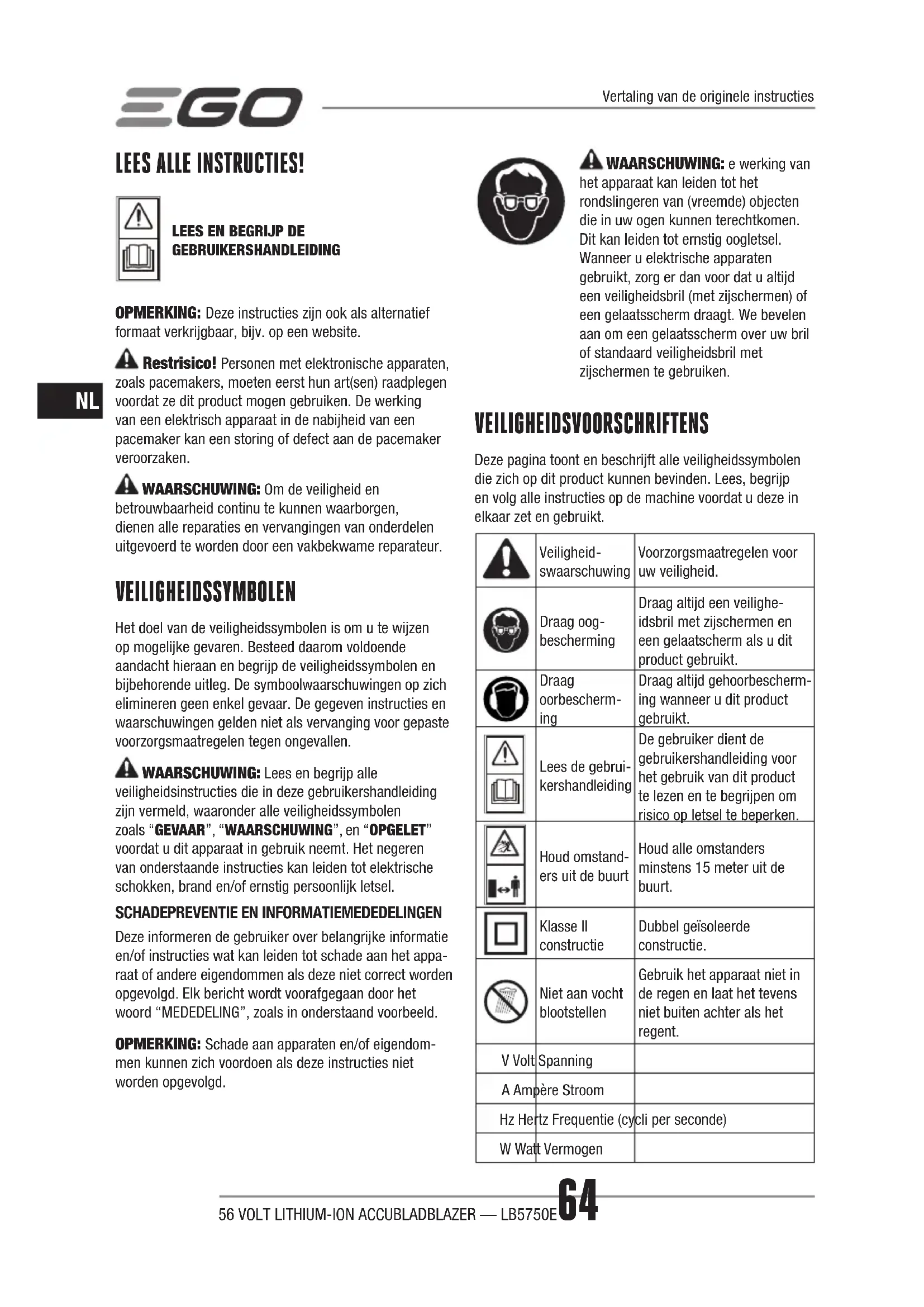 Deze informeren de gebruiker over belangrijke informatie en/of instructies wat kan leiden tot schade aan het appa-raat of andere eigendommen als deze niet correct worden opgevolgd. Elk bericht wordt voorafgegaan door het woord “MEDEDELING”, zoals in onderstaand voorbeeld. OPMERKING: Schade aan apparaten en/of eigendom- men kunnen zich voordoen als deze instructies niet worden opgevolgd. WAARSCHUWING: e werking van het apparaat kan leiden tot het rondslingeren van (vreemde) objecten die in uw ogen kunnen terechtkomen. Dit kan leiden tot ernstig oogletsel. Wanneer u elektrische apparaten gebruikt, zorg er dan voor dat u altijd een veiligheidsbril (met zijschermen) of een gelaatsscherm draagt. We bevelen aan om een gelaatsscherm over uw bril of standaard veiligheidsbril met zijschermen te gebruiken. VEILIGHEIDSVOORSCHRIFTENS Deze pagina toont en beschrijft alle veiligheidssymbolen die zich op dit product kunnen bevinden. Lees, begrijp en volg alle instructies op de machine voordat u deze in elkaar zet en gebruikt.Veiligheid-swaarschuwingVoorzorgsmaatregelen voor uw veiligheid.Draag oog-beschermingDraag altijd een veilighe-idsbril met zijschermen en een gelaatscherm als u dit product gebruikt.Draag oorbescherm- ing Draag altijd gehoorbescherm-ing wanneer u dit product gebruikt. Lees de gebrui-kershandleidingDe gebruiker dient de gebruikershandleiding voor het gebruik van dit product te lezen en te begrijpen om risico op letsel te beperken.Houd omstand-ers uit de buurtHoud alle omstanders minstens 15 meter uit de buurt.Klasse II constructieDubbel geïsoleerde constructie.Niet aan vocht blootstellenGebruik het apparaat niet in de regen en laat het tevens niet buiten achter als het regent.V Volt SpanningA Ampère StroomHz Hertz Frequentie (cycli per seconde)W Watt VermogenVertaling van de originele instructies56 VOLT LITHIUM-ION ACCUBLADBLAZER — LB5750E