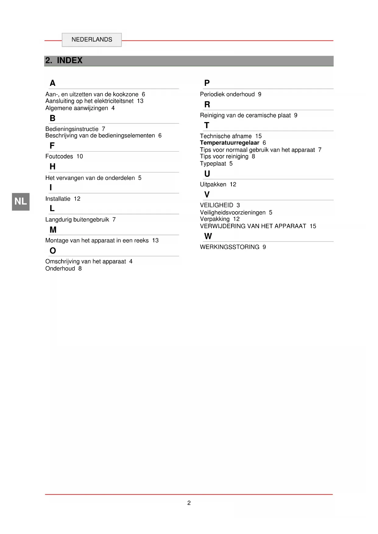temperatuur: Dit is een apparaat dat de kookzone deactiveert als de temperatuur te hoog is. Als de temperatuur verlaagd tot onder de alarmgrens, dan gaat het apparaat automatisch aan. Controleer elke dag de veiligheidsthermostaten op juiste montage en correcte werking.